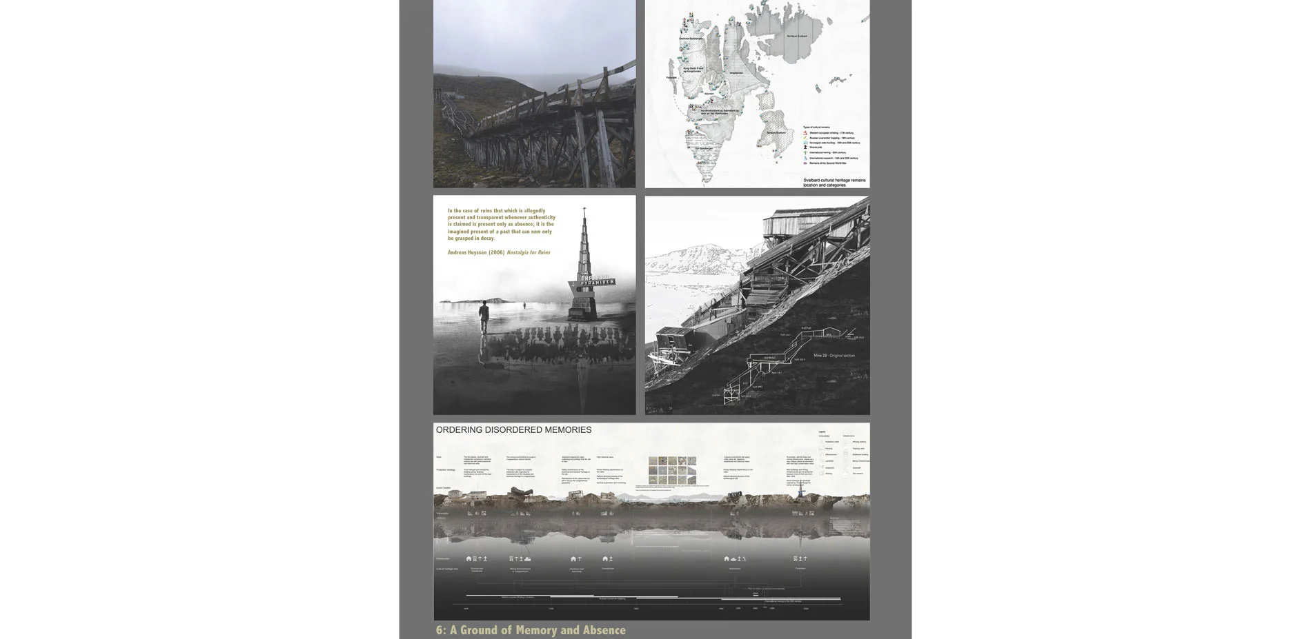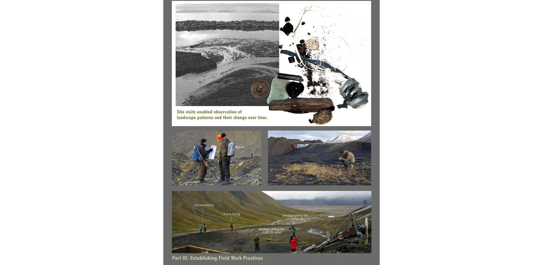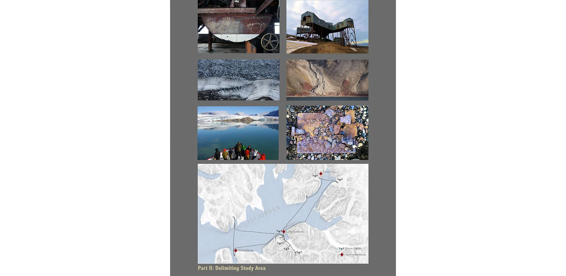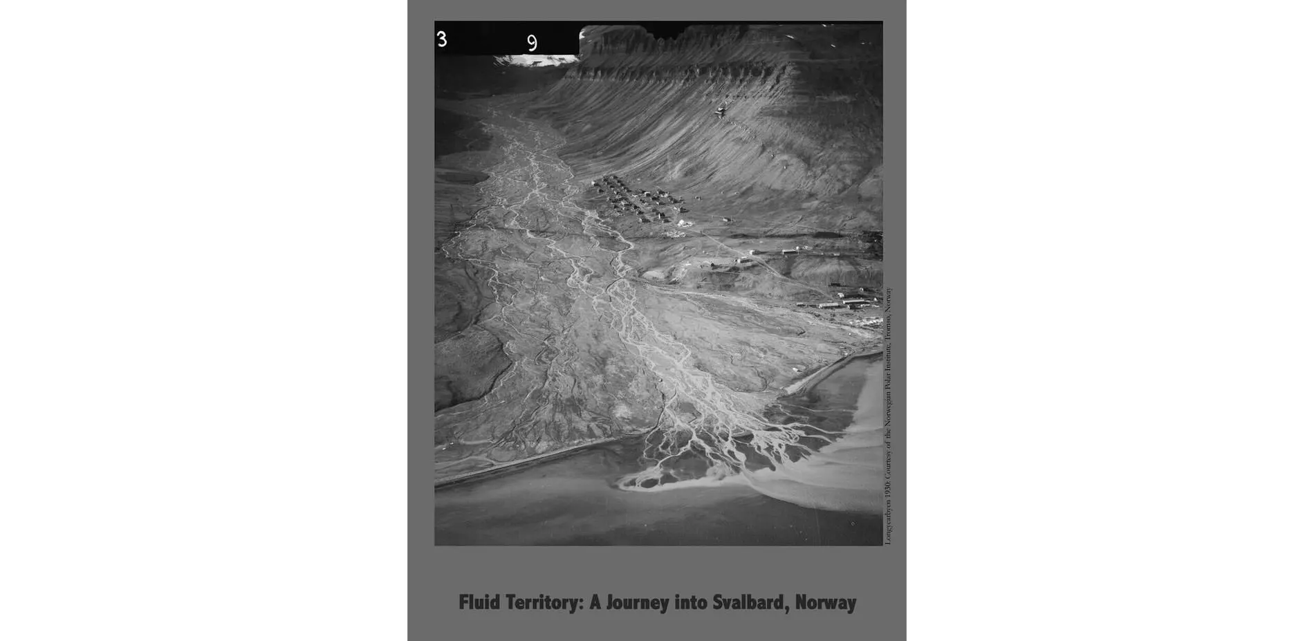 “Fluid Territory: A Journey into Svalbard” includes the following research methods: a GIS topographic study that chronologically traces the fluid interface between land, water and climate; immersive experiences and situated impressions gathered during site visits; photographic documentation of the material qualities of place; a survey of the scientific literature and its quantitative descriptions of the biophysical terrain; a qualitative survey of the territory that draws upon memory, oral history, art and literature; historiographical archival research; and an epistemological study of research terminology.