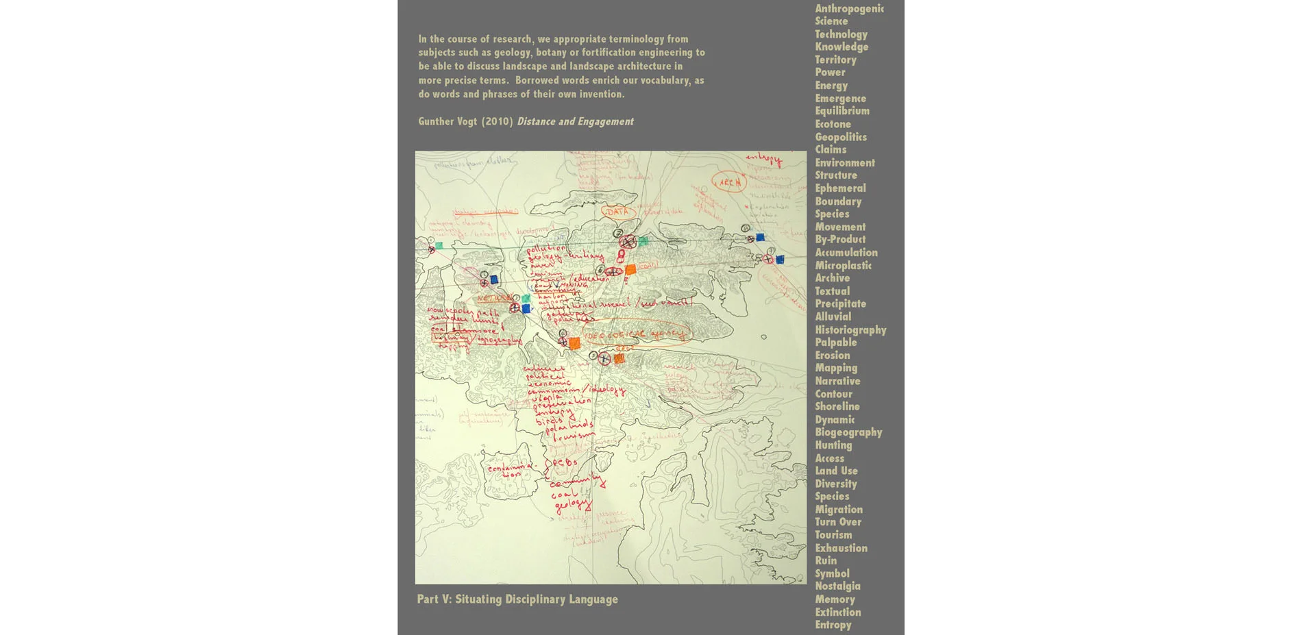One of the most intriguing aspects of the work is the dialogue between the panoptic cartographies delineated in plan and the environmental datascapes delineated in section, and the different ways they code the landscape. The plans deploy defined measurements and succinct labels to illustrate territorial dynamics. The sections elucidate a more imaginative terrain that charts unexpected linkages between objects, ideas, assembly, space and chronology. Although both operations document location, ownership, morphology and change over time—the visual language of the plans tends toward grammatical convention and proper punctuation, while the visual language of section favours textual deconstruction and exploratory reading. When these two methods of documentation are synergistically combined, novel narratives emerge.