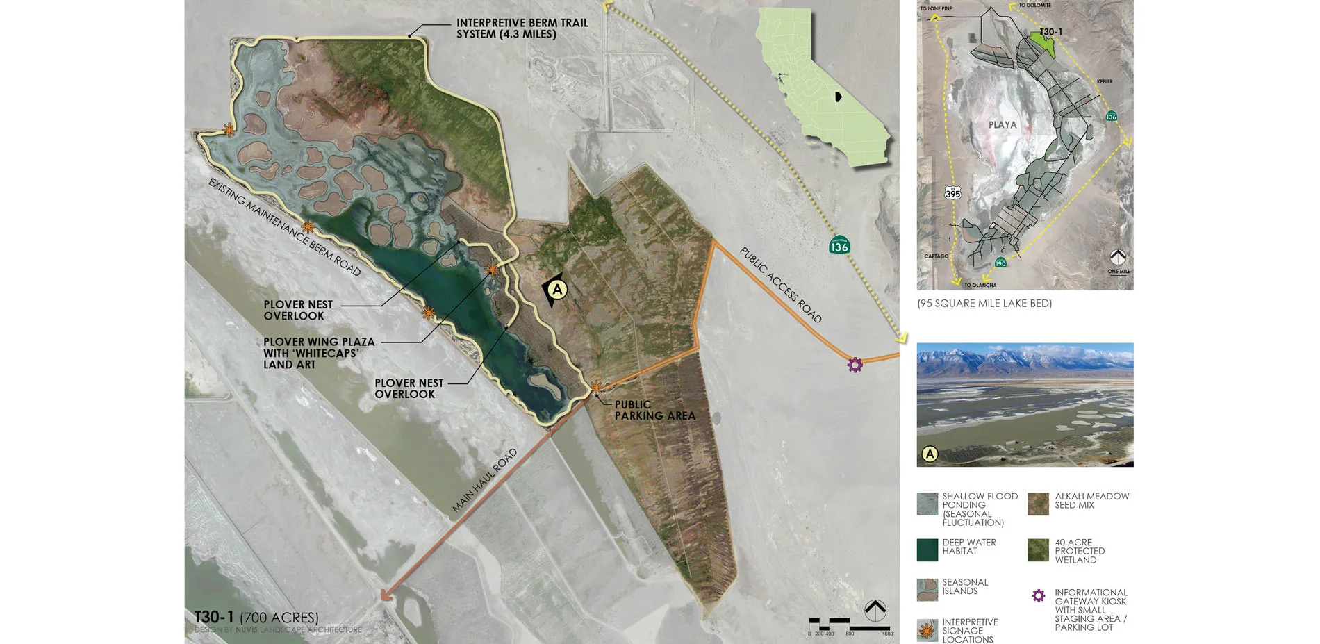 Owens Lake Land Art project (located on a 700-acre parcel named T30) began with a mandate from California State Lands to the Los Angeles Department of Water and Power (LADWP) to meet the following goals: provide public access and hiking trails, create bird and mammal habitat, and preserve cultural resources while still meeting the strict dust emission controls. The landscape architect, adhering to the approved yet limited dust mitigation palette (shallow flood, gravel cover, and managed vegetation where soil conditions allow), designed a solution which evolved into a land art project named the ‘Whitecaps’. The project did not start out as an art commission yet the design developed into a spiritual composition of simple materials and forms inspired by the Owens Valley.