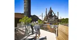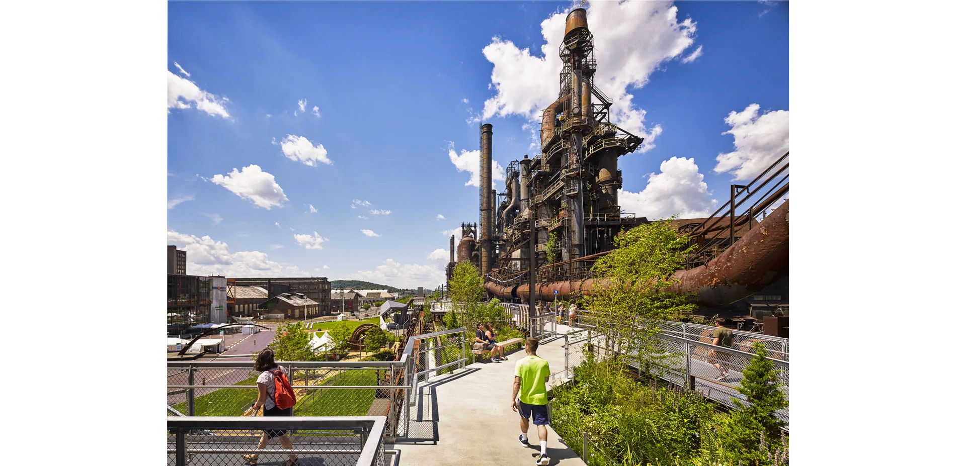 The Hoover-Mason Trestle structure was designed to tread-lightly over the existing structure. All new surfaces and planters are supported by a new steel structure that attaches at the location of the existing rail tracks, and the new structural steel was designed in weathering steel to blend with the existing SteelStacks, and allow the walkways to visually float above the structure, as a clearly identifiable new structure, juxtaposing new and old. Respecting the linearity of the rail tracks, metal-grating walkways run parallel immediately above the tracks, encouraging people to look down and acknowledge the existing site.