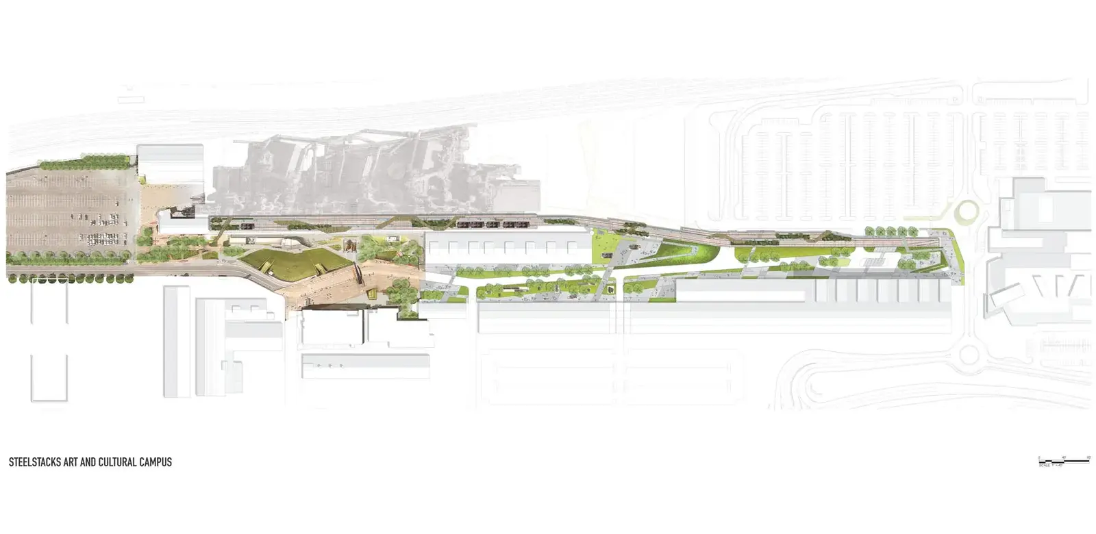 The 9.5 acre SteelStacks Arts + Cultural Campus is located directly in front of the monumental blast furnaces that have dominated the Bethlehem skyline for more than a century. The Campus sits within Bethlehem Works, a 126-acre parcel that was established as a 20-year tax incremental finance district (TIF) in 2000. Bethlehem Works is part of the largest brownfield in the U.S.: the 1,800-acre former steel plant operated by Bethlehem Steel Corp, which occupies 20 percent of the City of Bethlehem’s real estate (city population: 75,000).