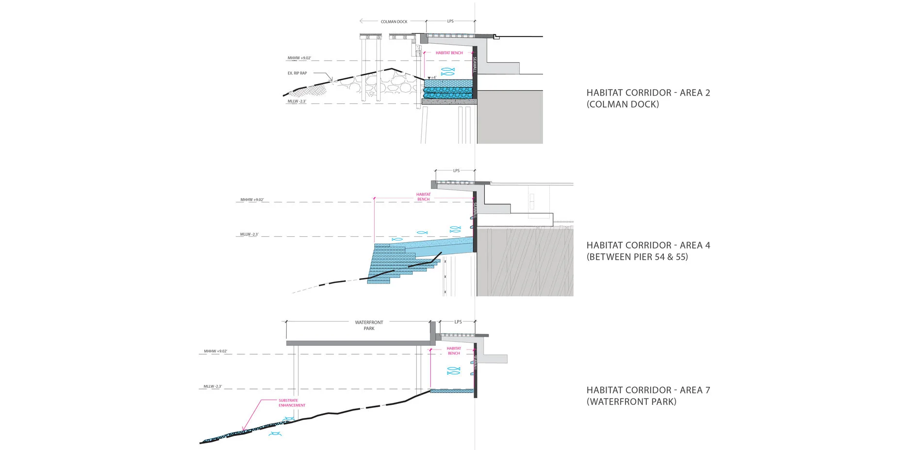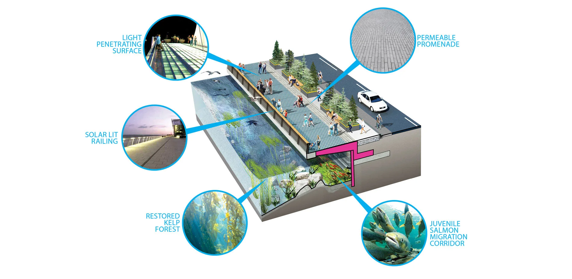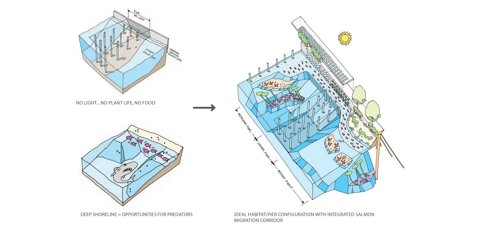 When Seattle’s waterfront was urbanized, many aspects of the area’s native intertidal habitat were lost, including sloping beaches, crevices, and vegetated hiding places for not only salmon, but other fish and marine creatures. Over the decades, 90% of Seattle’s central waterfront shoreline had become covered by piers and other overwater structures, creating an underwater environment of dark, steep canyons that were nearly impossible for juvenile salmon to navigate. Salmon are integral to the identity and economy of Seattle and the Pacific Northwest, with critical importance to the environment, tribal traditions and livelihood, local and national industry, residents, and tourism, and the decline in salmon population was of deep concern to many stakeholders.