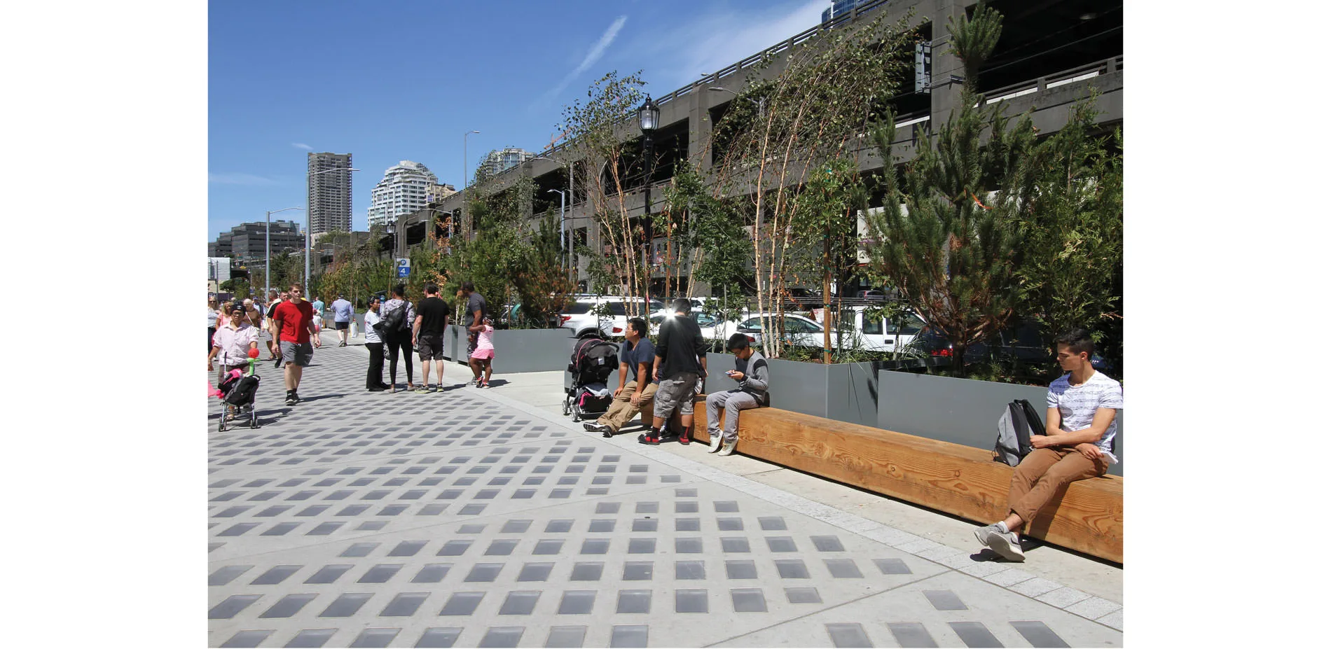 The CPS’s pedestrian promenade features the LPS panels, which are part of the sidewalk, as well as cast-in-place concrete, above-grade planters with native and climate-appropriate species, wide benches made from reclaimed ship timbers, and a vehicular crash-rated custom-designed railing. The LPS panels will remain in place, with their pattern corresponding to the future Waterfront Promenade’s layout. The planters and benches are temporary and will be repurposed into the greater Waterfront Promenade once the Alaskan Way Viaduct is demolished and construction begins on the final implementation of the Central Waterfront.