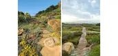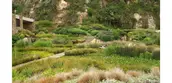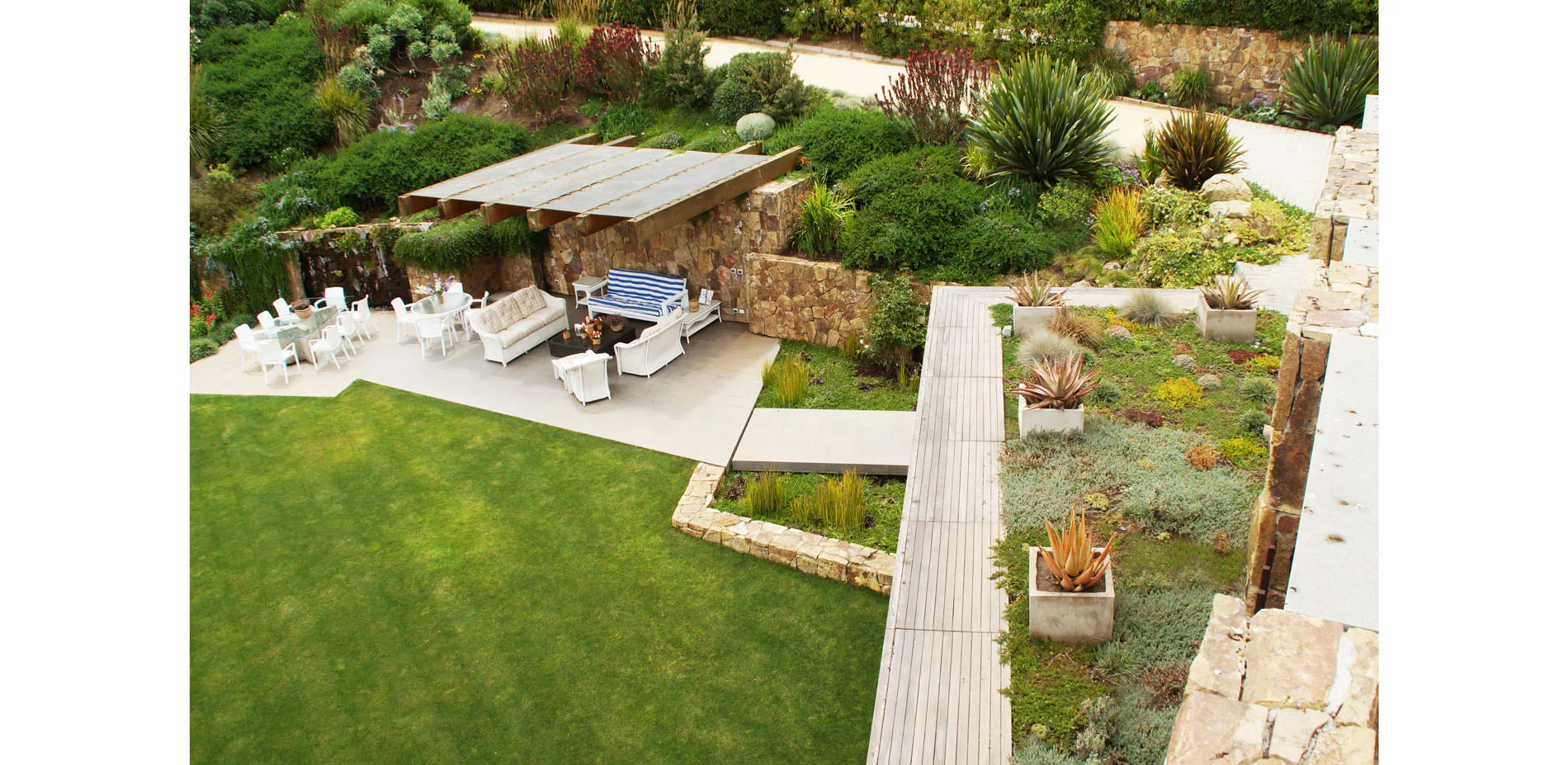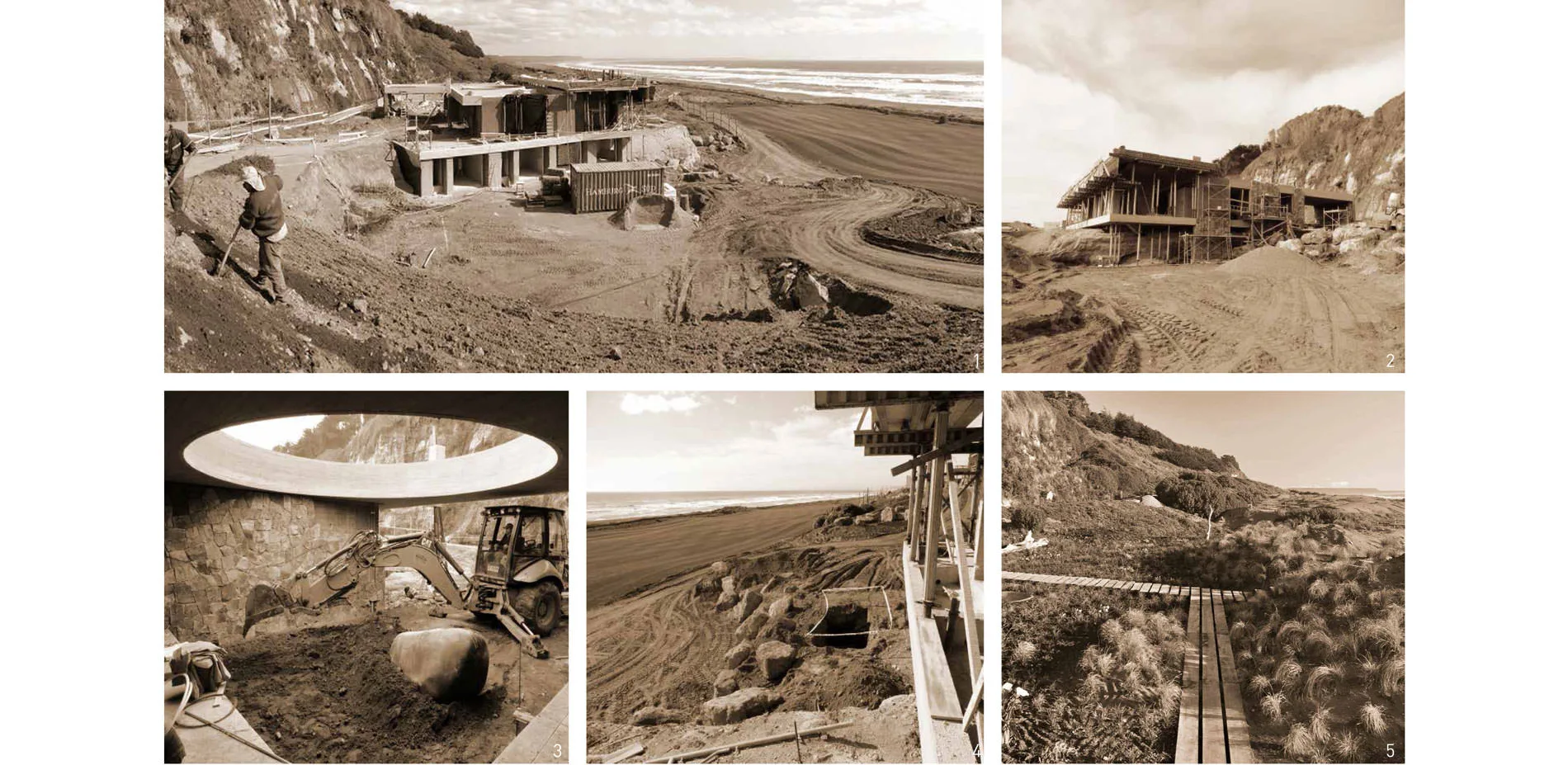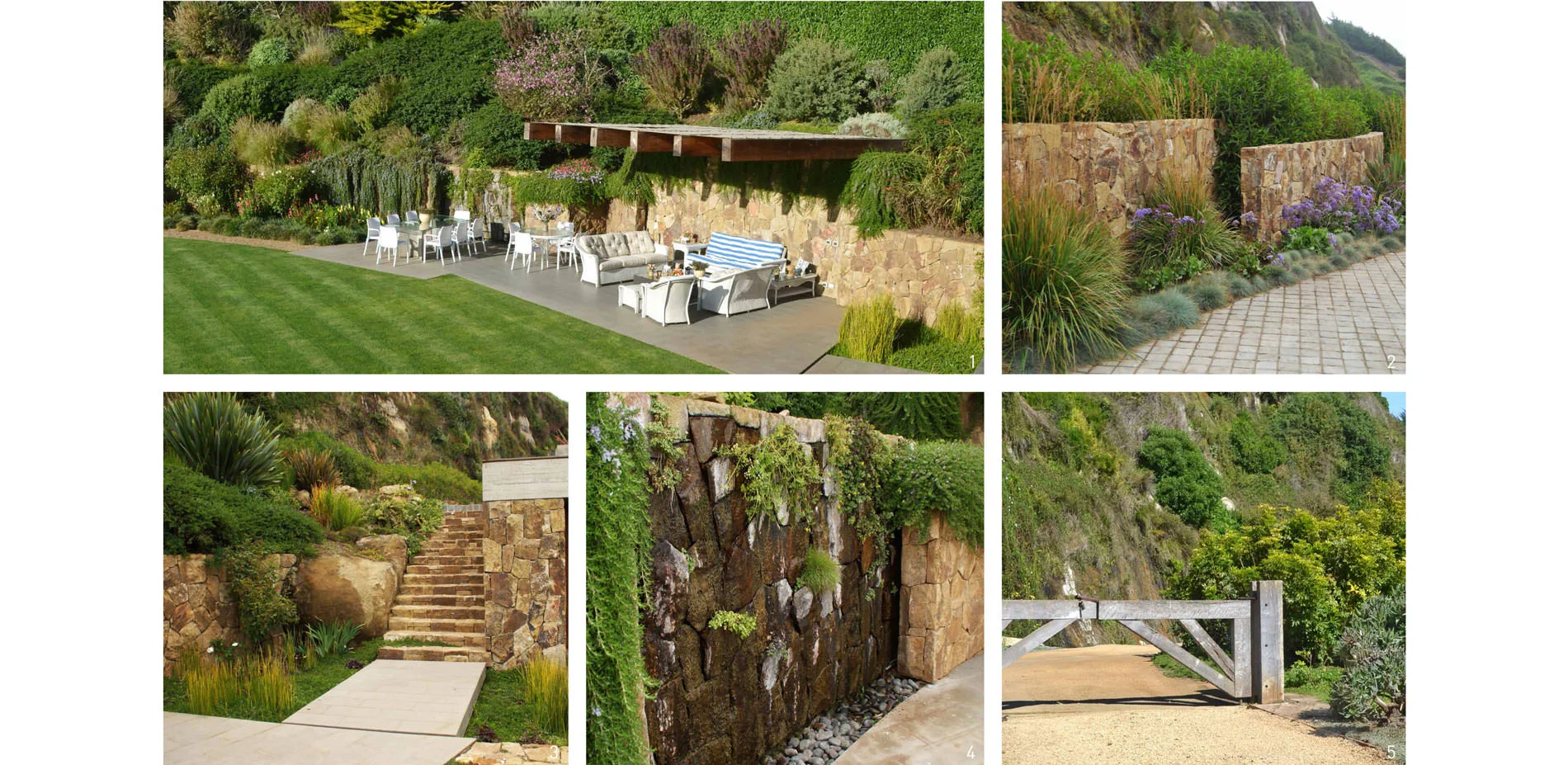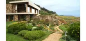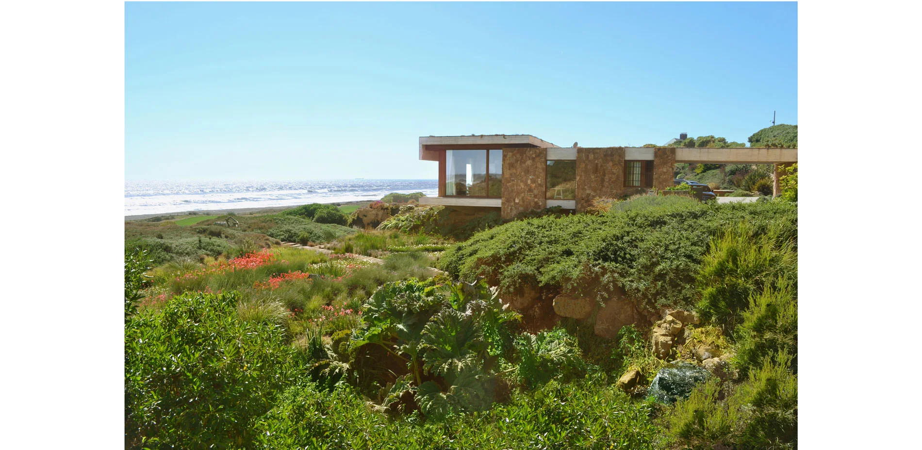 A strong earthquake buckled a weary section of the sea cliff several hundred meters south of the home site. Its collapse covered a portion of a small wetland at the bottom of the cliff face and consequently required removal of the rubble. Large blocks, often more than 3 tons, were moved to the home site and used to create natural walls. These boulders define the limits of many of the planting zones and create vertical variations similar to the architecture.