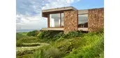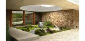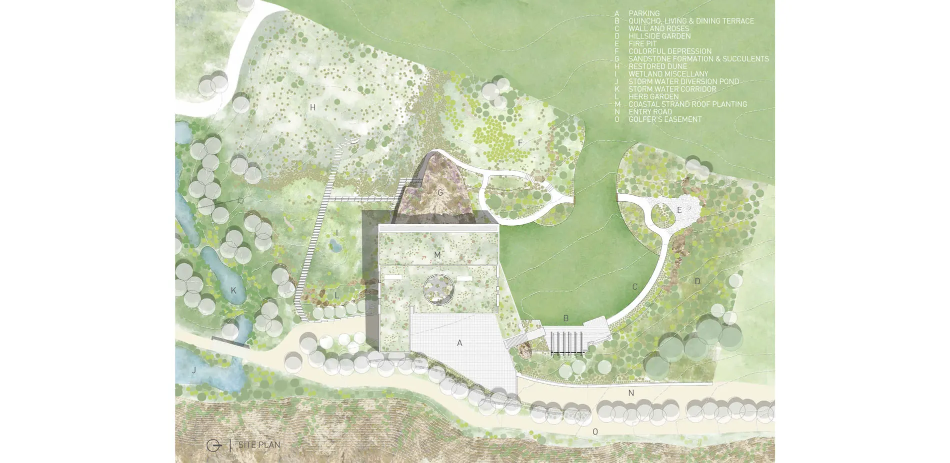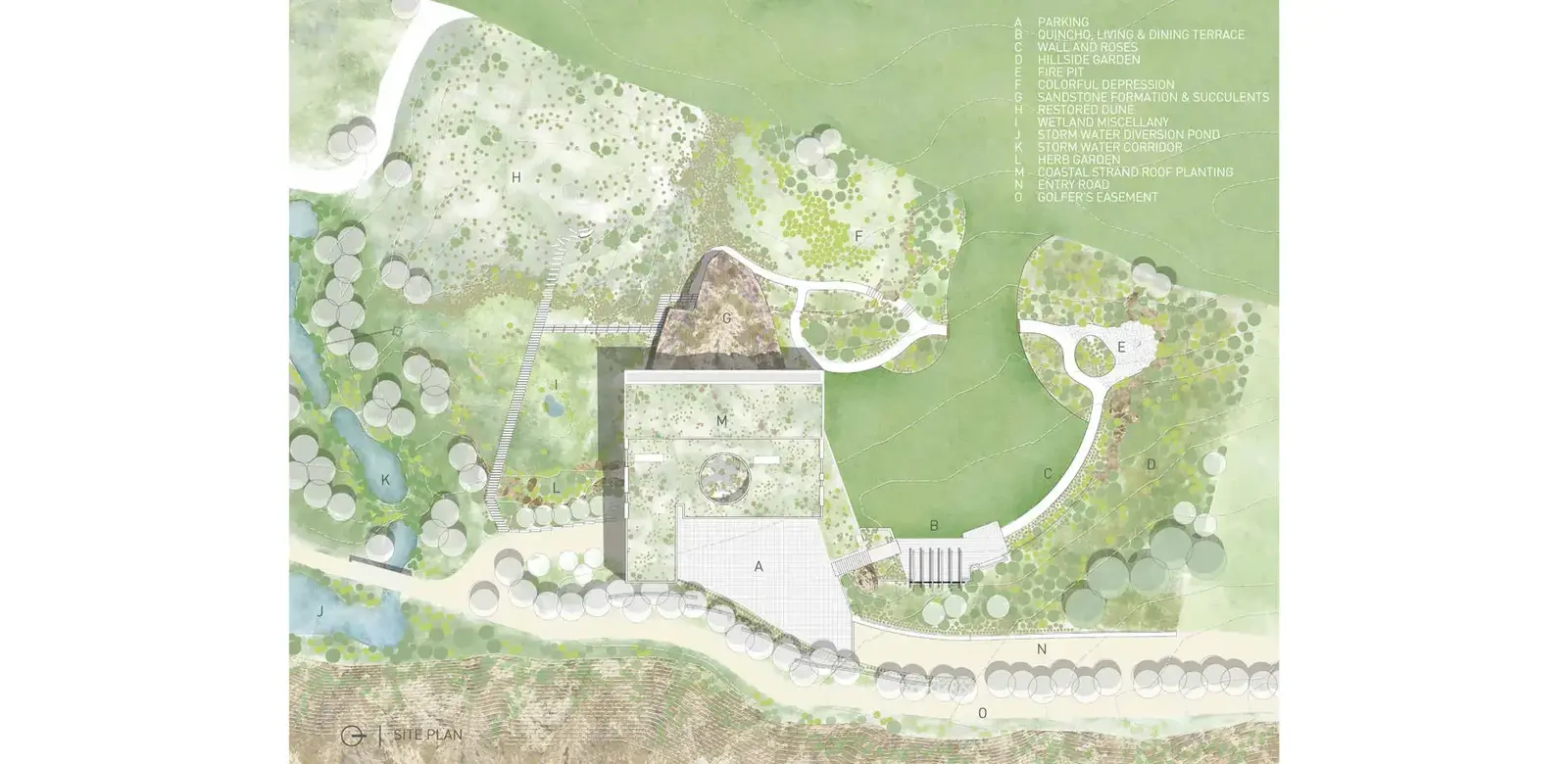 During the clearing a 2-ton granite boulder was discovered on top of the sandstone formation. Unlike any other stone, it is clear it was an ocean deposit from another era. It is featured in an entry courtyard with another relic, an old driftwood. Carefully selected beach stones and were used to form a mosaic between ancient plant types. A circular roof void couples the courtyard to the heavens above. The upper floor includes the kitchen, dining and living rooms, and a master suite, all of which have unique views to the surrounding landscape. The dining room overlooks a wetland, where the controlled seepage is released, and a reconstructed sand dune positioned to conceal immediate views to an adjacent golf hole. The sedimentary sandstone and its eroded voids were filled with succulents with bright colors in juxtaposition with cooler ocean hues. The master suite looks over a lawn linked directly to the golf course, a simple sweeping stone wall and a collection of individually placed sandstone boulders. A sharply inclined hill was formed to separate the site from the adjacent lot serves as a colorful backdrop to the garden. The lower building level was carved into the side of the sandstone formation and contains three guest rooms and a small common living, all of which are graced with a simple walkout to a grassed terrace. Green roofs cover both the lower and upper levels.
