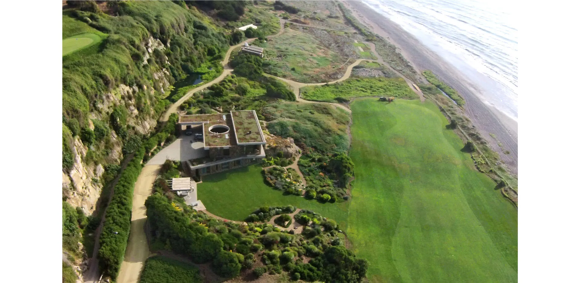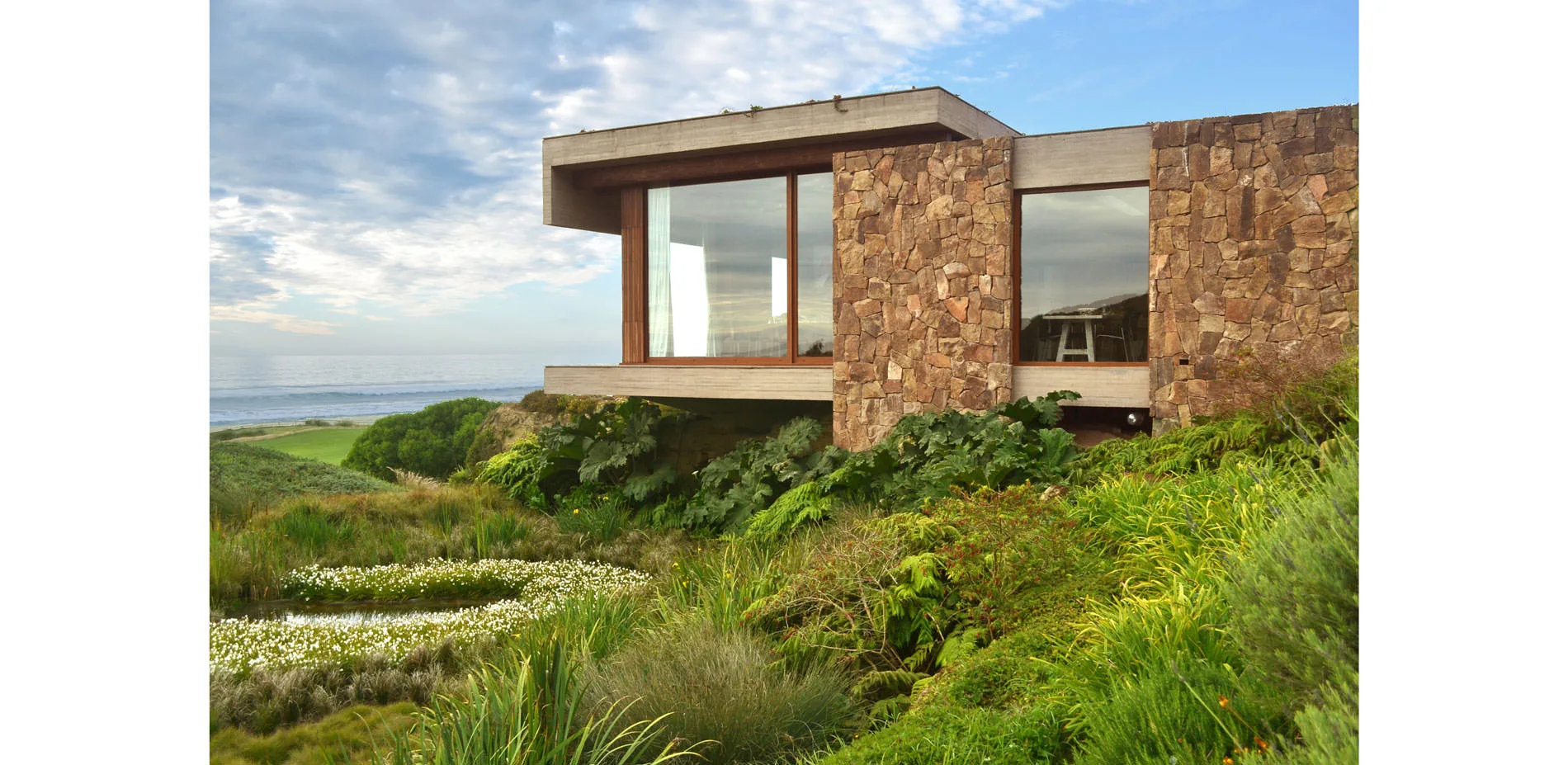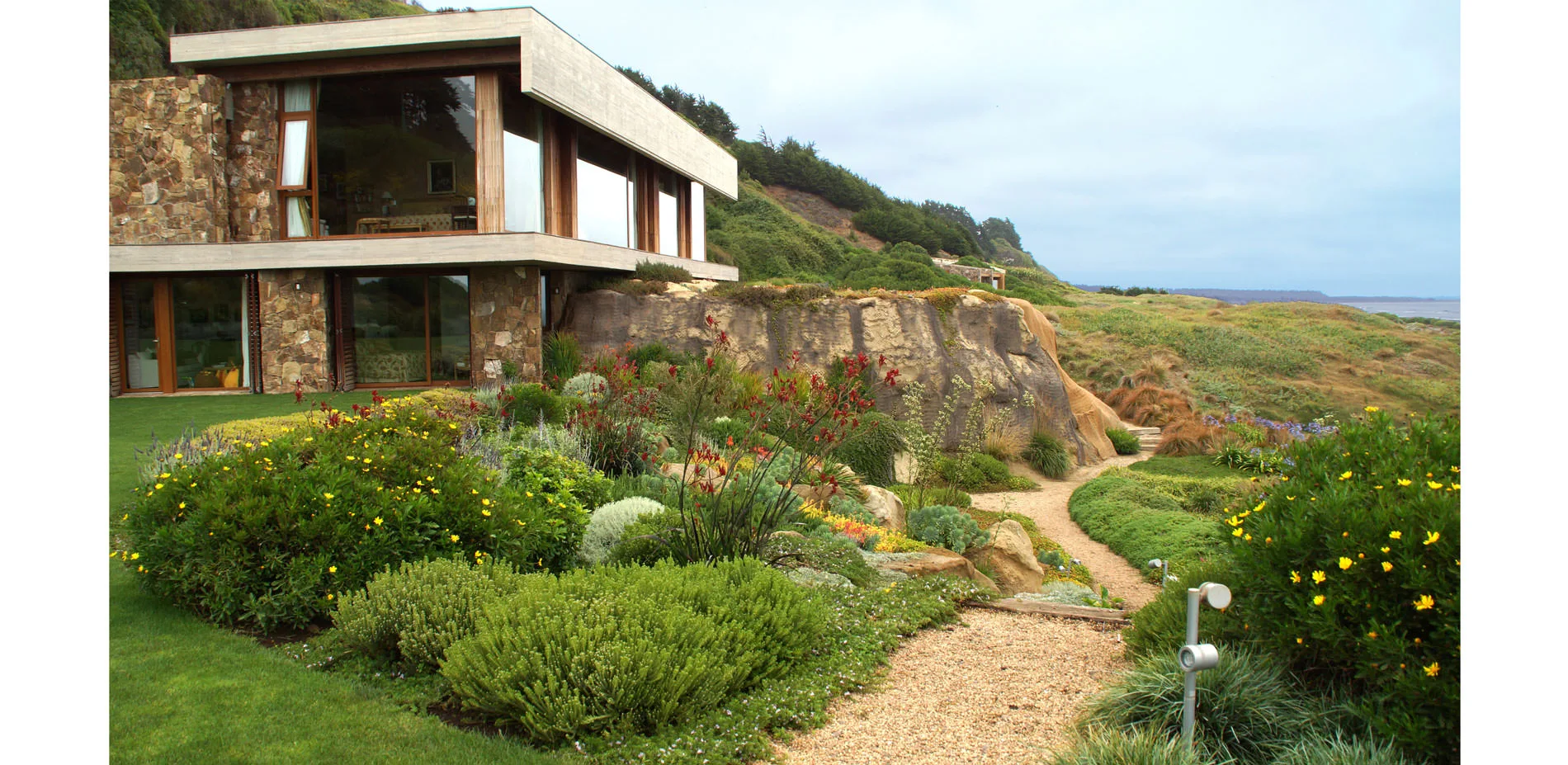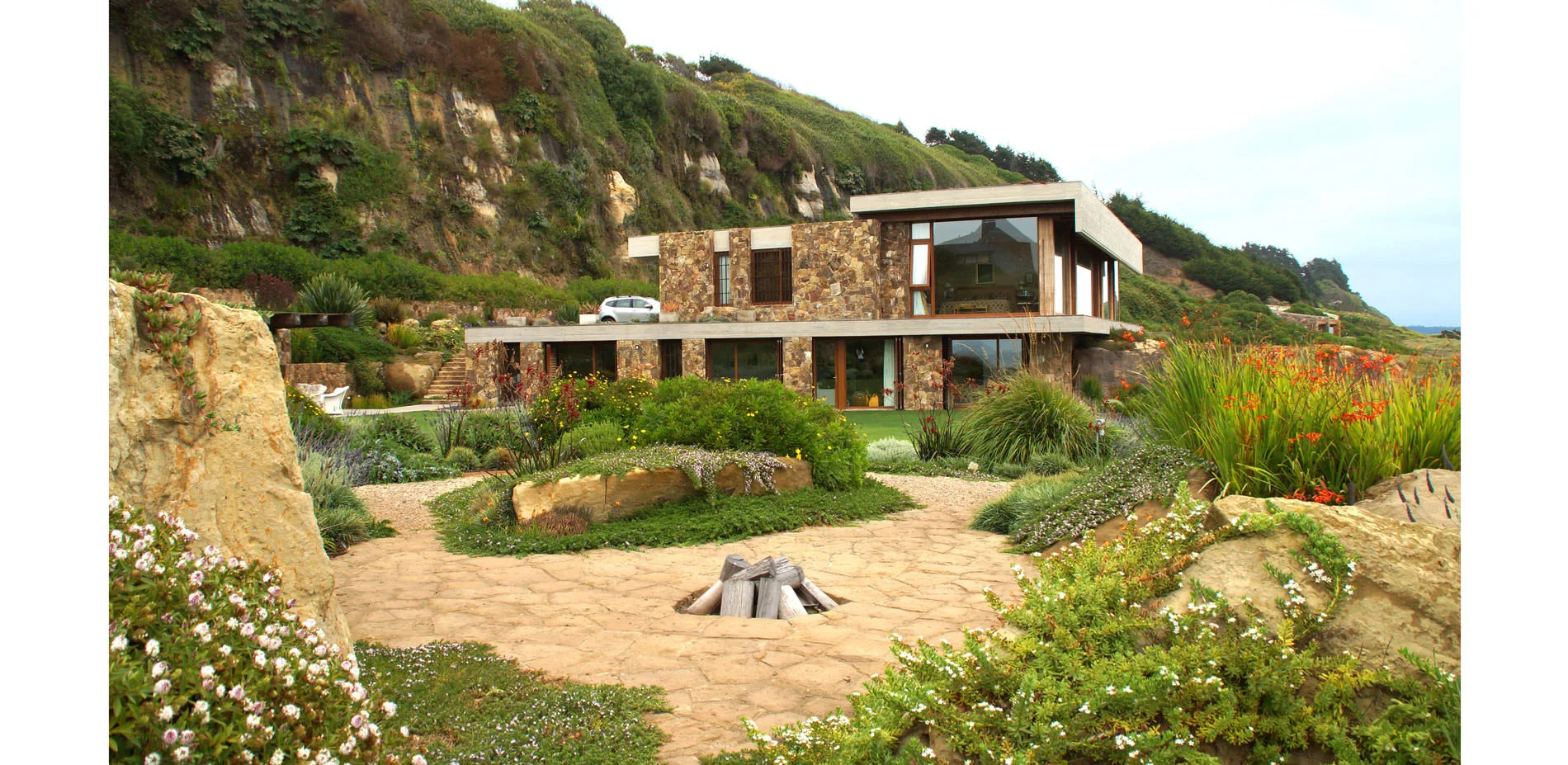 In the mid 90’s, a 300-hectare residential resort community was built along a coastal bluff 8 kilometers south of Santo Domingo, Chile. The majority of the storm water collected from the new roads and roofs was diverted to the southeastern corner of the property and subsequently discharged from the top of a 40-meter cliff. Following a few major storms, a new defile was formed and many cubic meters of sand were washed out to the sea. Blackberries quickly populated the scarred environment. We were challenged to control the storm water discharge and recreate a favorable ecological environment. Although challenging, the aforementioned cliff seeps offered opportunities to harness and govern the water. The home’s location is very important to the homeowner because the site essentially links the existing development to a future planned community and working farm. We addressed and planned access to the residence with arrivals from both the farm and existing development.