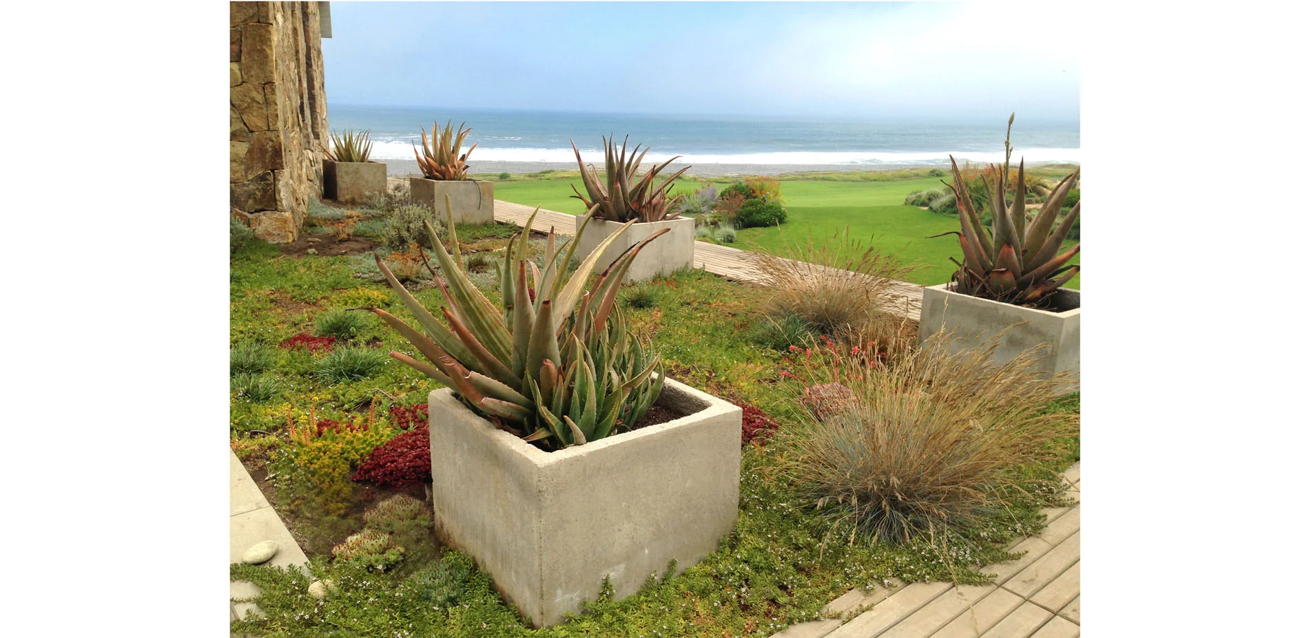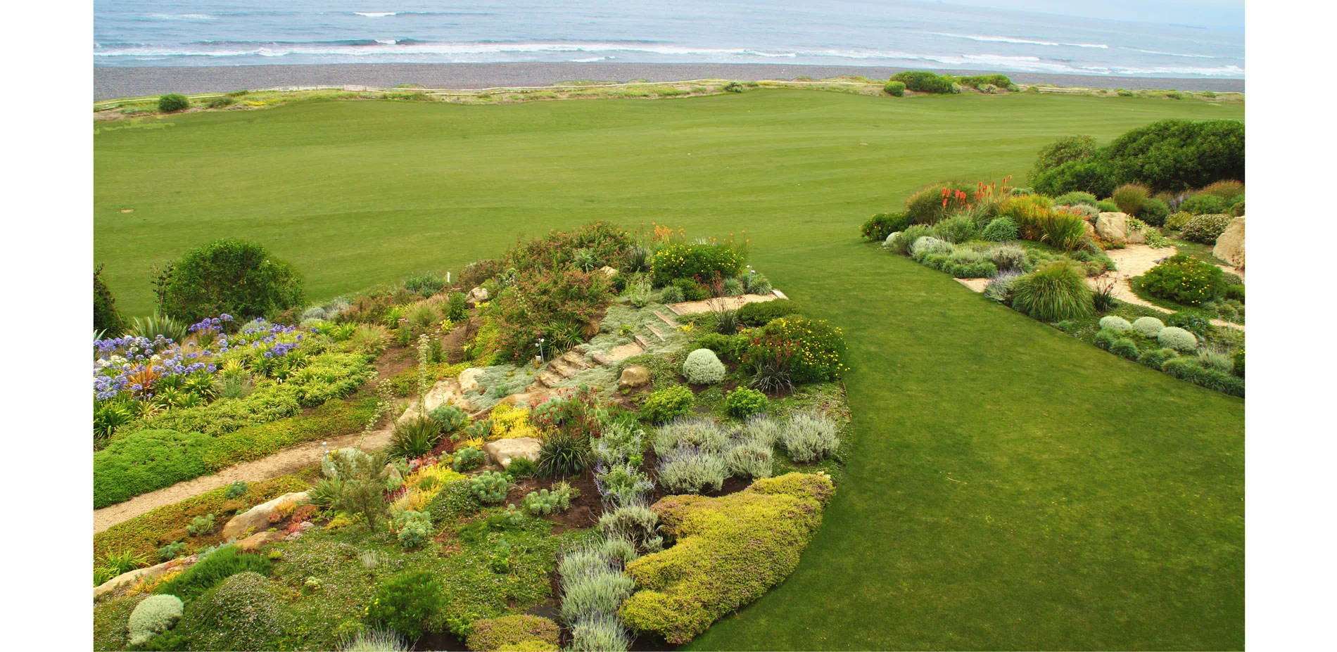 A prominent and central sandstone formation extending towards the ocean was quickly identified as a center piece for the home’s foundation. Its unique formation adequately elevates the main floor or second level, with views above the garden and to the ocean. Considering the rich context of the environment and geology, we sought to create numerous settings within the site’s framework to add interest and attraction. Architecturally, the idea was to keep the lines and forms simple and elegant. Similarly, the surrounding landscape would be a rich composition of colors and textures with very subtle geometry for circulation and visual cues. Control of the storm water included a new pond to eliminate turbulent forces, water velocities and erosion. Rainwaters and residual waters were directed from the pond through a series of drops and into a newly formed coastal wetland. Spring waters emanating from the sea cliff were captured and diverted through the garden to reduce hydrostatic pressures and secure the home’s foundation. Finally, significant grading and earthwork helped divert coastal breezes and create microclimates.
