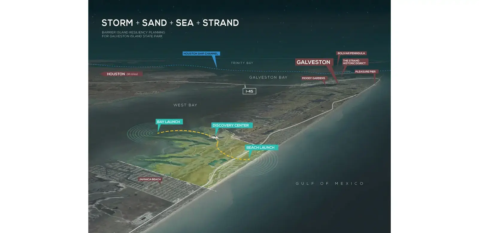 Barrier islands are dynamic ecosystems in constant evolution. While wind and tide shape the landscape, tropical storms and sea level rise accelerate inland habitat migration. In 2008, Hurricane Ike completely ravaged Galveston Island State Park. The redevelopment master plan is a new precedent for coastal recreation planning built on a foundation of predictive models. Based on site specific ecologies and elevations, the plan must literally anticipate what of the site will remain in 50 years and what its ecology will be. The plan immerses visitors in the dynamics of this fragile and diverse landscape.