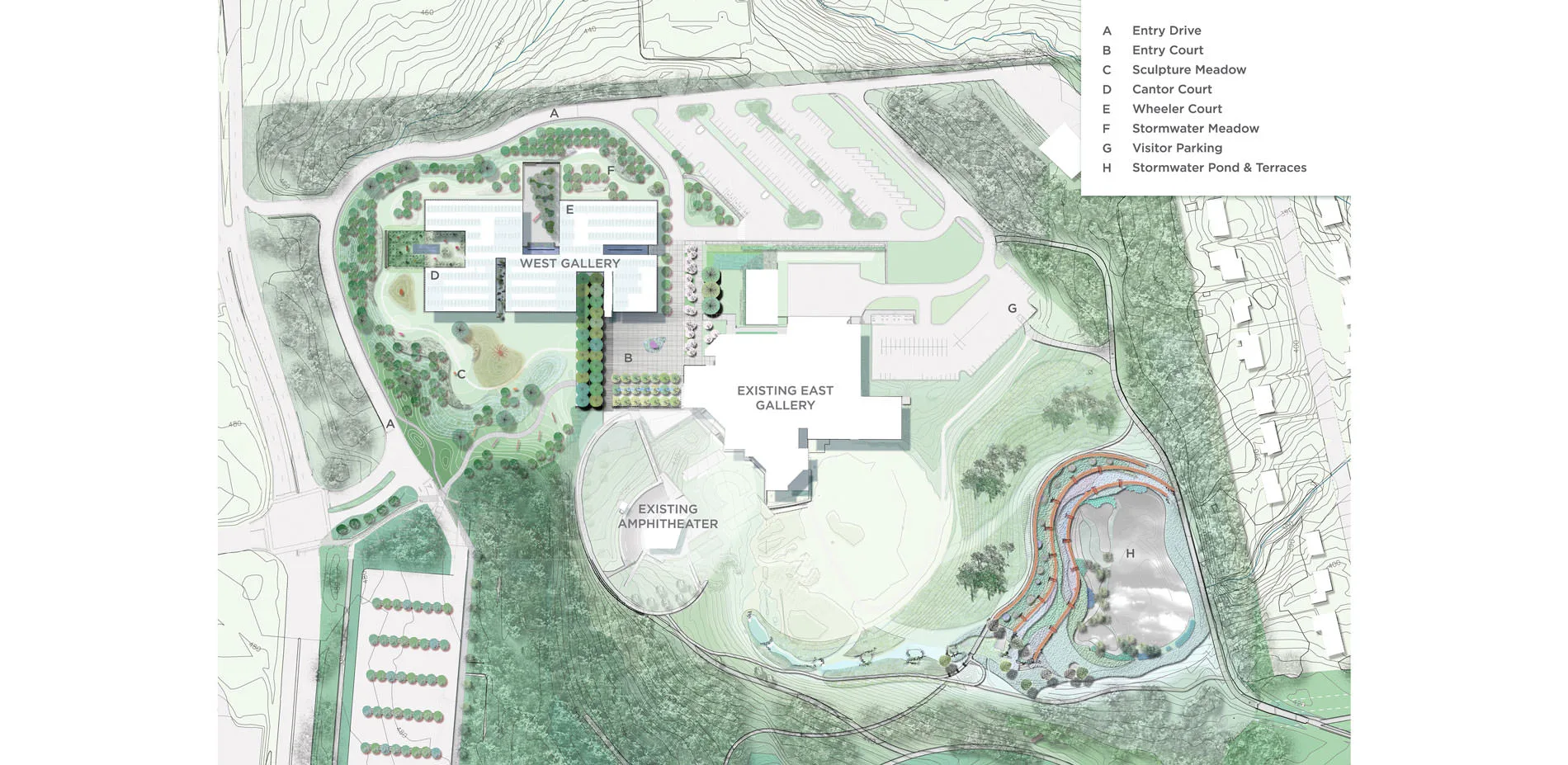 The project was a major component of an ambitious museum expansion that includes a 127,000-square-foot wing housing new galleries. The building, which Architectural Record named as one of the 125 most important works of architecture built since 1891, has an exterior made up of 50% glass, which facilitates a strong interplay between its interior and the surrounding landscape. The landscape architect supports the primary architectural concept of incorporating natural light into the interior galleries with a series of exterior courtyards that cut into the rectangular form of the building. These spaces effuse an exceptional quality of light and reflectivity, and beautifully blur the line between gallery and landscape. The landscape then transitions into five acres of adjacent gardens that provide an immediate setting for both the building and a series of works by renowned sculptors such as Auguste Rodin and Henry Moore, as well as contemporary works by Roxy Paine and Ursula von Rydingsvard. The design reflects an intentional and disciplined restraint that beautifully situates the sculptures within their context.
