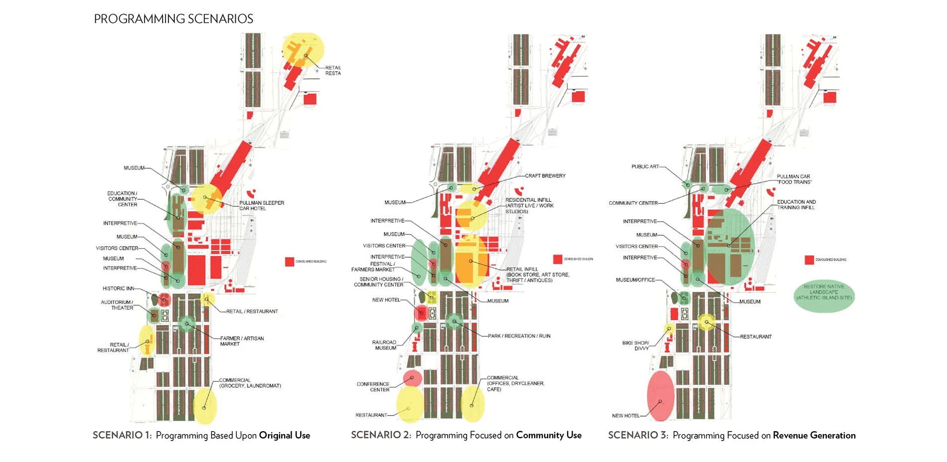 The workshop was facilitated by a technical team of 40 volunteer architects, landscape architects, city planners, economists, and engineers, who assembled to work with Pullman stakeholders to develop a roadmap for improvement and operations. Discussion was organized around four topics: park experience; historic preservation and adaptive reuse; access and connections; and community development. Input was collected from the over 500 diverse and committed stakeholders who attended the events.