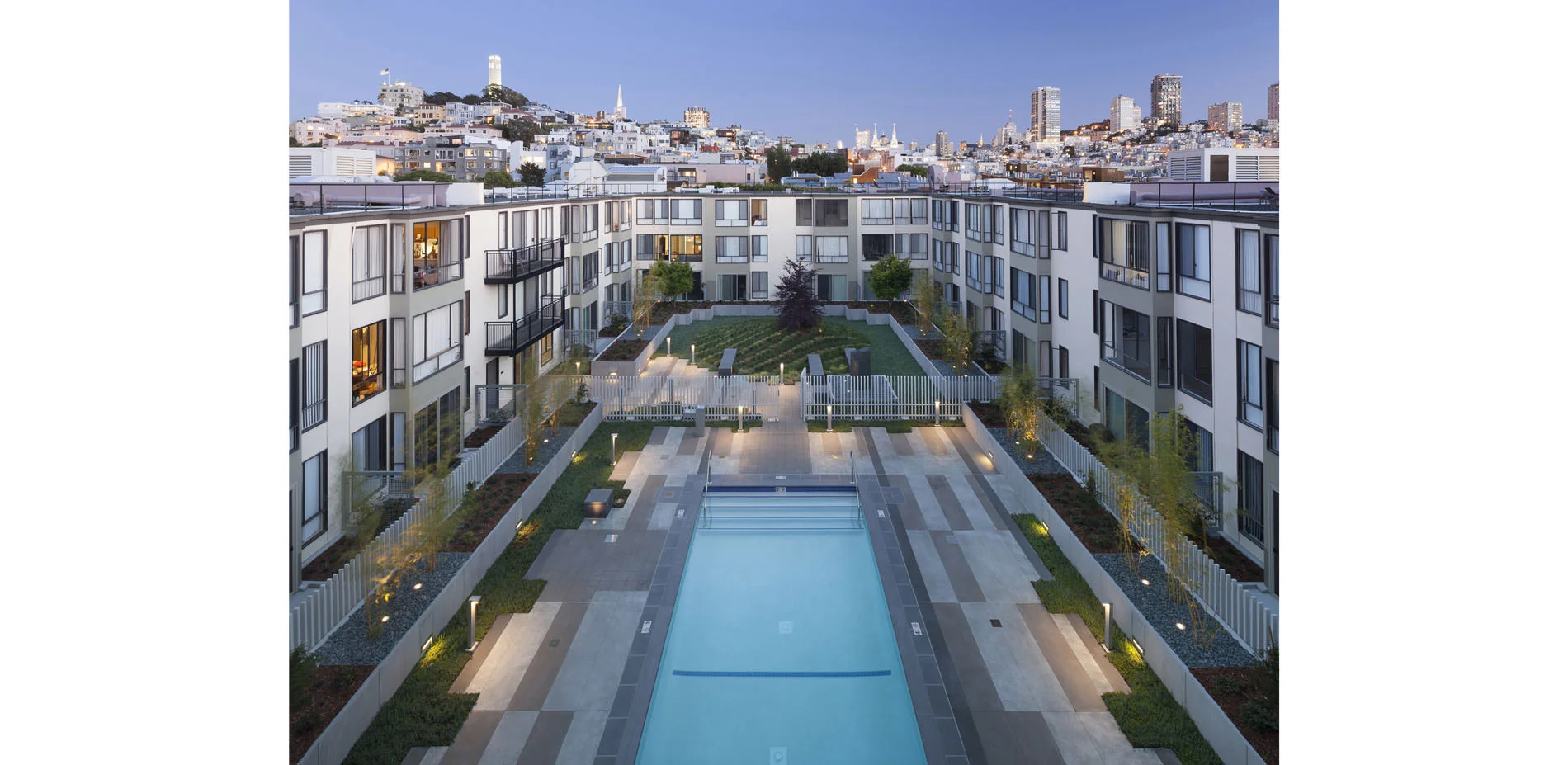 This project comprises the redesign of five courtyards over podium parking, as part of a major renovation of an apartment complex originally constructed in 1969 in San Francisco’s North Beach neighborhood. The original courtyard landscapes, designed by the office of Lawrence Halprin, had to be removed because of the failure of the decades-old waterproofing systems, which threatened the building structure as a whole. All five courtyards—four fully internal, the fifth at an adjacent property line—provide both common space and individual patios for first-floor apartments. Two of the principal courtyards have swimming pools; the other two have significant water features. The design of the new landscapes was severely constrained by the existing flat-slab construction. Nevertheless, by utilizing existing depressions in the slab, building up new areas, and applying both extensive and intensive green roof planting strategies, the scheme increased the breadth and depth of soil areas to create a rich garden setting in keeping with Halprin's original design intent. The choreography of raised elements integrated that goal with the larger goal of defining common and private spaces, while at the same time accommodating necessary state-of-the-art waterproofing and infrastructure systems.