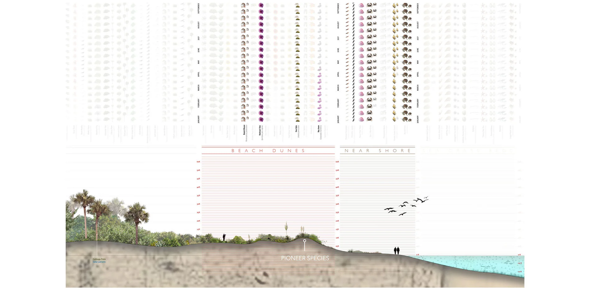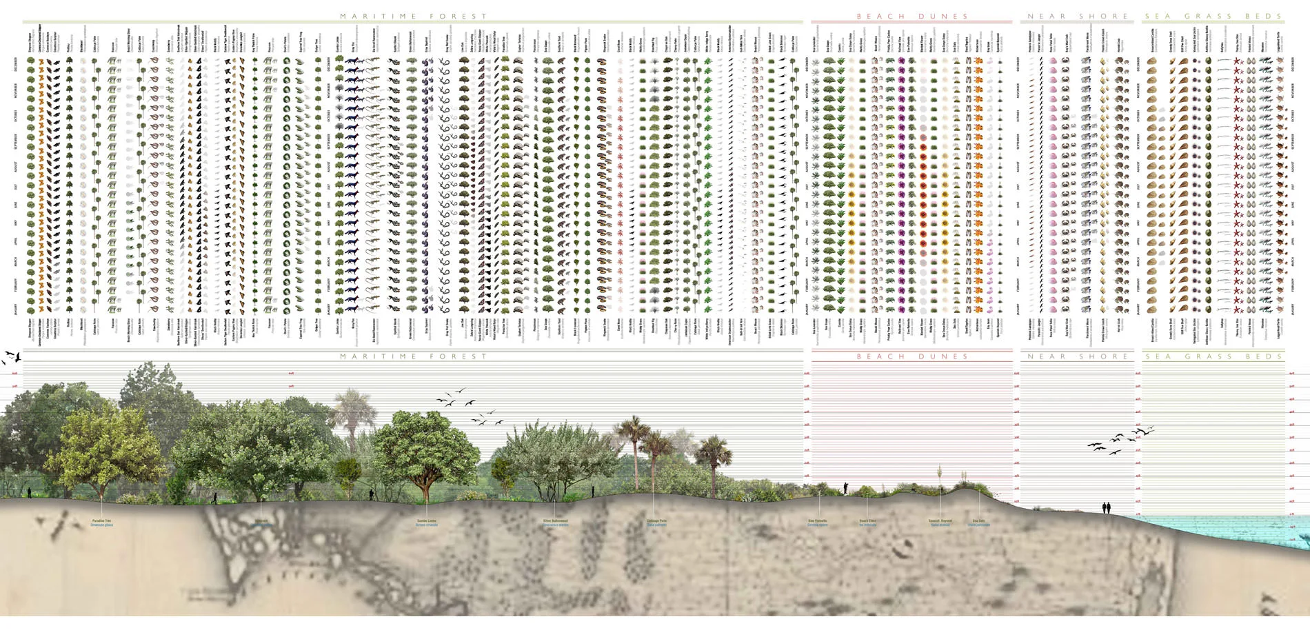 The immediate objective of the Ecological Atlas Project is to develop a graphic language for understanding, comparing, and relating the transformation and activities of living systems over time by using pattern recognition to sort through massive amounts of information. The long term objective, however, is to create a scalable and digital technology that promotes a better understanding and awareness of ecosystem relationships and leverages vast research troves that are otherwise unintuitive to use and access. The research behind the the Ecological Atlas can therefore be used for designing, planning and engaging the natural and built environments complementarily.