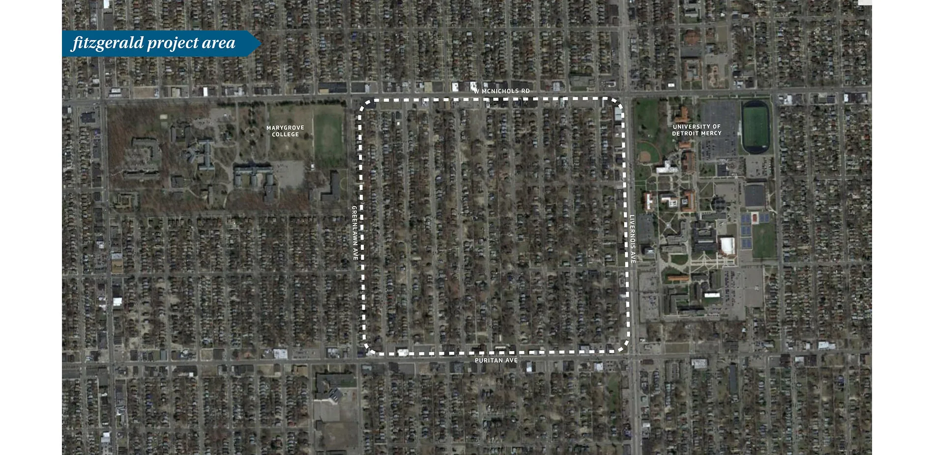 The project is located in the Fitzgerald neighborhood of Detroit, located between two anchor institutions: the University of Detroit Mercy and Marygrove College. As the population in Detroit declined, this neighborhood was hard hit, with over 1,500 residents leaving the area. Currently, the vacancy rate in the neighborhood is around 50%, with over 300 vacant parcels in this ¼ square mile area. Vacant, overgrown lots and empty houses, some in good shape, some in grave disrepair, are interspersed among active households. Pedestrian circulation in the neighborhood is compromised due to the street layout, lack of pedestrian routes, and the high speed of traffic.