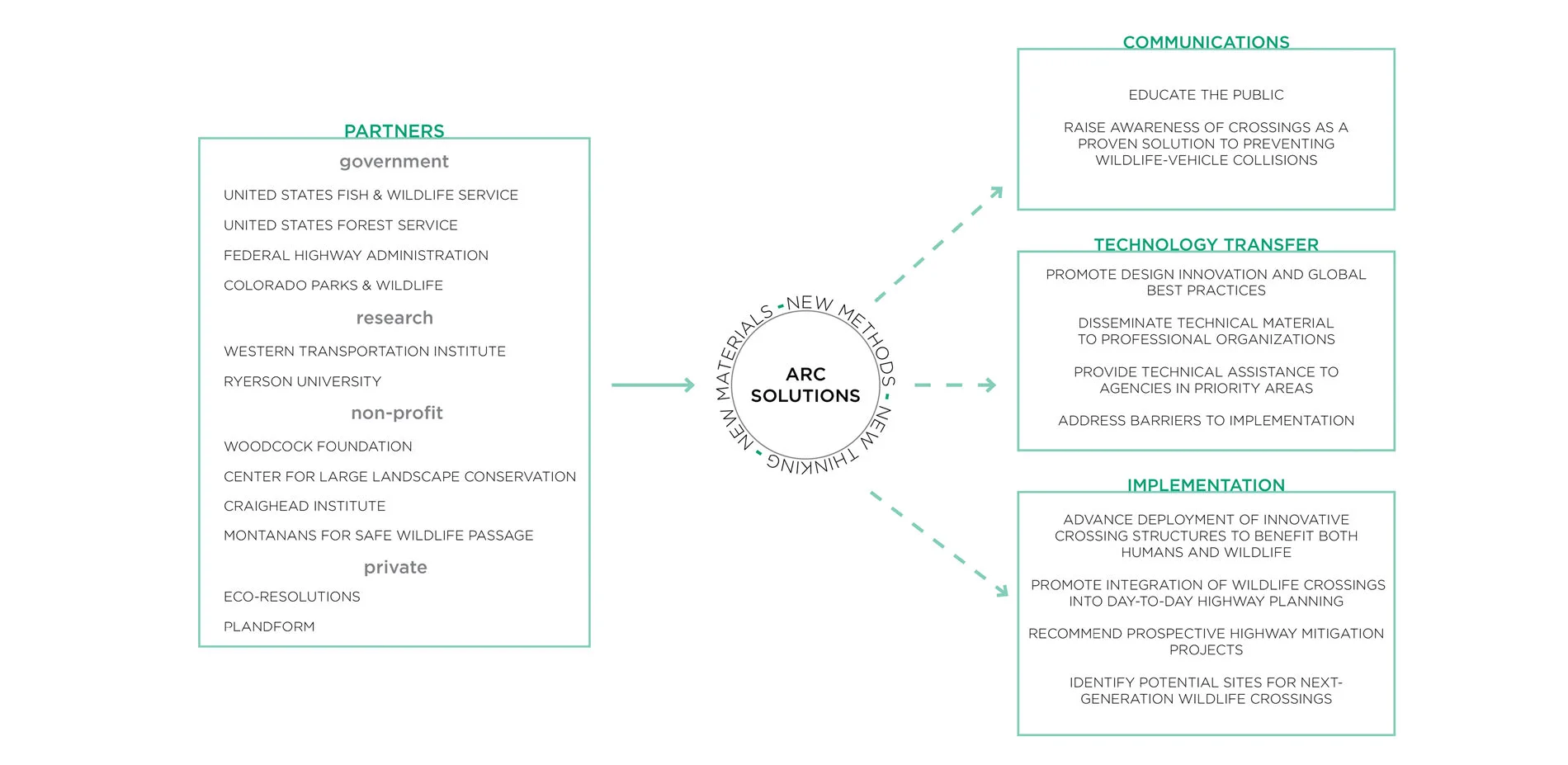 Today, ARC has evolved into its post-competition phase, known as ARC Solutions (arc-solutions.org). An interdisciplinary, not-for-profit partnership, ARC Solutions works broadly to innovate, educate and promote wildlife crossing infrastructure. Comprised of three initiatives (Communications, Technology Transfer and Implementation), ARC is working to raise awareness about innovative crossing solutions with the broader goal of promoting wildlife crossings where needed to (re)connect fragmented landscapes.