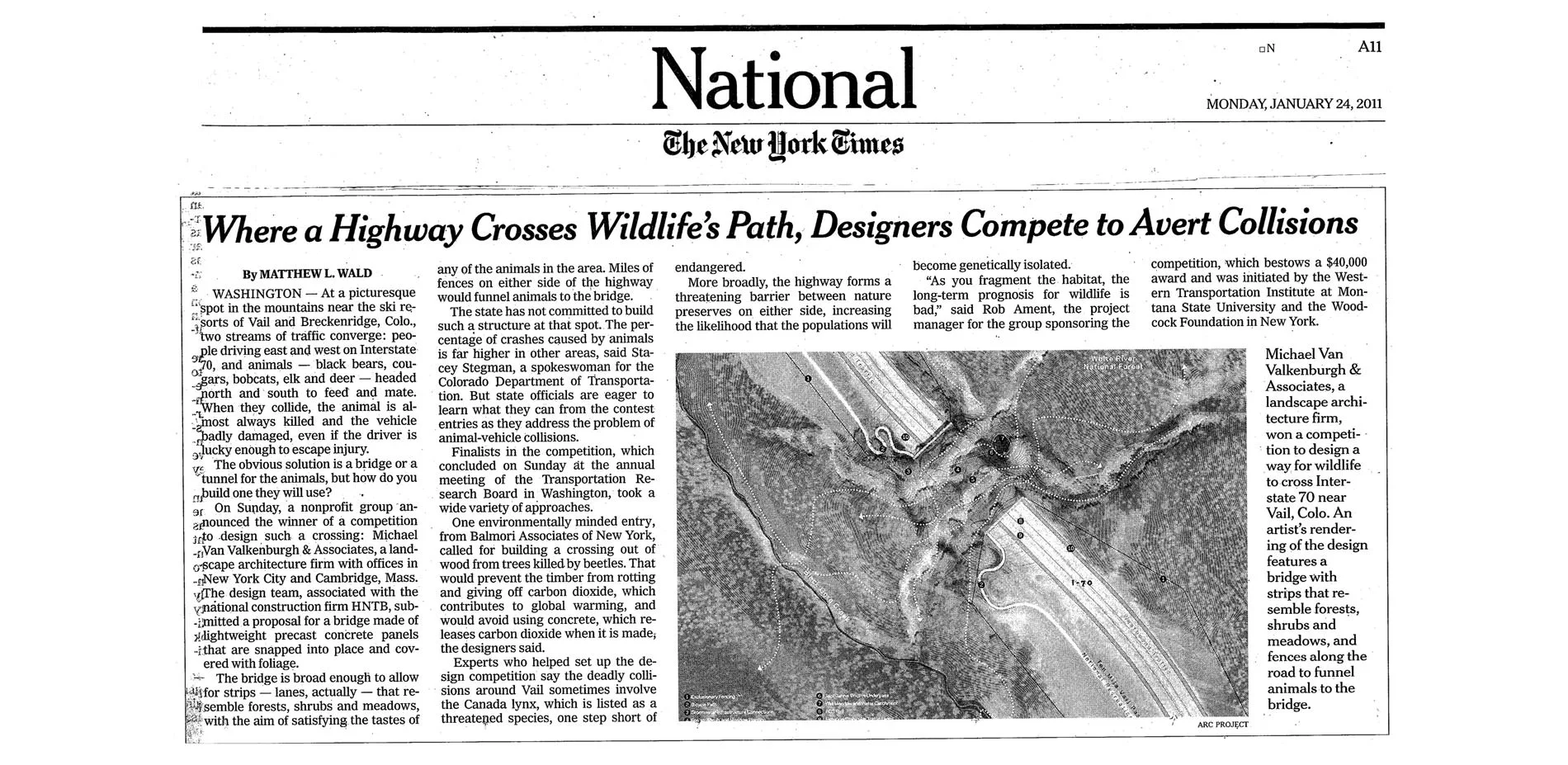The ARC competition ran in 2010 and attracted 39 interdisciplinary teams of more than 100 of the world’s best scientific and design professionals from nine countries. From these, five international teams were short-listed. The competition culminated in January 2011, when a jury of internationally-recognized experts in design, engineering and ecology selected the winning design by HNTB and Michael Van Valkenburgh & Associates (MVVA). Collectively, the five finalist designs have garnered a wide spectrum of media coverage for their innovation and promise.