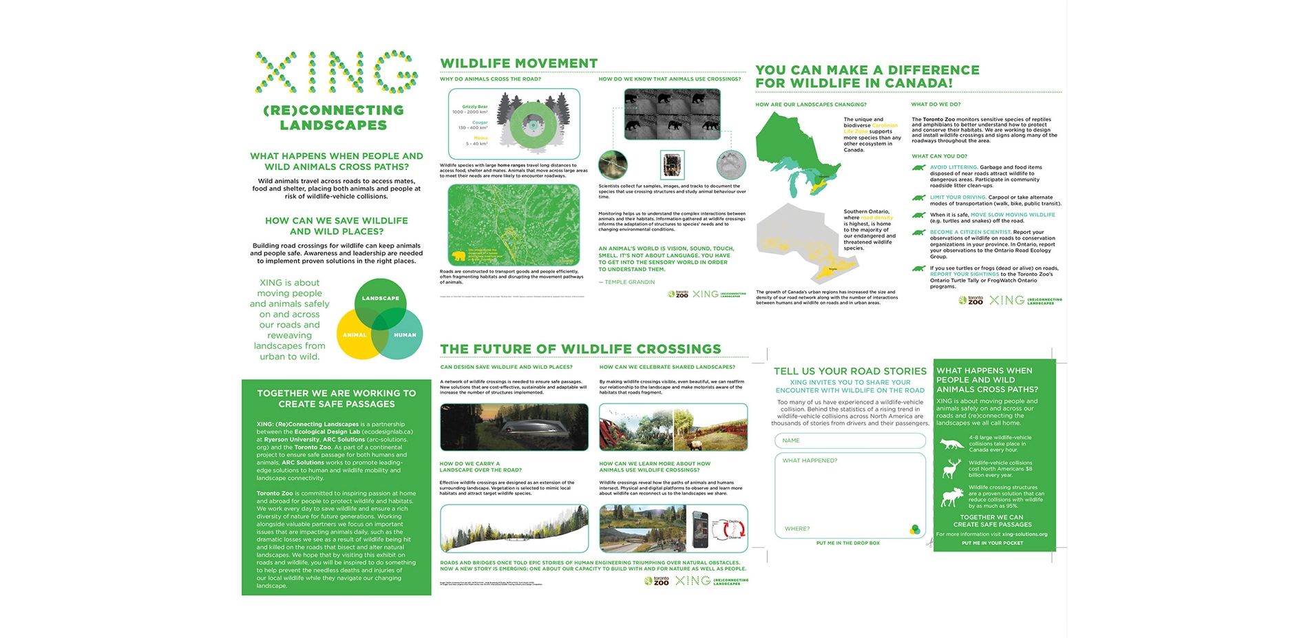 - Producing XING:(Re)Connecting Landscapes (xing-solutions.org), an educational, interactive public exhibit that brings forward the emerging dialogue on landscape connectivity by engaging with the public on the ways humans and wildlife collide, converge, and ultimately reconnect, exhibited at the Evergreen Brick Works (2013), Royal Ontario Museum (condensed format – March 2014) and on permanent installation at the Toronto Zoo (2016) At its core, ARC is about moving people and animals safely by building a system of built and metaphorical bridges linking wildlife to habitats, art to science, engineering to ecology—and, in the process, re-weaving the landscapes we call home. In so doing, ARC provides a remarkable example of precisely the sort of influential and innovative storytelling to diverse audiences that is a hallmark of the ASLA Communications Award.