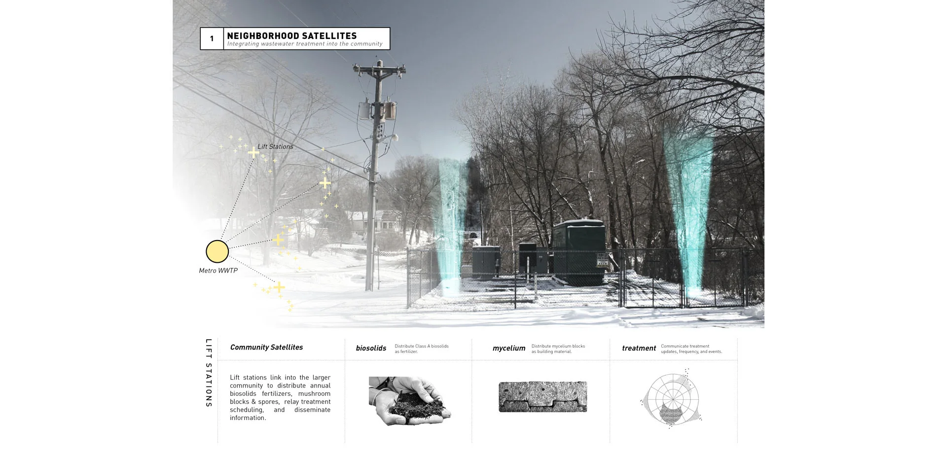 The fingers of the Metro WWTP infrastructure are expansive, and the flow constant. After being used in residences and businesses, wastewater is flushed into local pipes, which plug into municipal sewer pipes, which then lead into interceptors, the largest of the conveyor pipes. Interceptors flow to the lowest point in the sewershed: the Metro WWTP. When gravity is insufficient to direct the flow of blackwater, the interceptors run through lift stations, which are effectively invisible to the public eye. Embedded within a public park as a nondescript building or sitting at the end of a cul-de-sac, the stations are quiet connections which rarely merit a second glance. The design proposal begins at this community level, transforming the lift stations from overlooked elements to distributors of fertilizers, building materials, resources, and information.