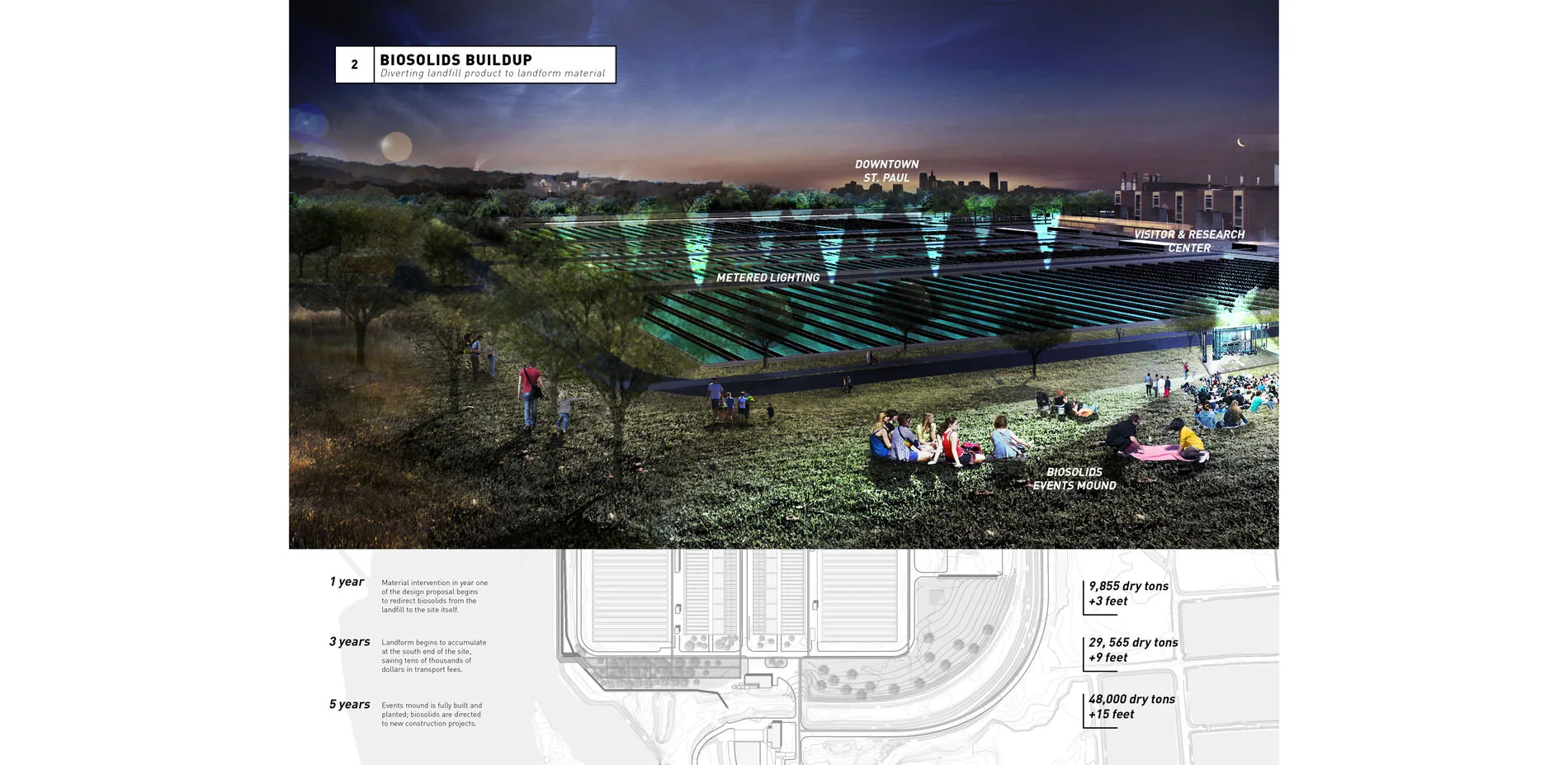 Biosolids - The proposal redirects 48,000 dry tons of class B biosolids from the local landfill over 5 years to create a landform at the south end of the site, which will serve as a large, informal events space. After this period, biosolids will be distributed to the community for earthworks projects, reinforcing the plant’s city-scale metabolic process.