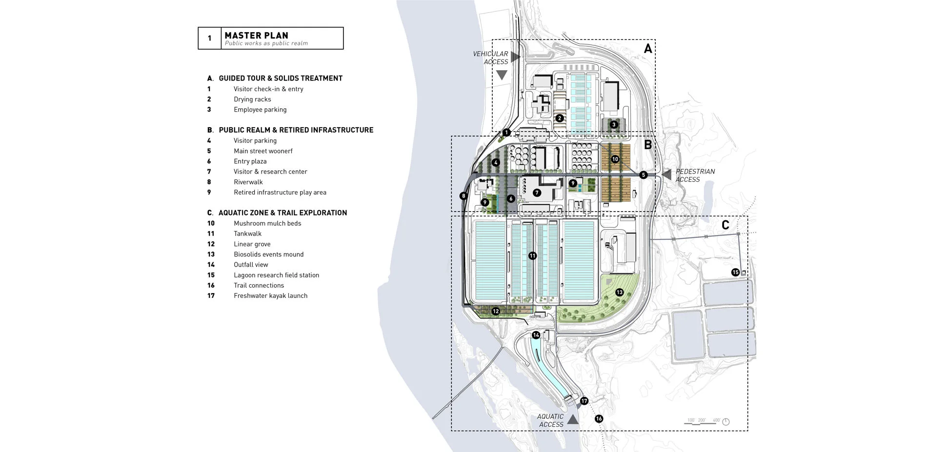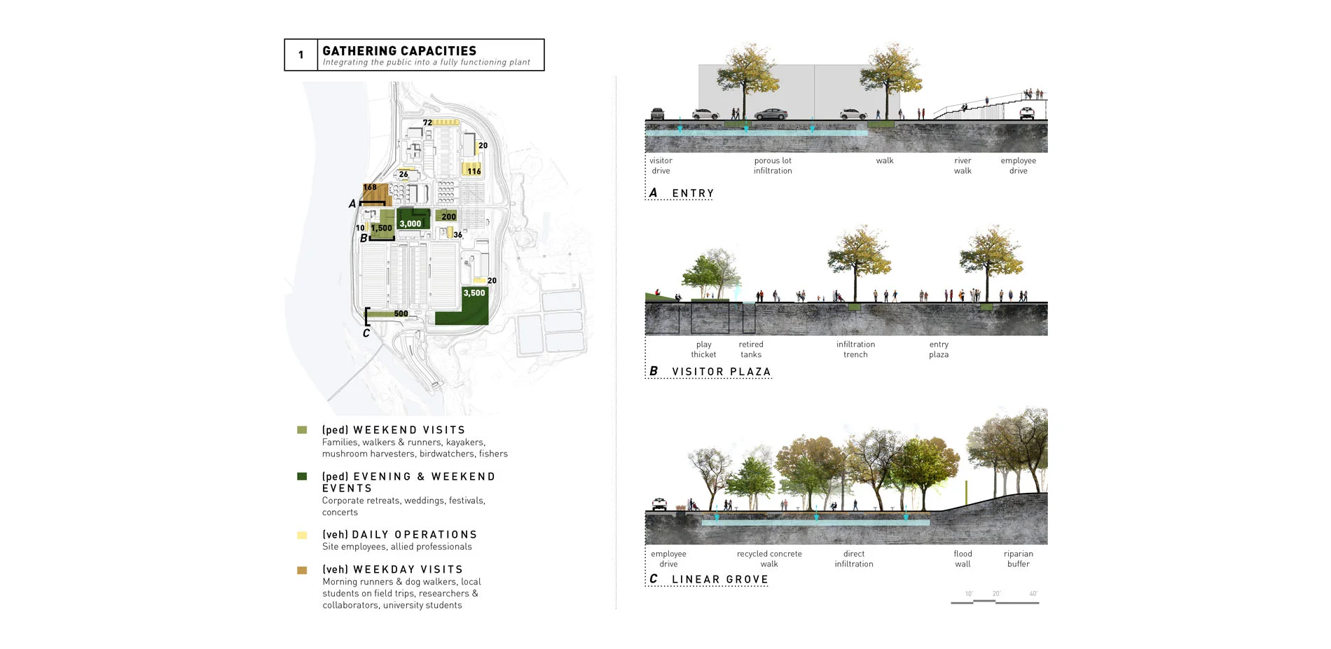 The site design blends spatial, visceral, and material opportunity, allowing the visitor to read the treatment process through experience rather than on a pamphlet. Safety and immersion are paramount in pedestrian flow. The northern zone, is primarily restricted to employees and guided tours only; the central zone encompasses the most concentrated public realm; the southern zone focuses on the less programmed experience with trail connections to the larger context.