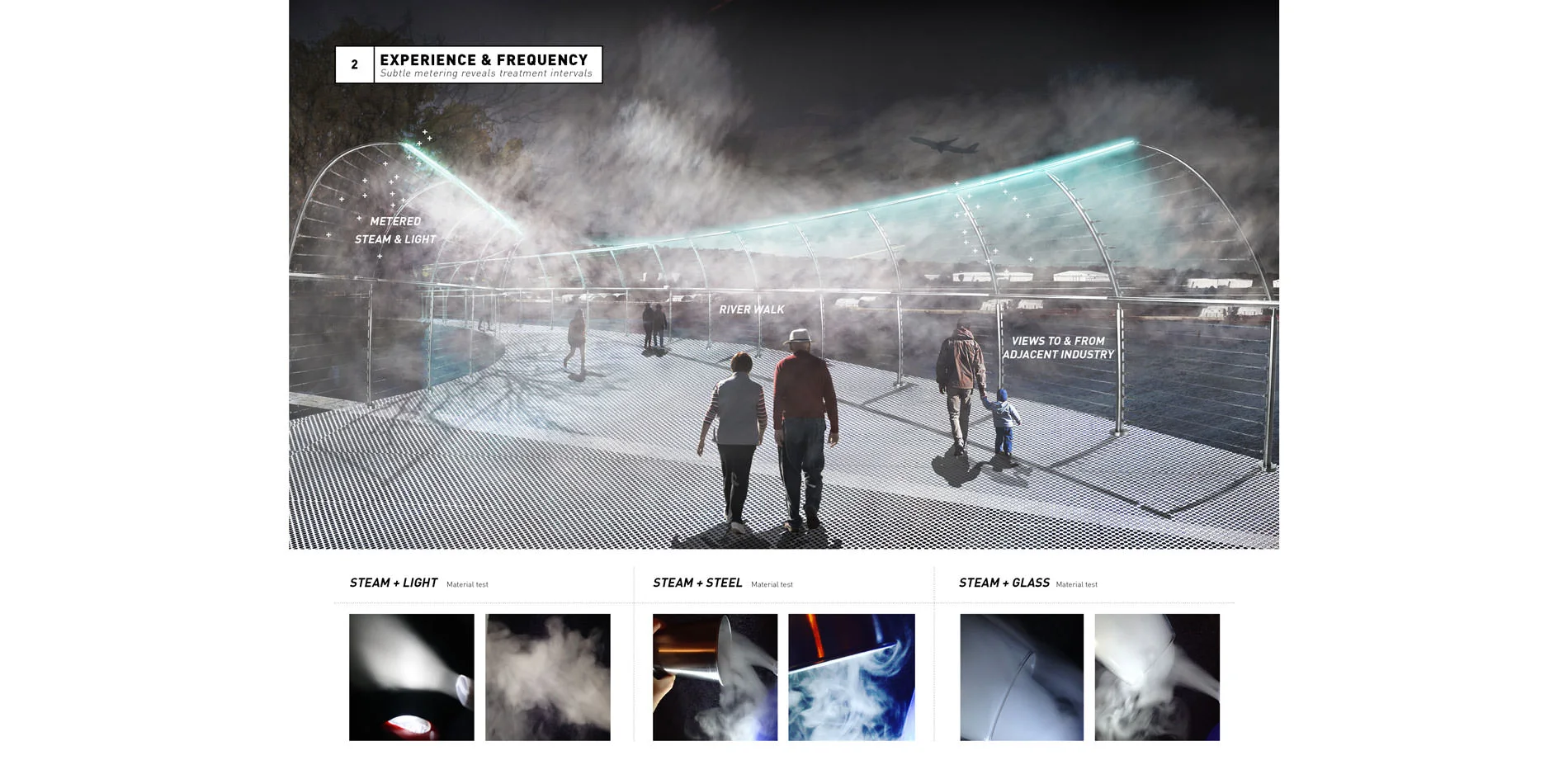 Light & Steam - The treatment process at the Metro WWTP is constant, operating 24 hours a day, 365 days a year, and treating 180-250 million gallons of water each day. Because the current plant is visually constant and does not reflect this flow to the untrained eye, a system of showing benchmarks in a subtle way is essential. The design proposal uses pedestrian path lights as meters of the process. Each time 10 million gallons of wastewater is cleaned, the lighting will perform a recognition of this achievement. Depending on season and flow, this will happen anywhere from 18 to 25 times per day. The proposal transforms site lighting into meters of treatment process. Through this nuanced cadence, the user experience will change with each visit.