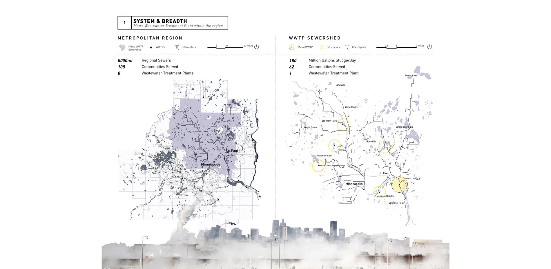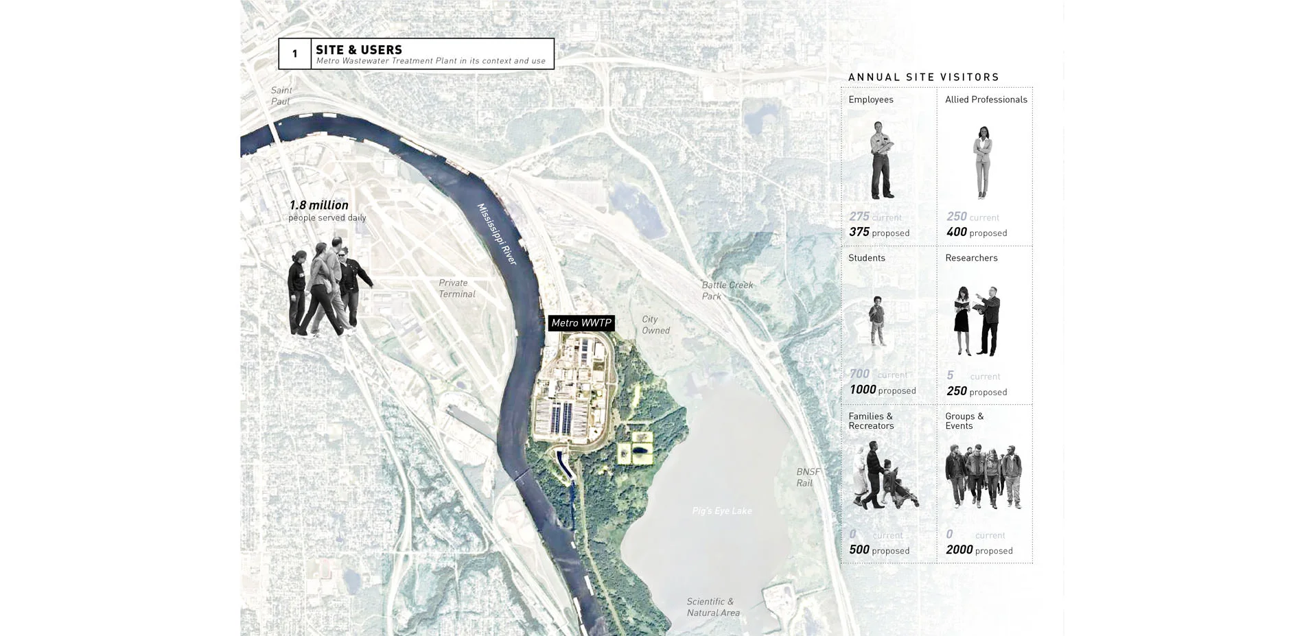 The cause for this naiveté about wastewater treatment stems from the manner in which cities have grown. As populations and footprints increased, wastewater treatment was relegated to the periphery of cities. However, continuous innovation has led to more sanitary and sustainable practices, and it is no longer necessary to separate the public from the process. Today, the Twin Cities Metropolitan Council treats approximately 250 million gallons of wastewater daily at 8 regional treatment plants, directed through 5,000 miles of sewers across 108 communities. The Metro Wastewater Treatment Plant (WWTP) is the largest and farthest-reaching of all the plants. Located 3 miles from St. Paul between the Mississippi River, Pig’s Eye Lake, neighboring industry, and nature reserve, the 180-acre plant blurs the line between community, industry and ecology.