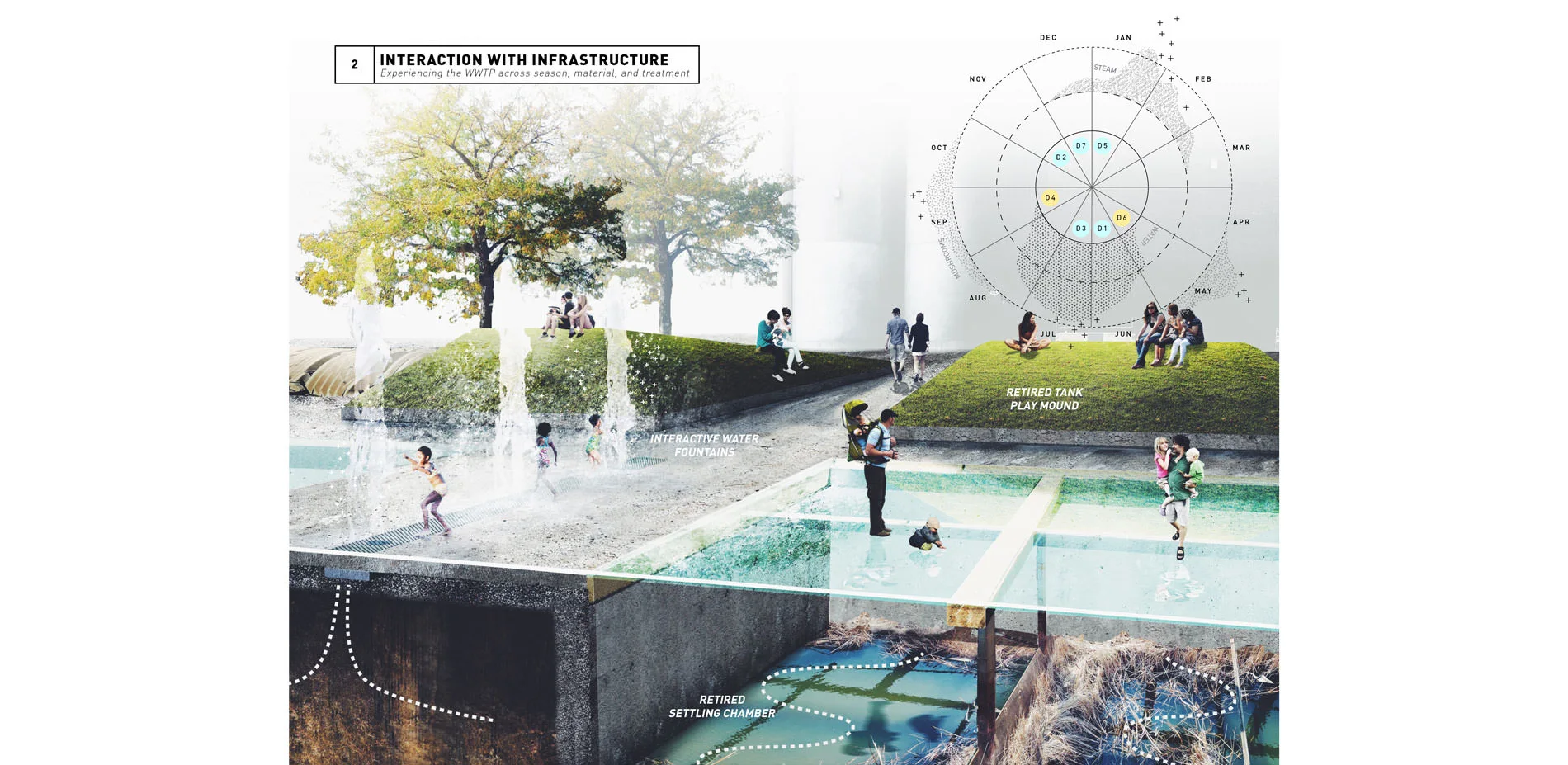 Season - In Minnesota’s extreme climate, materials become amplified during certain times of the year. Summer lends itself to interactive water features, winter enhances steam and ice crystal formations, and spring and fall invite fauna activity and mushroom harvest. The design takes advantage of these phenomena by bringing the public into contact with these safe byproducts, simultaneously allowing people to read the phase of treatment.