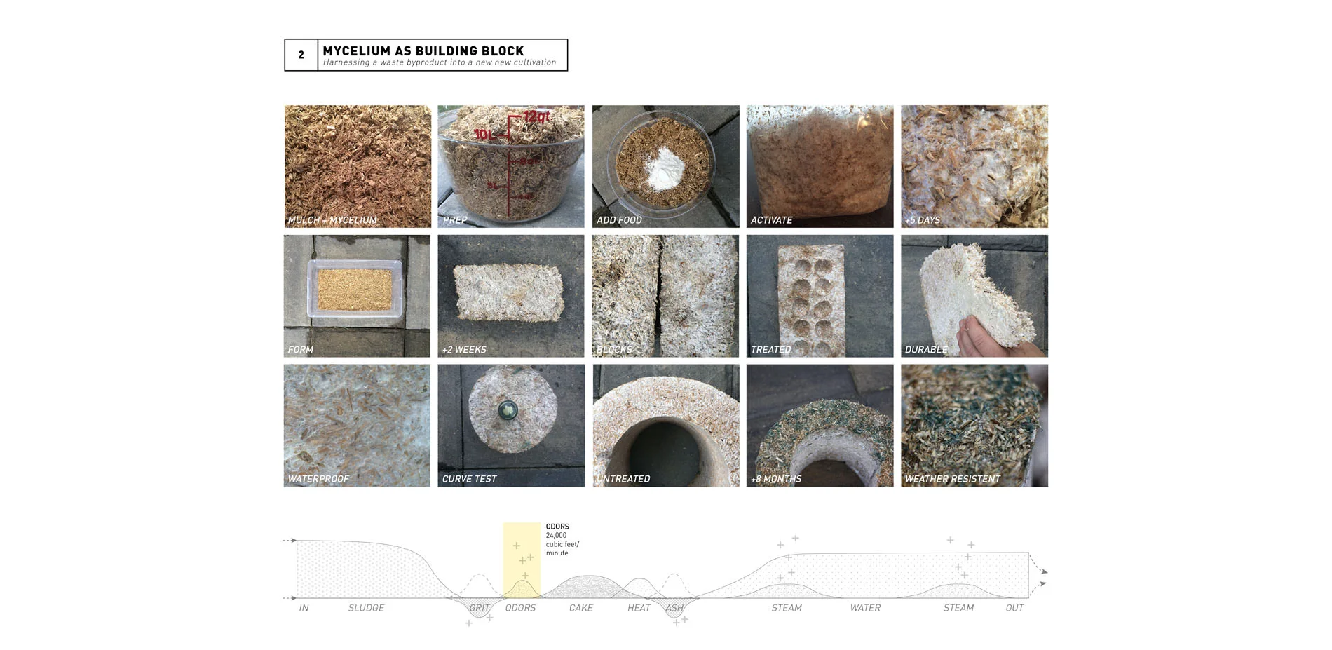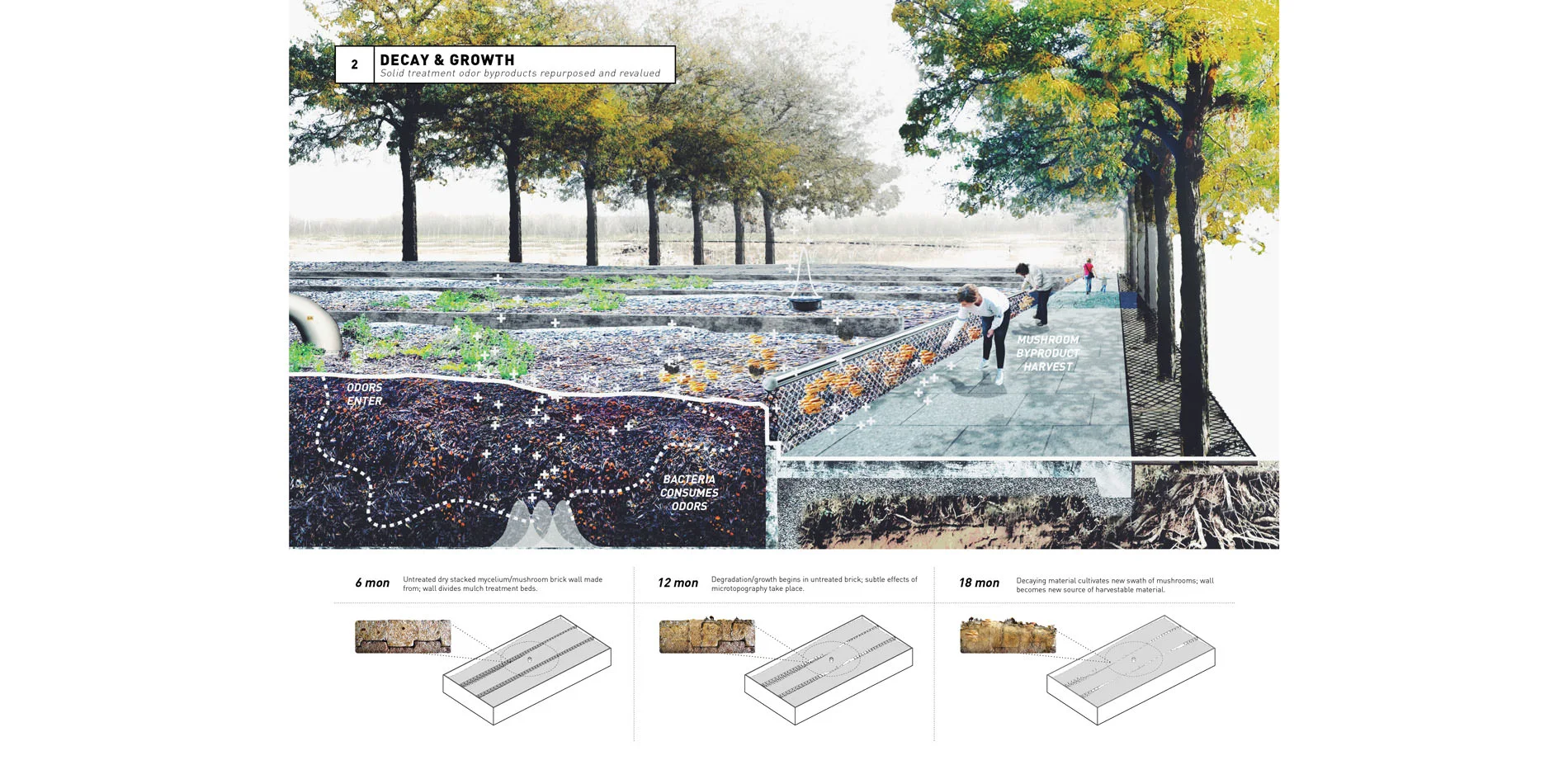 Mycelium - Currently, the Metro WWTP treats approximately half of its odors through an organic process of odor eating bacteria in large mulch beds outdoors. The design proposal doubles this organic treatment and relocate treatment to accommodate the size. One unintended byproduct of this process is growth of mushrooms in the warm mulch beds. Using subtle changes in topography in the mushroom beds combined with tree canopy amplifies and expands the mushroom growth process so that users can harvest edible mushrooms on site. Additionally, spores will be used to create durable mycelium blocks. These can be grown in any form, are structural, organic, and will be used for short term material storage on site and distributed throughout the community.