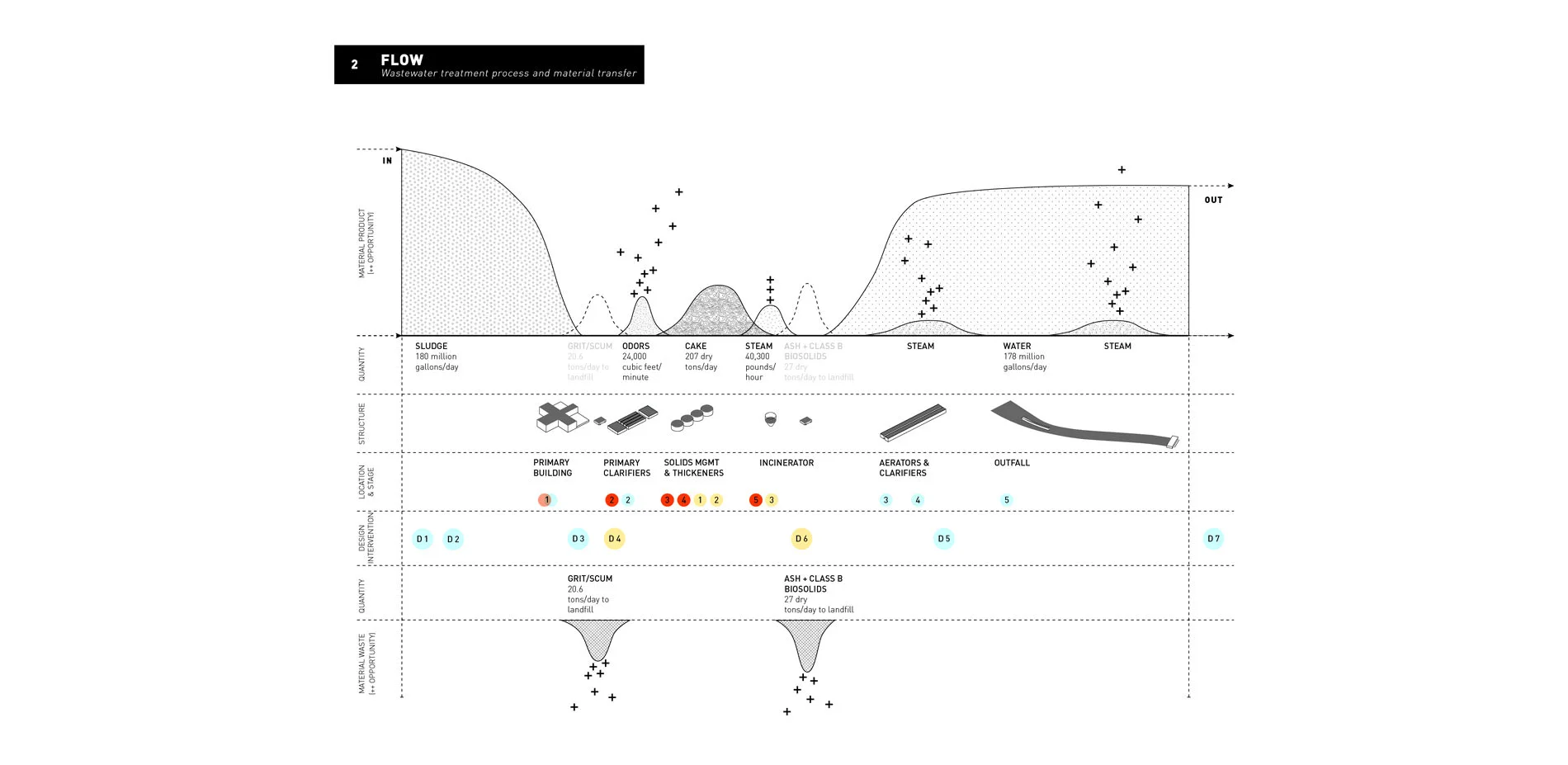 Once wastewater arrives at the Metro WWTP, it takes approximately 15 hours to make the journey from dirty to clean. During that time, it is separated into a number of different materials through a series of chemical and organic processes. By breaking down each of those stages and quantities, Invisible Works reveals strategic points throughout the process that present opportunities for intervention: