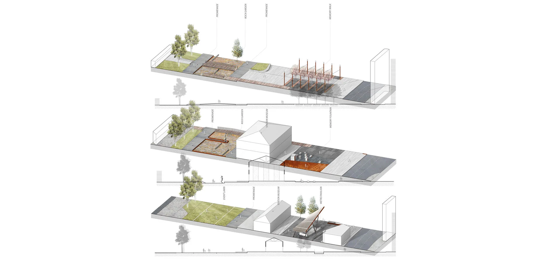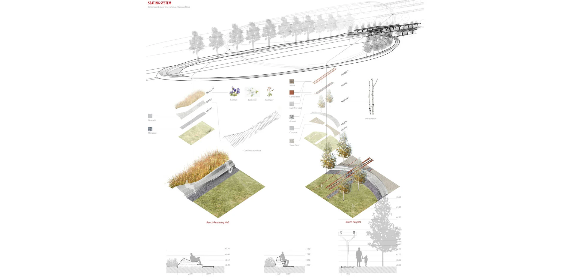 The strategy is using the five character areas of the site to establish a sequential transformation of materiality, and the promenade as a traversing armature to connect the park with its urban context.
