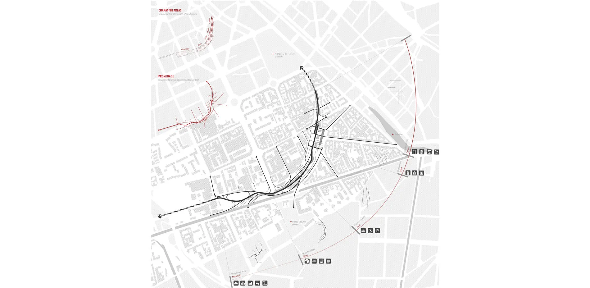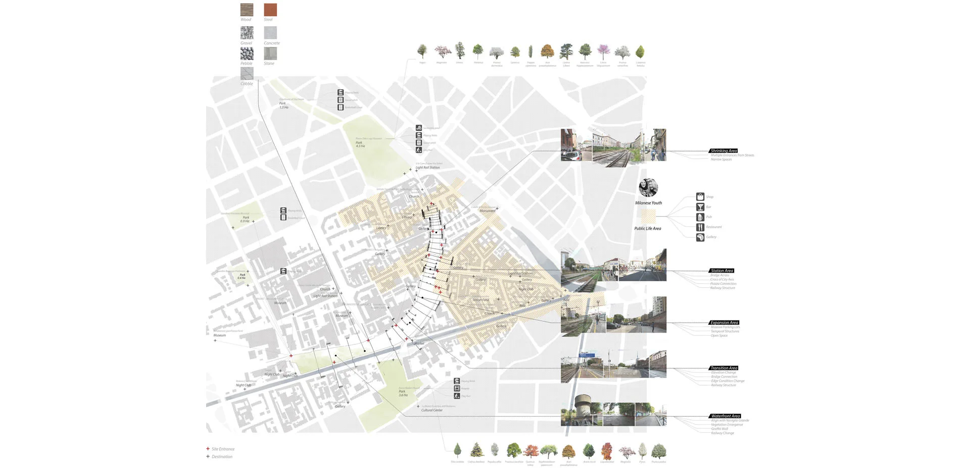 The site is located in the original Milano Porta Genova railway station area in the city of Milan. The 13-acre site is proposed to be a new urban park instead of its original transportation function. In order to transform the blank space into a new vibrant public space and reconnect the site to the urban context, the design proposal mainly focused on creating a place with a new identity and breaking its surrounding barriers. Design Manifesto