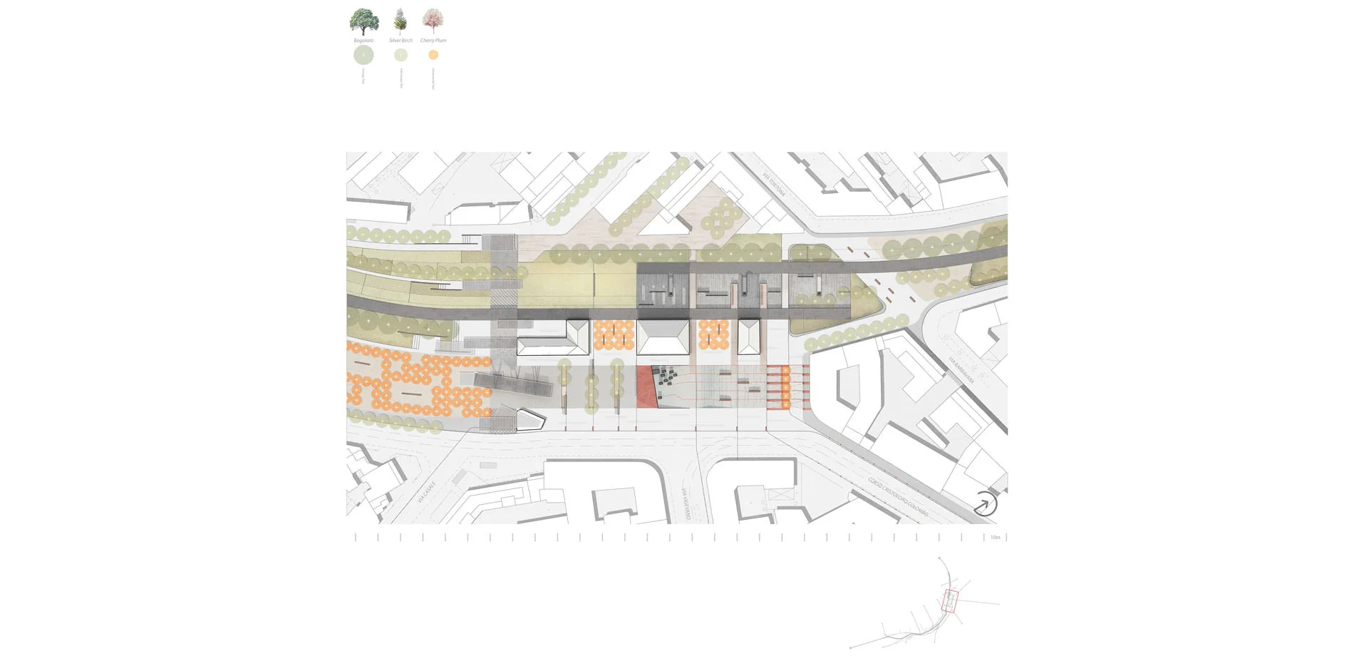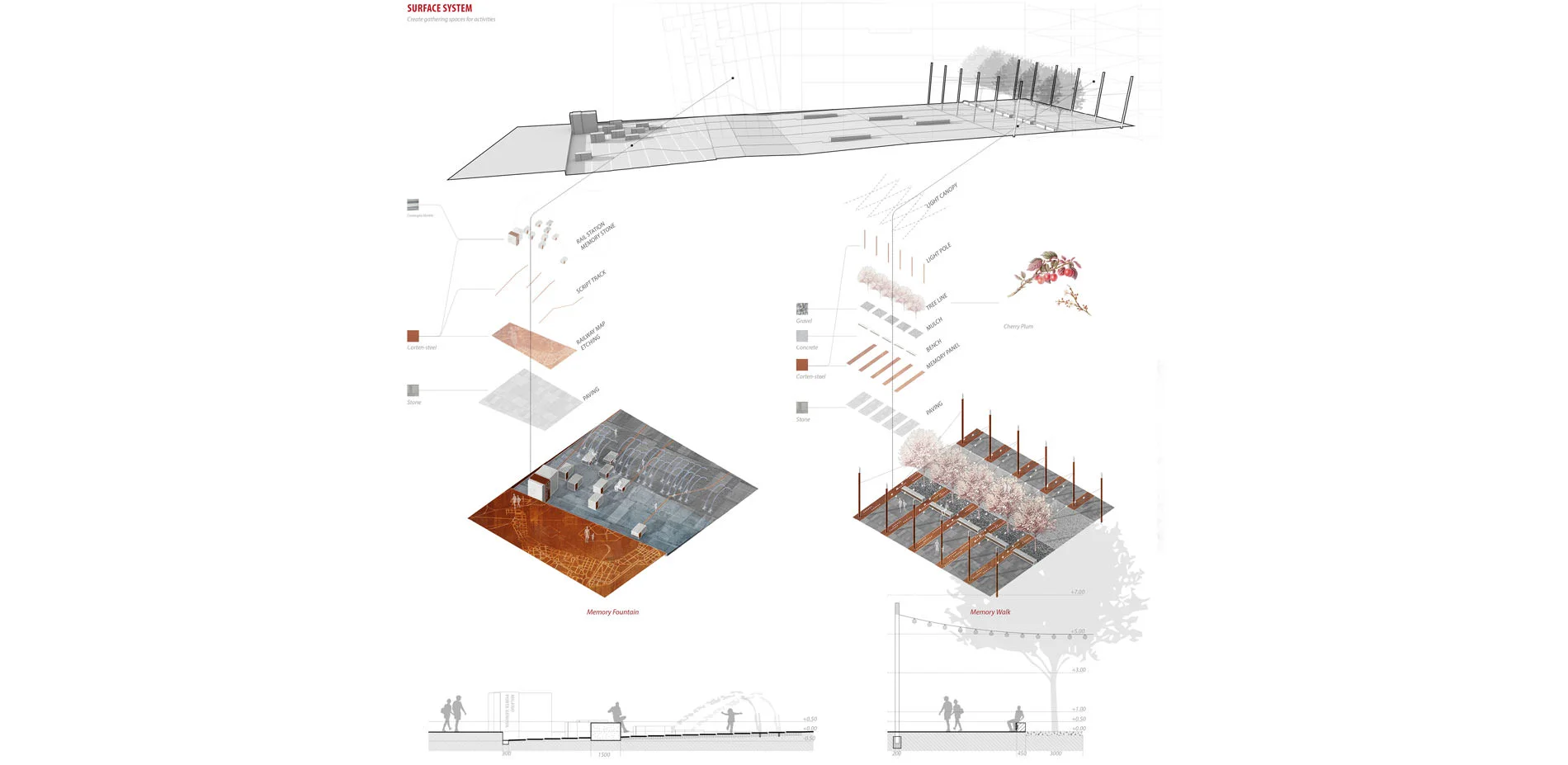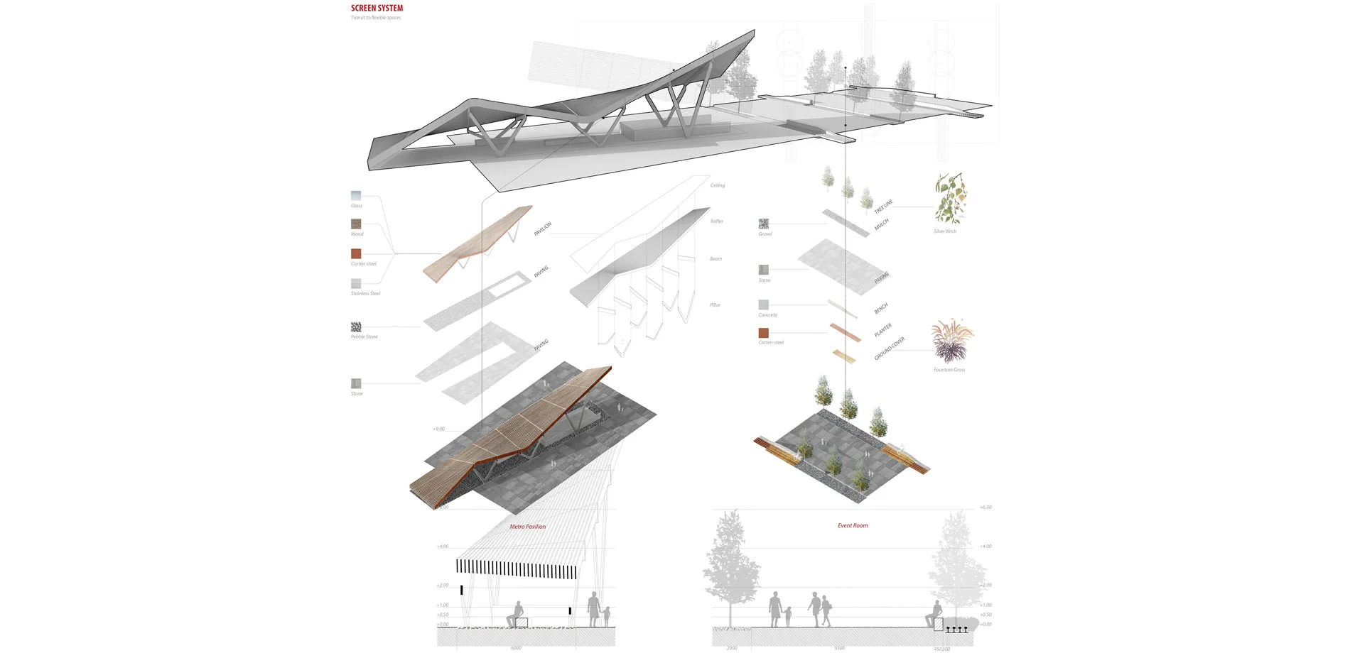 The existing waterfront area is a flat open space fenced by the wall and straight canal bank at the south side edge. A path system is designed to collect people from different directions and orient people along the promenade, creating open space for public activities. The open space’s edge is defined by meadow mounds and dense tree grids, while the canal bank is constructed to be the terraces down to the canal, creating waterfront recreation area for people and habitat for birds. The existing railway station building strictly separated the existing space into two parts. Meanwhile, a lot of traffic is going on in the piazza in front of the building. The strategy is to demolish some part of the building to provide opportunities for connection. While two signature gardens are proposed on east and west side of the building to display artworks produced in the adjacent art & fashion district, and also to memorize the railway station which will stop functioning in the future. They are stitched with paving and decking structures across the building. In addition, the existing metro and tram systems are composed at the edge of the piazza to be a transition system, orienting people into the new proposed piazza.