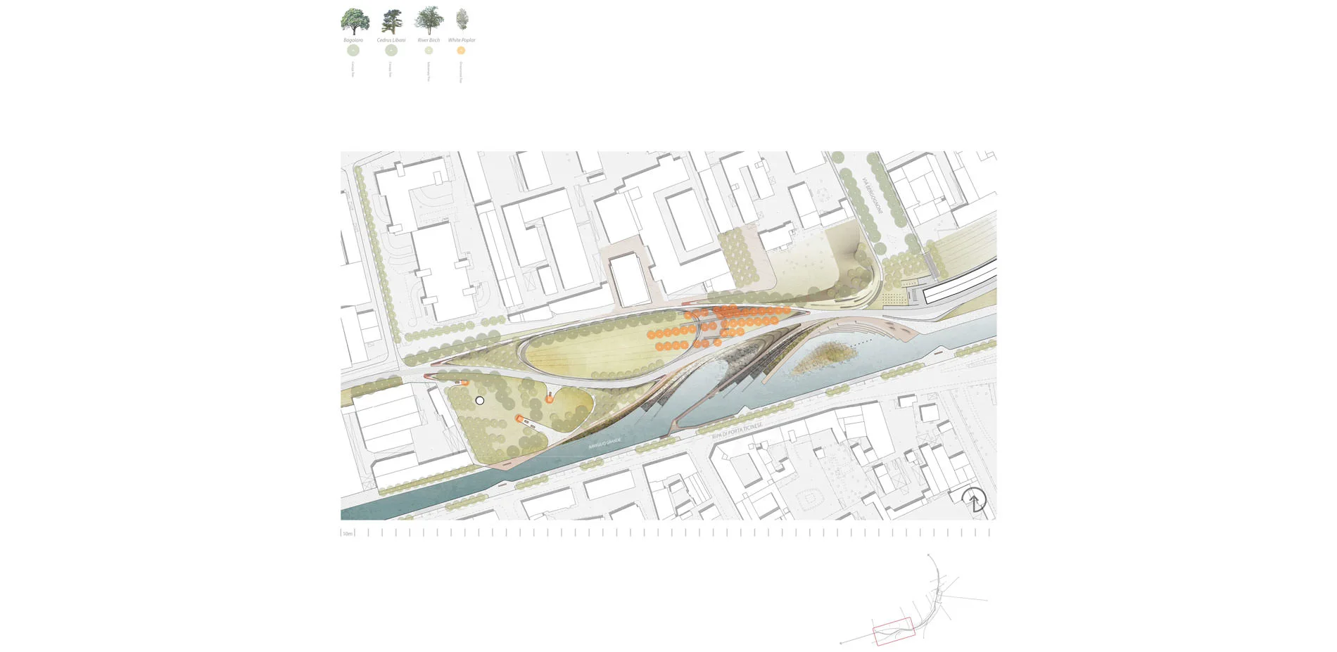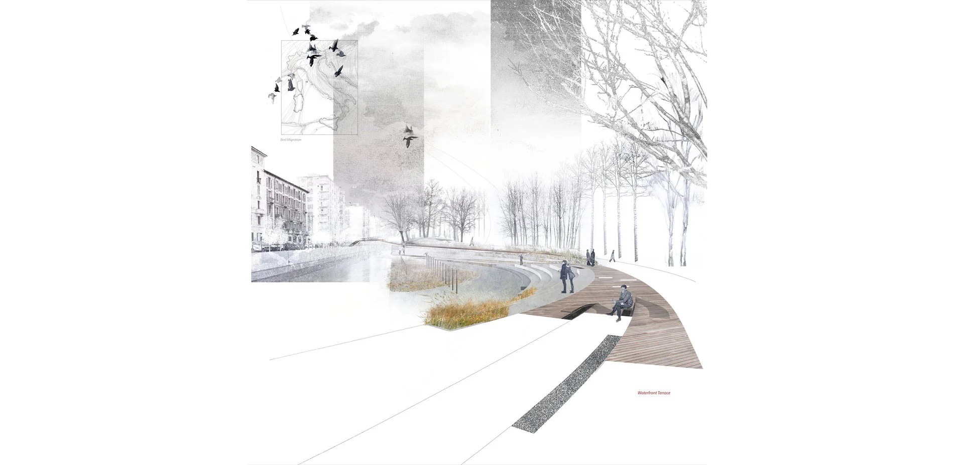 The design for the new urban park proposed to integrate the regional landscapes of Milan along the original infrastructure as a sequence into the park, orienting people to experience the transition of the native landscape. While people traverse through the site, they will be informed with the transformation of the materiality, which reflects the construction of the city of Milan over time. Aiming at revitalizing the urban area and enriching the ecologic diversity, the design provided convenient public access, flexible open space, and different types of habitat throughout the whole park.
