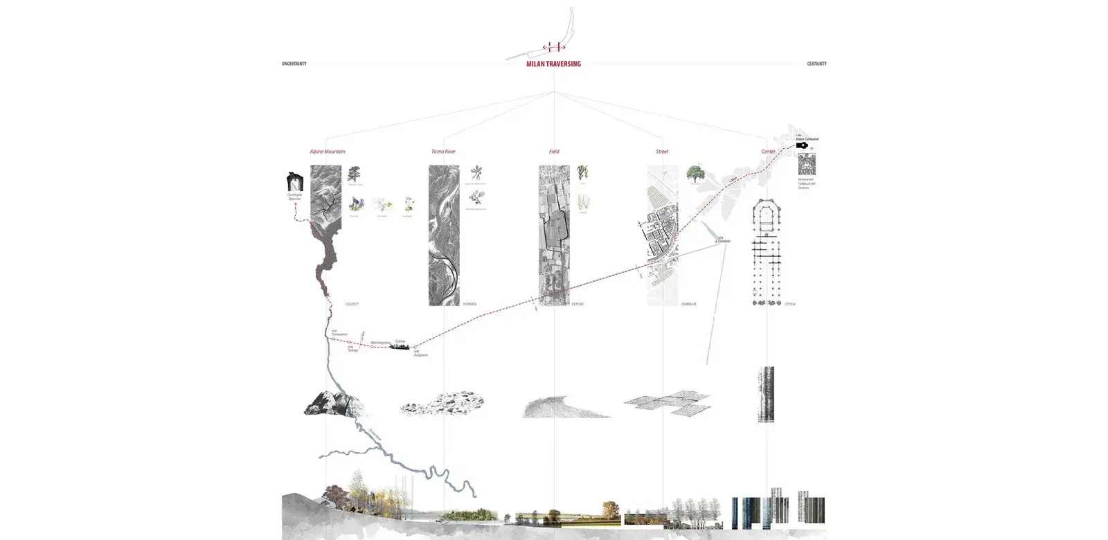 The trajectory of the Candoglia Marble, being extracted from the alpine mountain, transported through the Ticino River and Naviglio Grande, and finally constructed into the Duomo at the center of Milan, is basically a transect across five character landscapes in the region. It also reflects how the Milan city being built within the transformation of the regional landscapes. While people traverse through the route, they will experience different spatial and material conditions from uncontrolled to structure. Therefore, the design intended to compose the five regional landscapes into the site as a sequence for people to experience the transition of the native landscape. Design Strategy