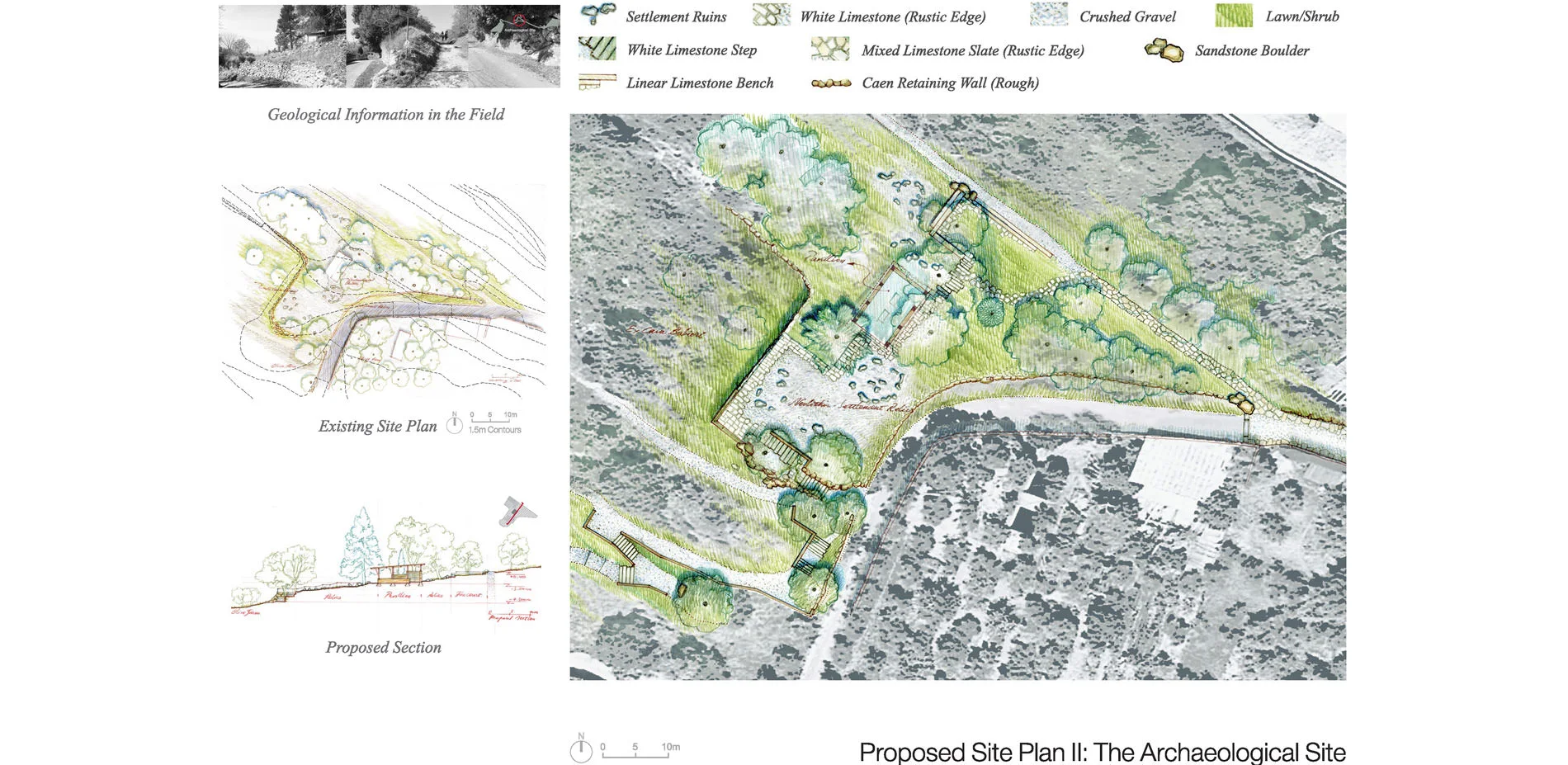 From the medieval church to the Neolithic archaeological site, an experience through an olive farm is organized to connect the two sites and exclude the vehicles. The concept is to create a path on the edge of the archaeological field and indicate the material information of historical quarry and Neolithic settlement through volcanic rocks and limestone pavers at the entrance. On the section, the experience is edited by inserting two mood-shifting fore courts before stepping into the archaeological field.