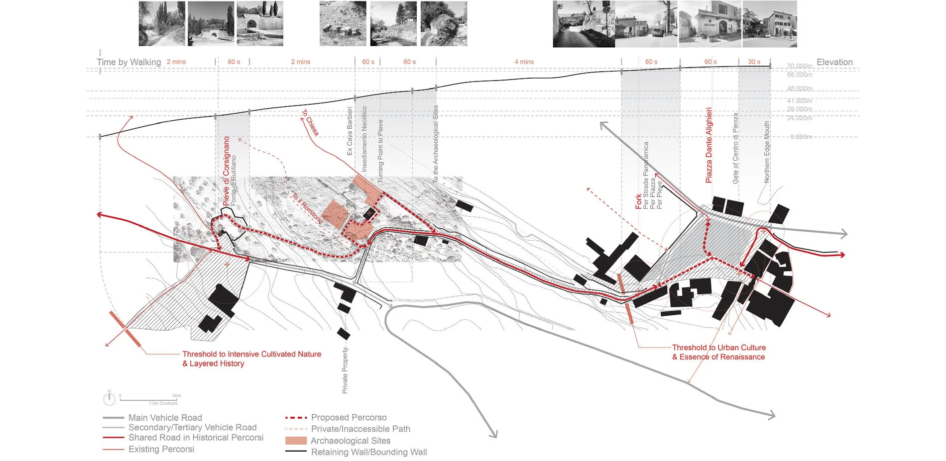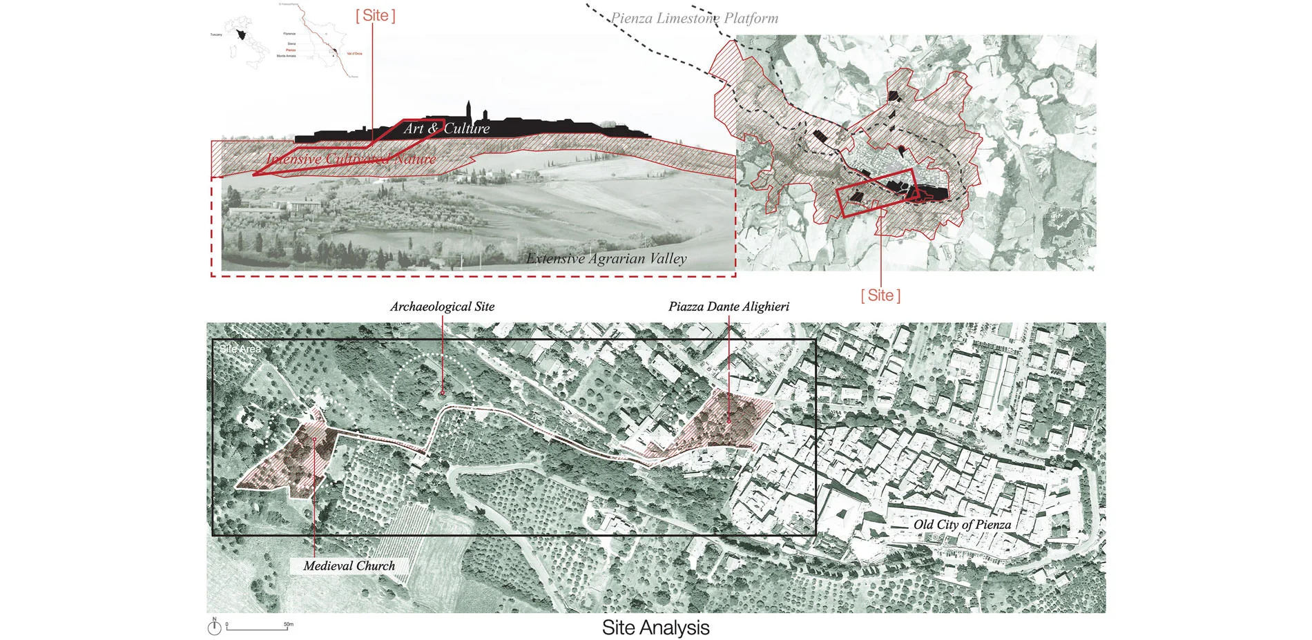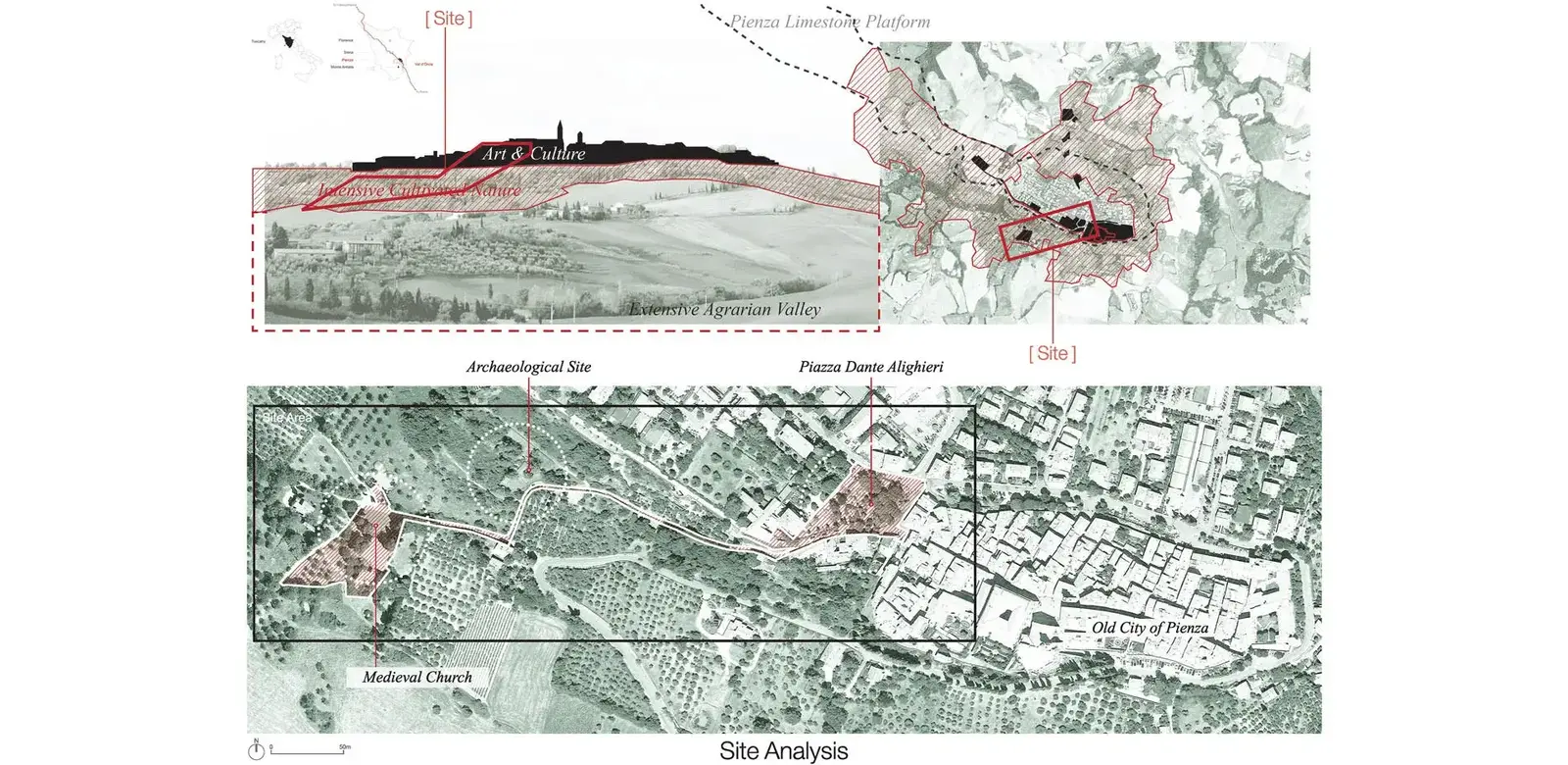 The latest UNESCO reports of world heritage have highlighted the preservation of Pienza in a crucial relationship with its surrounding multi-layered landscape. The project site is situated on the limestone platform of Pienza, with a transitional landscape between the urban hill top and the agrarian valley. This landscape through the percorsi demonstrates a humanistic variety extending from urban artifacts, intensively cultivated hill, to the vast agrarian valley in Val d'Orcia. However, the multi-layered history of Pienza is only preserved within every historical site boundaries, and the existing percorsi are used as a shared asphalt road, which overlooks the continuity and legibility among the historical sites. Therefore, I argue a need to conserve and articulate the historical percorsi as a walkable transect through the multi-layered landscape and history in Pienza.