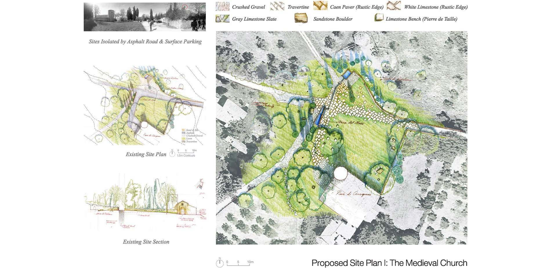 In this site, the historical artifacts, which include a medieval church (Pieve di Corsignano), a fountain (Fonte di Rutiliano) and a relic of Vasca del Morto, are isolated by an asphalt shared road. Despite a limit of vehicles on the road, the space in front of the fountain is used as a surfacing parking area for tourists. The concept is to integrate the three sites by repaving the field with rustic Caen stone paver and white limestone to give priority to pedestrians over vehicles. The Caen stone adopted in paving and seats is a response to the typical stone mass used on the church and the fountain in this site. Relying on the existing topography, a water ditch is designed as a linkage between the fountain and the overlooked relic, Vasca del Morto, in order to amplify the genius among the isolated artifacts. In addition, some standstone boulders are settled on the site to give an implication of the geology in the region. The Archaeological Site: Ex Cava Barbieri and Insediamento Neolitico (Old Quarries and Neolithic Settlements)