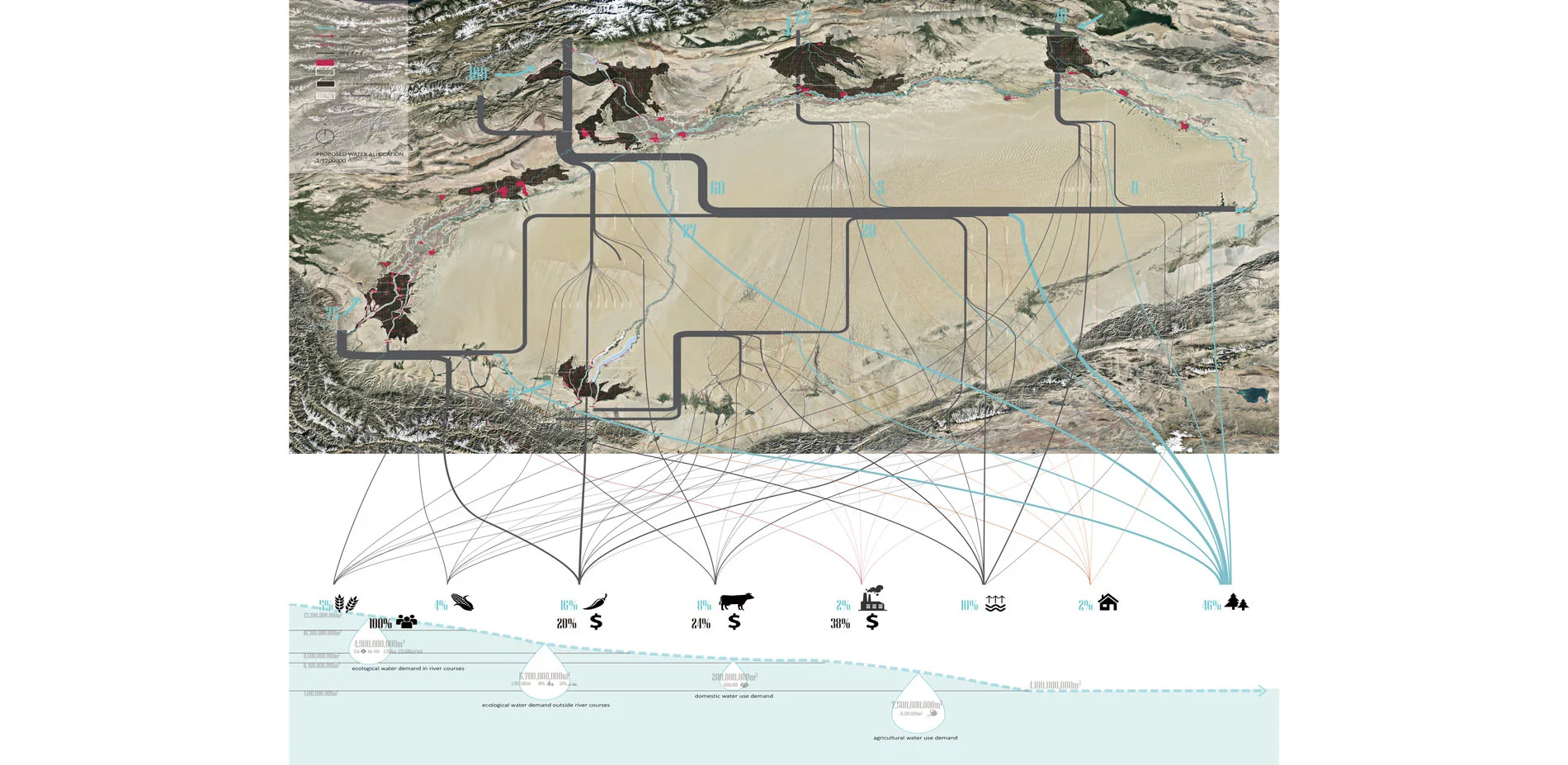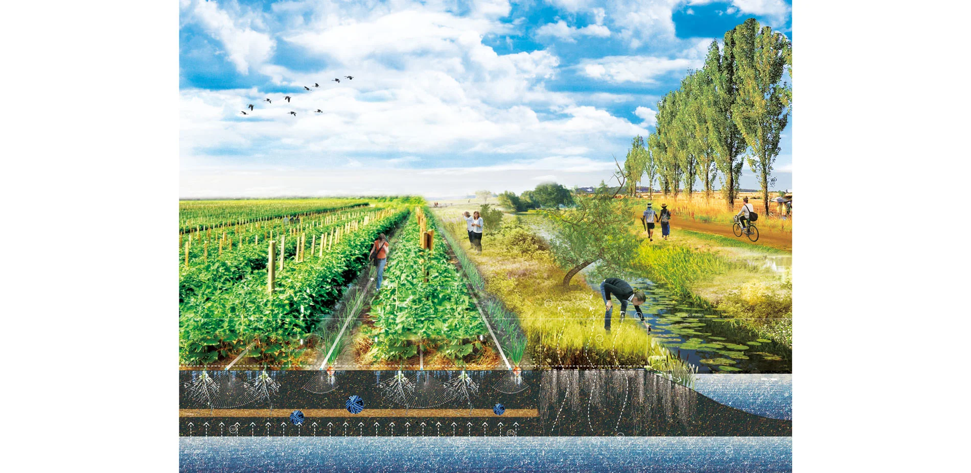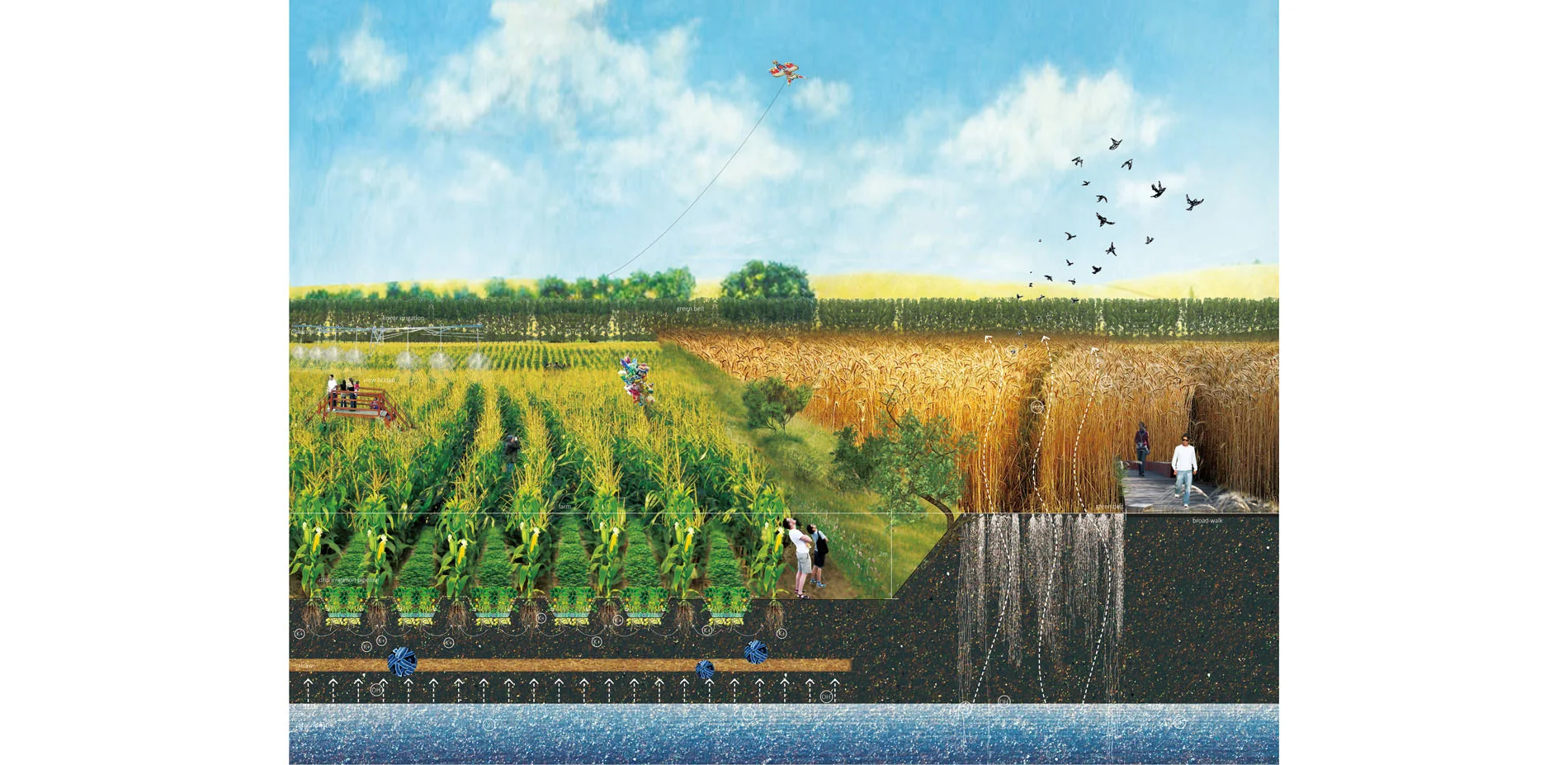 For the planning strategies, the 1st one is to build a store-release system. A series of underground reservoirs will be built along the seepage zones near the mountain. Working with reservoirs along the river, they’ll store extra water in flood seasons to recharge the riparian ecosystems and irrigate farmland in drought seasons. The 2nd one is to build a water-saving system. Grey water reuse strategies will be applied in settlement areas, and water-saving and high productive agriculture will be applied in large farmland matrix to save water and promote economy. The planning makes possibilities to connect the tributary to the river again.