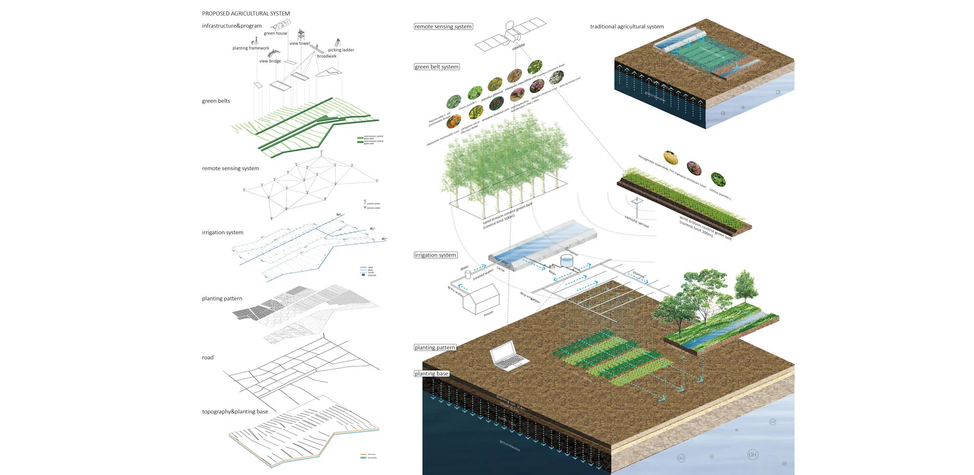 Zooming in the site, one of the farmland units in the planning site was selected to explain how the water-saving and high productive agriculture performs. Farms in the region is country-owned. The traditional agriculture applies flood irrigation, covers plastic film to reduce evaporation and plants crops with low water productivity, but just brings low income for local people. And only 43% of irrigation water is used to irrigate crops, other 57% is wasted. A considerable amount of water is lost by evaporation, runoff, subsurface drainage, wash salty soil, but not for crop production. Such loses of water from agriculture have major implication for not only to crop production, but also to movement of nutrients from agricultural fields to riverine environment and groundwater system. Any improvements in water use efficiency in agriculture increase the amount of water available for down steam users. Several strategies were applied on the site to deal with the water waste. They’re to apply water-saving irrigation, plant high water productive crops, build green belts, cover remote sensing system and apply intercropping planting method.