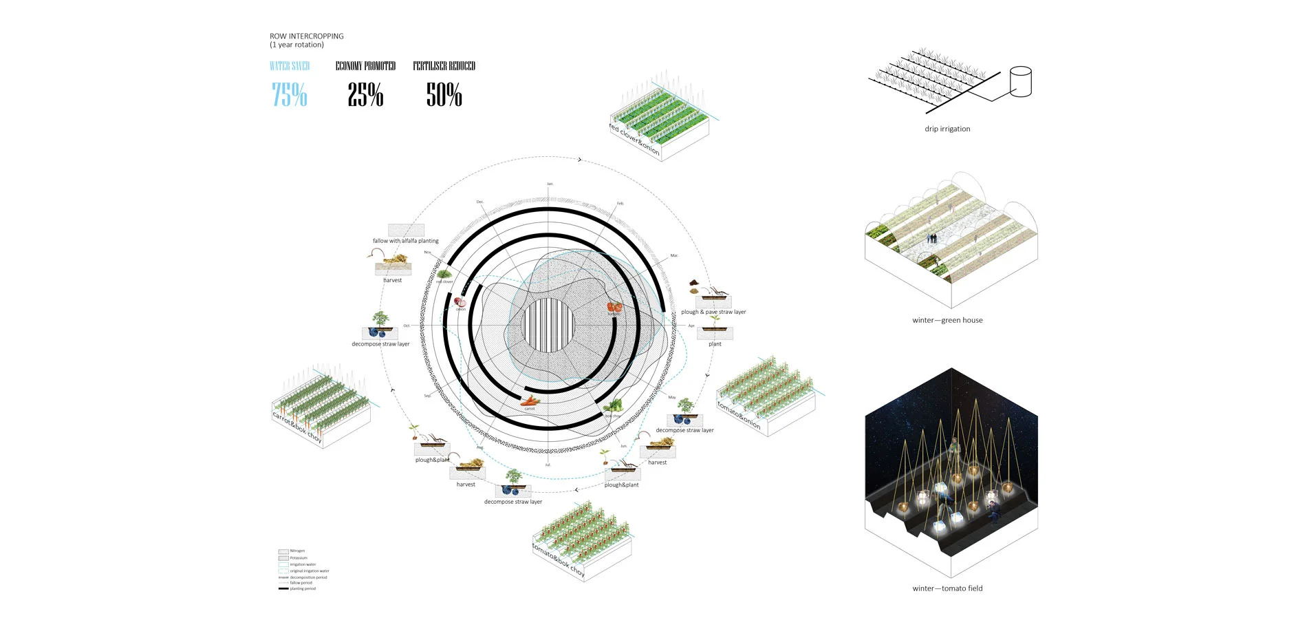 One of the row intercropping typology designed on the site is tomato, bok choy, carrot and onion intercropped in a 1-year crop rotation. The straw layer is paved and then decomposed on the field in the rotation, and the field will be fallowed with red clovers in the winter. Drip irrigation is applied in this type of intercropping. Onions can reduce pesticide applied to the farm. This type of intercropping can provide various programs for local people in different seasons. In this type, 75% water can be saved, economy can be promoted 25%, 50% of fertilizer can be reduced compared with the traditional agriculture.