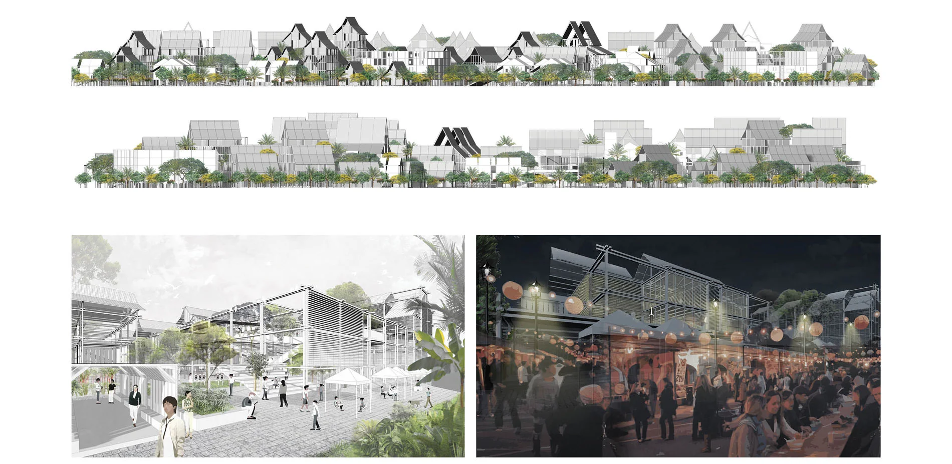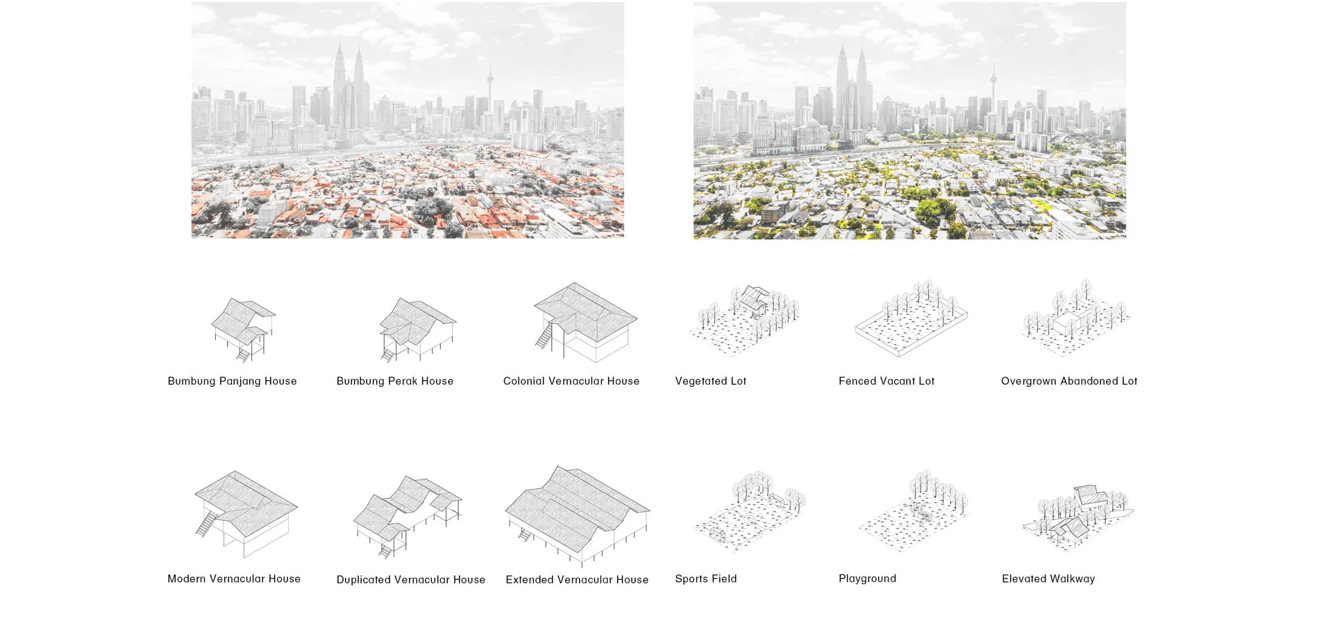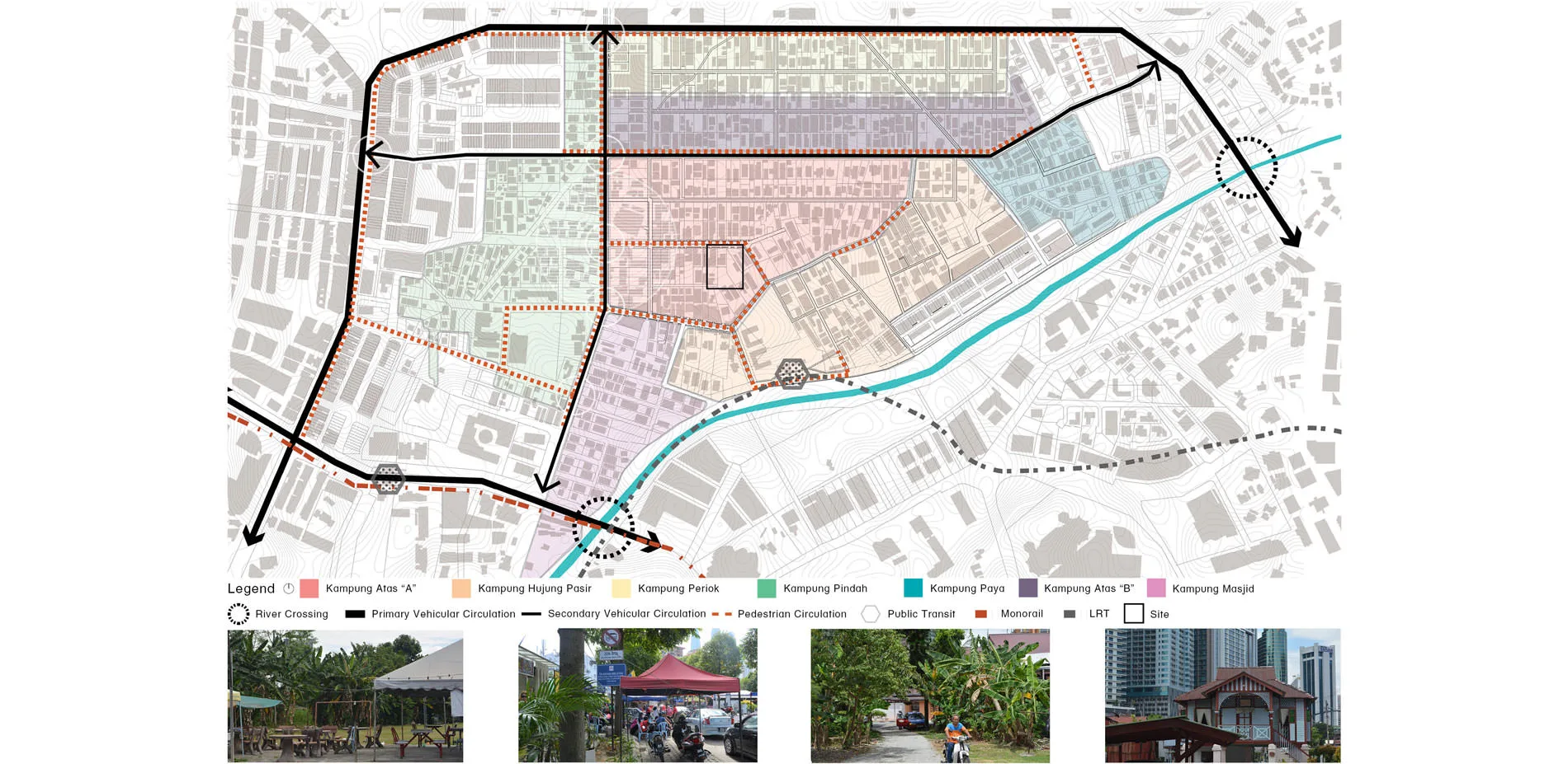 Through an analysis of the current and historic issues, along with the aspirations of the city through various master plans and schemes, the projects posits a new form of micro-infrastructures that would encourage community participation and counter the towering developments that are constricting Kampung Baru. Lacking a public space, this project aims to address the need of public space by utilizing the vacant lots and green spaces with each village of the community. These public spaces could host the meetings of each village and allow for an intimate neighborhood-scale space where residents could rest during the day, gather at night, and adapt to the everyday needs of the users. Each village would have an opportunity to make their potential public spaces into bespoke and unique anchors of the community. These spaces would help to capitalize on the distinct cultural identities of the people, their houses, and the the surrounding landscape.