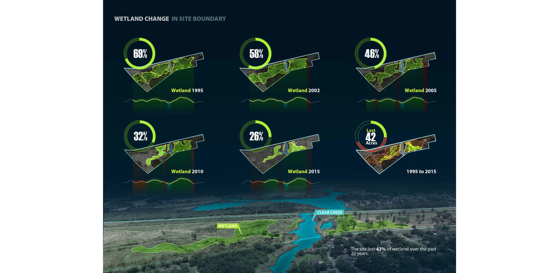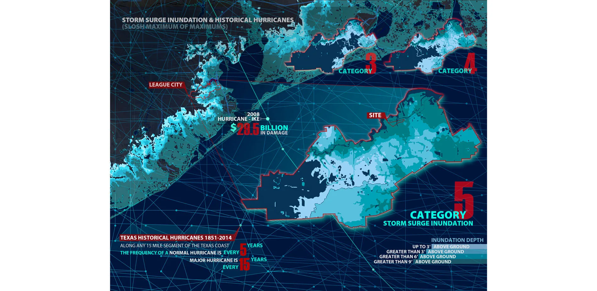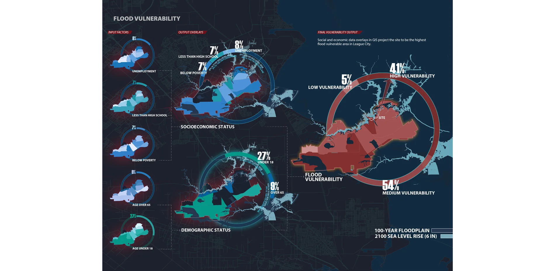 Flooding and hurricanes are major concerns along the Gulf Coast. The frequency of a normal hurricane along any 50-mile segment of the Texas coast is one about every 5 years, with a major hurricane occurring nearly every 15 years. The design site will be significantly inundated by storm surge from hurricanes from Category 3 and above. Relatedly, sea level rise will increase the vulnerability of coastal communities to hazards such as flooding and hurricanes. By 2100, nearly 50% of League City projects to be covered by the FEMA 100-year floodplain, should a 6 feet sea level rise occur; 76% of the land on the design site will be effected, and the entire site is covered by the 500-year floodplain. By overlaying social and economic raster data sets in GIS to map factors contributing to flood vulnerability, over 41% of League City projects to have high flood vulnerability, and the site rests as the highest flood vulnerable area in the city. In regards to the catastrophic damage these conditions have had on ecosystems, nearly 96 acres of freshwater wetlands and 154 acres of wetlands in the region have been lost since 2008. The design site has lost 43% of its wetland area in the past 20 years.