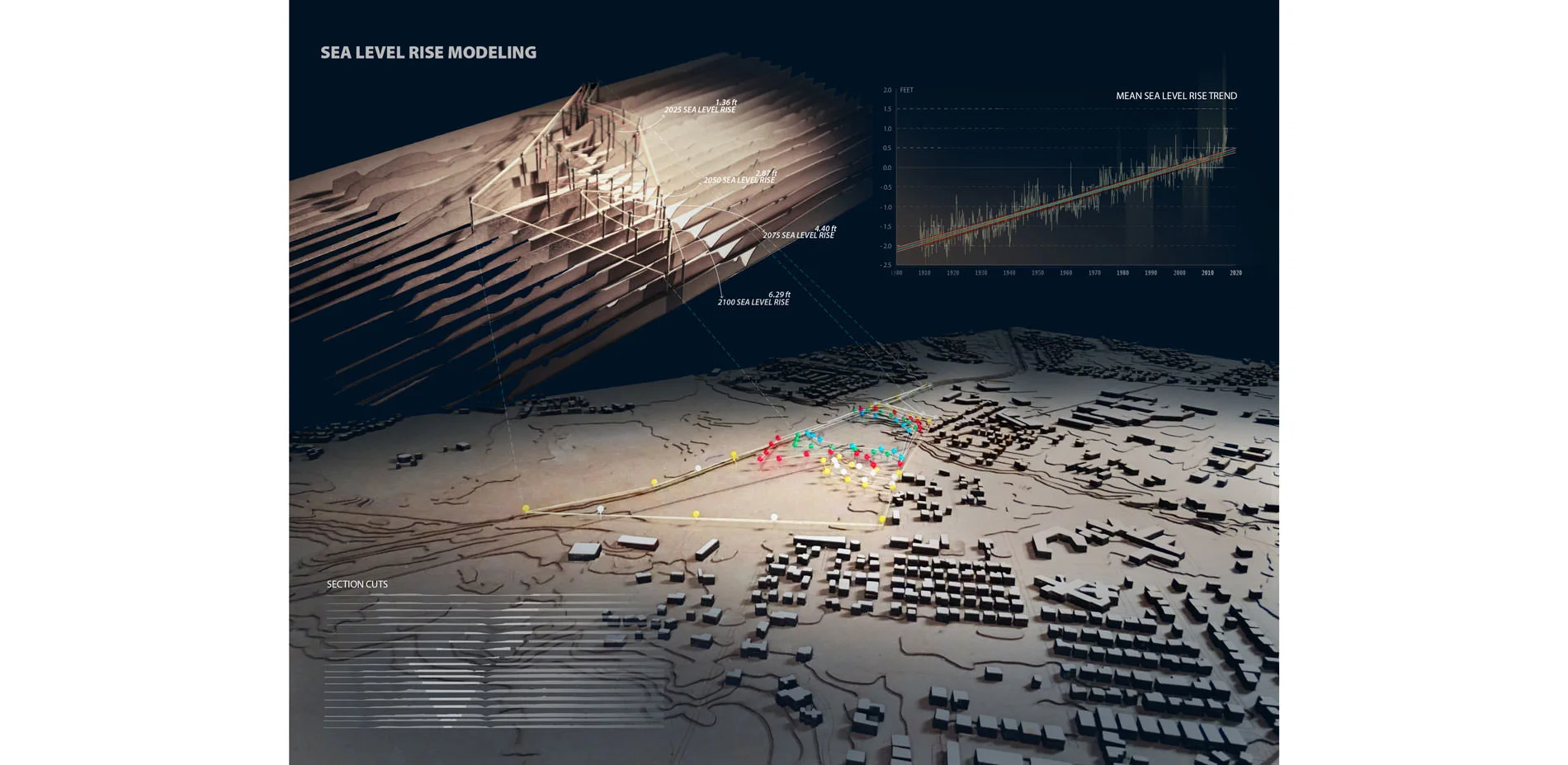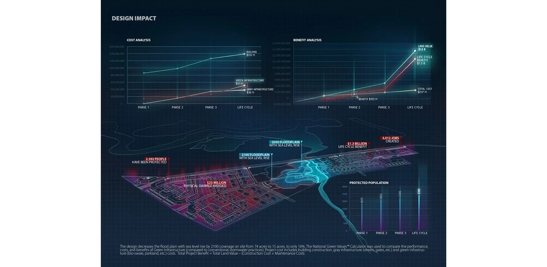 The Climate Change Armor facilities not only create economic and ecological benefits, but also create enormous cultural and social benefits. With its application, the design decreases the 100-year flood plain by year 2100 with sea level rise from 74 acres to 15 acres (from 76% coverage to only 16%). Also, the nearly 2,400 new residents are protected, over 3,000 jobs are created, around $23 million in physical damage is avoided, and nearly $1.3 billion are generated by the life cycle benefits by 2100.