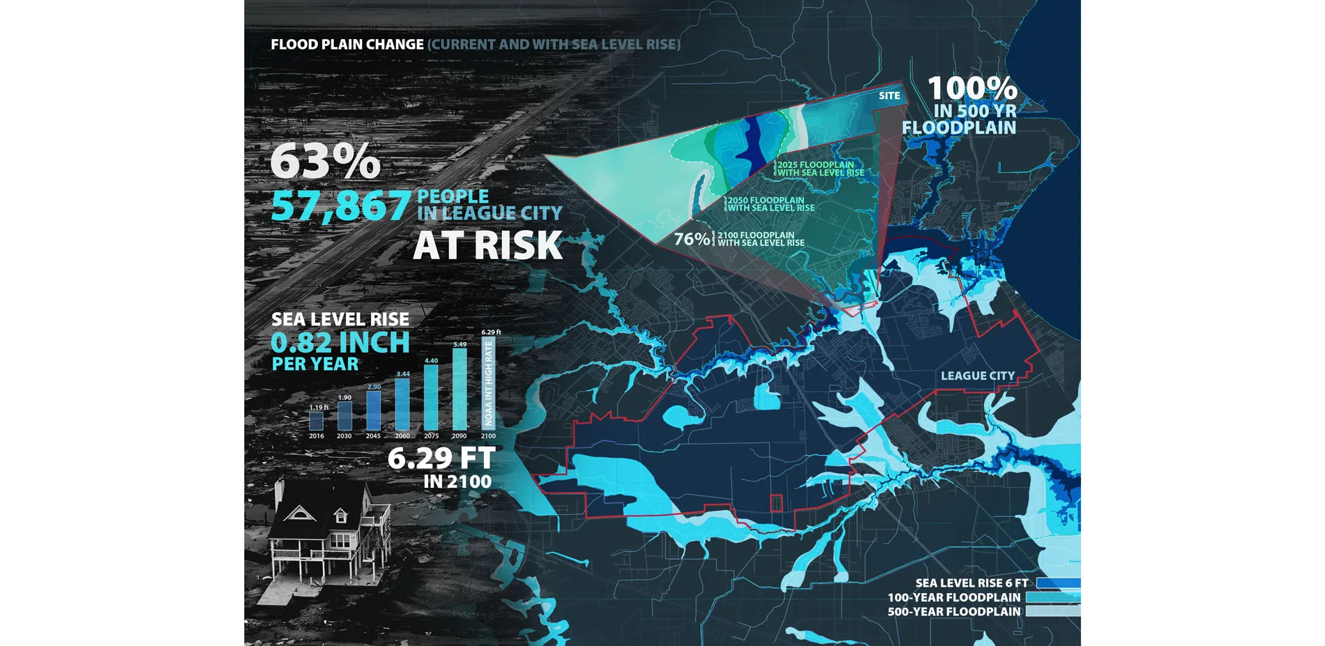 Due to its location, League City is exposed to many hazards and is highly vulnerable to flood events and other issues effected by sea level rise. This project designs a resilient community within a 97-acre site surrounded by urban development in League City. The site is currently planned by the city to grow as mixed-use and auto-dominated residential urban low-density development. The objective of this project is to design a community that is fully protected from current and future flood events and the eventual impacts of sea level rise, thereby reducing physical and social vulnerability.