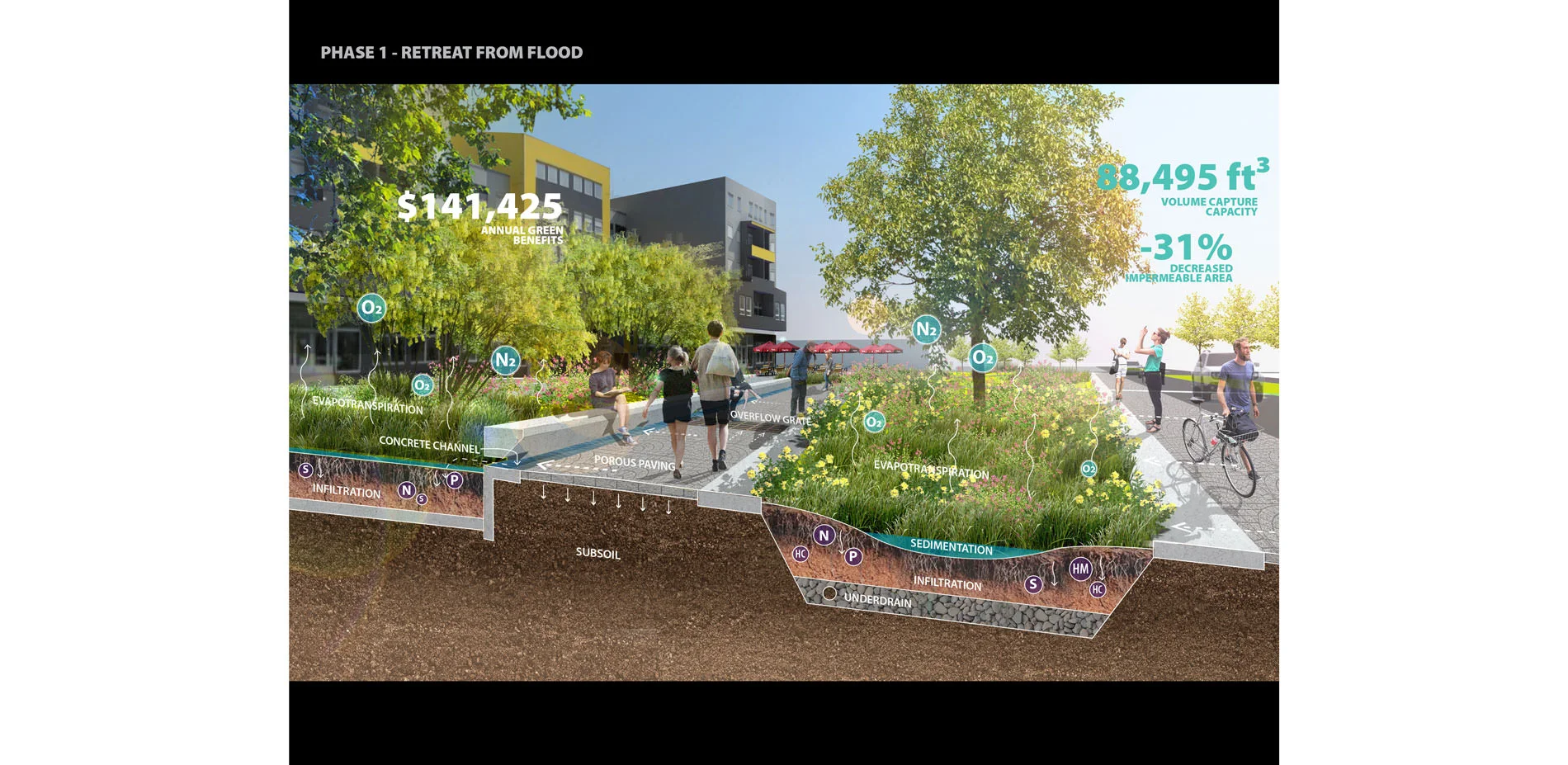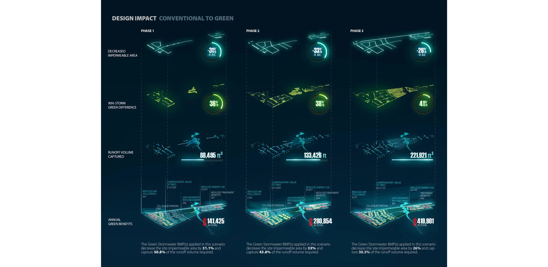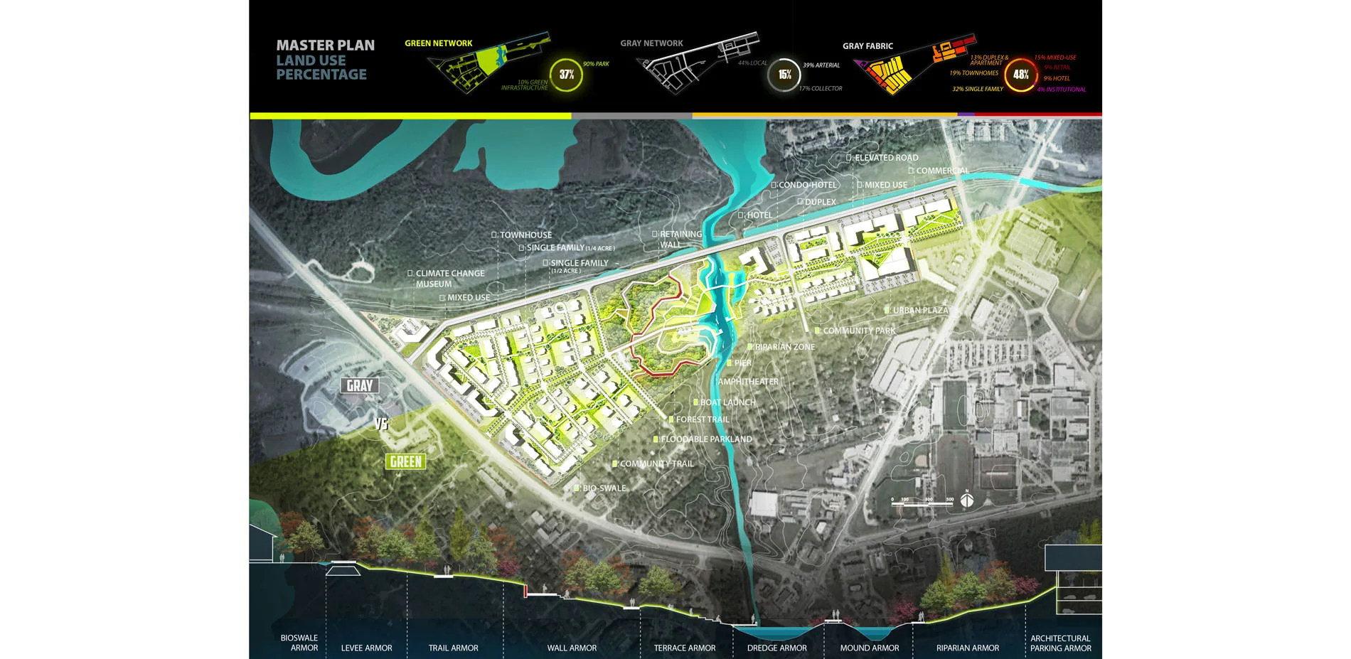 The structural and non-structural armor typologies are strategically applied throughout the site into the green and gray network/fabric, to protect residents and deliver valuable both ecological and economic benefits. The National Green Values™ Calculator was used to assess the performance, costs, and benefits of the green infrastructure utilized within the design. Compared with conventional approaches, the Green Stormwater BMP(s) of the design decrease the site impermeable area by 26% and capture 30.3% of the runoff volume required. Simultaneously, the design can capture 221,921 ft3 of runoff, creating $419,901 annual green benefits by reducing air pollutants and energy use, providing pollution treatment, increasing carbon dioxide sequestration, escalating the compensatory value of trees, and improving groundwater replenishment (the economic benefits of these benefits by 2100 reaches $13,305,657).