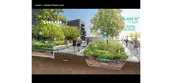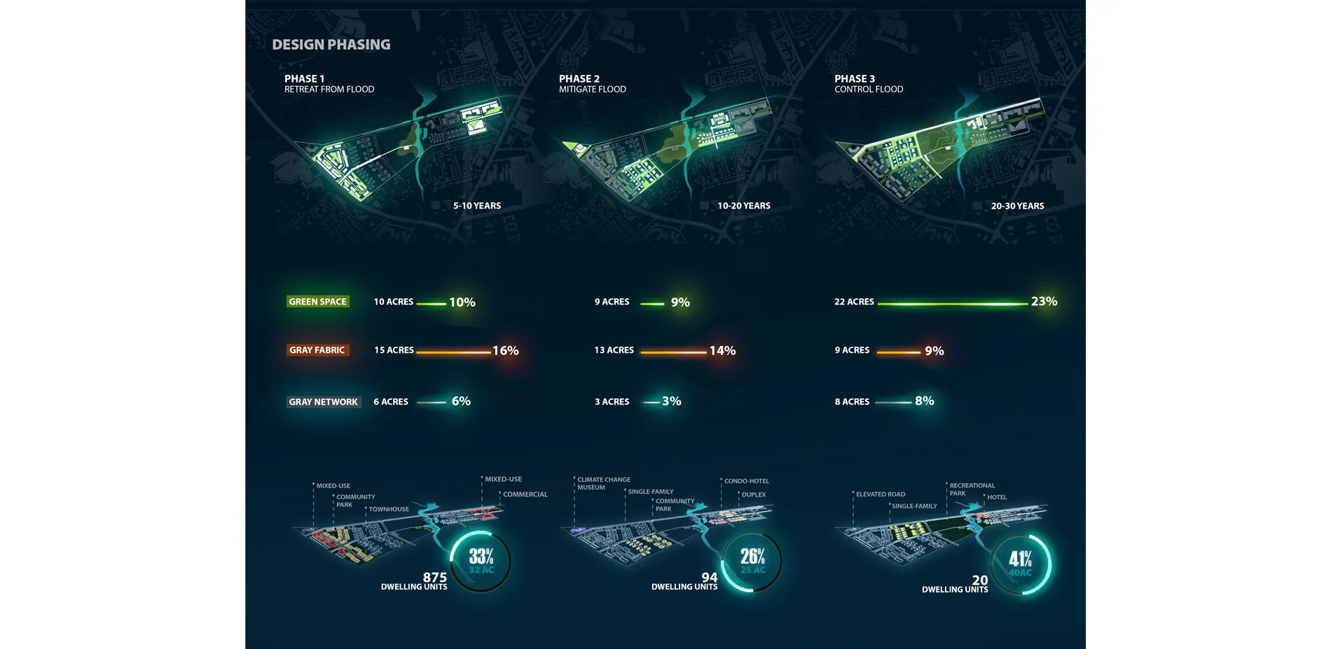 Phase 2) Mitigate flood – develops lower density residences and green infrastructure to provide protection during frequent storms to and gray infrastructure to mitigate larger flood events. Diverse housing types bring in residents from different age groups and backgrounds. New institutional land uses such as a climate change museum provide engaging and educational opportunities for communities.