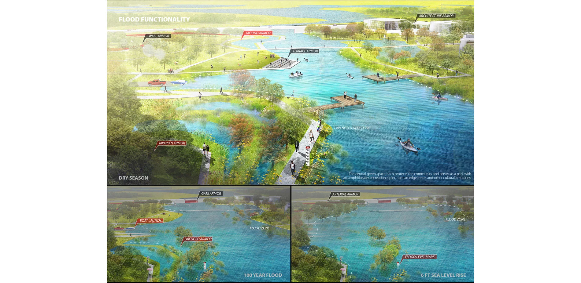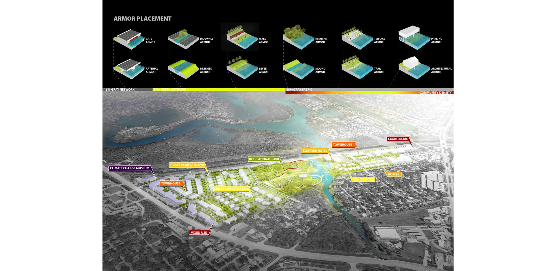 The Climate Change Armor Toolkit’s mechanisms are applied throughout the site, and together compose a solid armor to defend the site from current and future flood issues while simultaneously providing recreational, housing and economic opportunities. The designed green space bordering Clear Creek both protects the community from floods and surge and is designed as a park with an amphitheater, recreational pier, riparian edge, hotel and other cultural amenities. It is connected to the designed green infrastructure system through strategically placed bio-swales, elevated trails and eco-levees; engineered based residential areas, commercial space, and transportation lines also act as multifunctional protective structures to help decrease flood vulnerability.