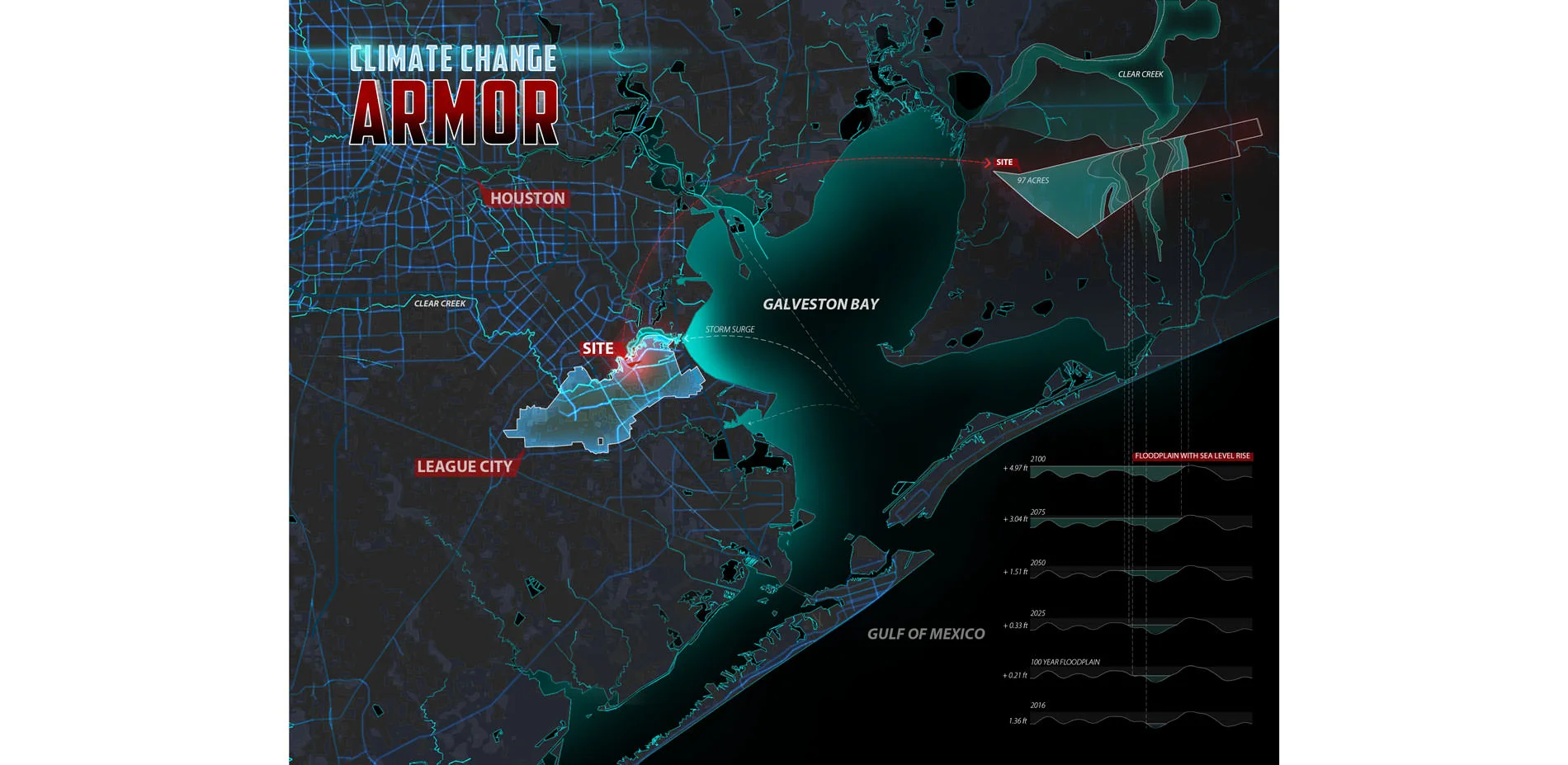 Climate Change Armor is a collection of adaptive flood attenuation mechanisms for protecting newly designed communities from flood events and the eventual impacts of sea level rise. League City, TX is used as an application site. NOAA predicts that sea levels will increase and storm surge will become more frequent along the Texas coast. In the Gulf Coast, sea level projects to rise up to 6.29 feet by 2100. The Climate Change Armor Toolkit comprises both structural and non-structural mechanisms, which are either engineered to block and control heavy floods or rely on natural systems and green infrastructure to attenuate flood waters from frequent storms or hazard flood events. With the application of the Armor Toolkit, 221,921 ft3 of runoff can be captured, nearly 2,400 new residents are protected, over 3,000 jobs are created, $23 million in physical flood damage can be avoided, and approximately $1.3 billion can be generated in the life cycle benefits of the newly designed community by 2100.
