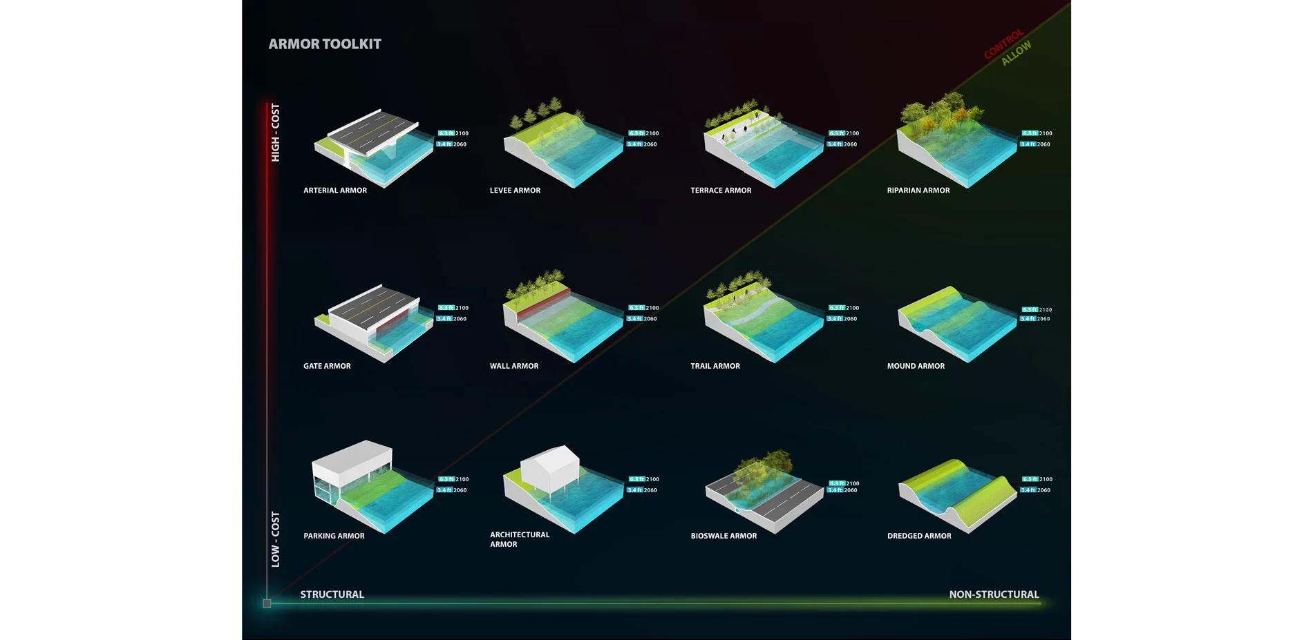 Borrowing from a series of resilient community design cases nationally and internationally, this design develops and incorporates a series of adaptable flood attenuation mechanisms (both structural and non-structural), referred to as the Climate Change Armor Toolkit. Structural mechanisms are engineered infrastructure used primarily to block and control heavy floods. For example: Arterial Armor – an elevated highway which doubles as an integrated flood wall;