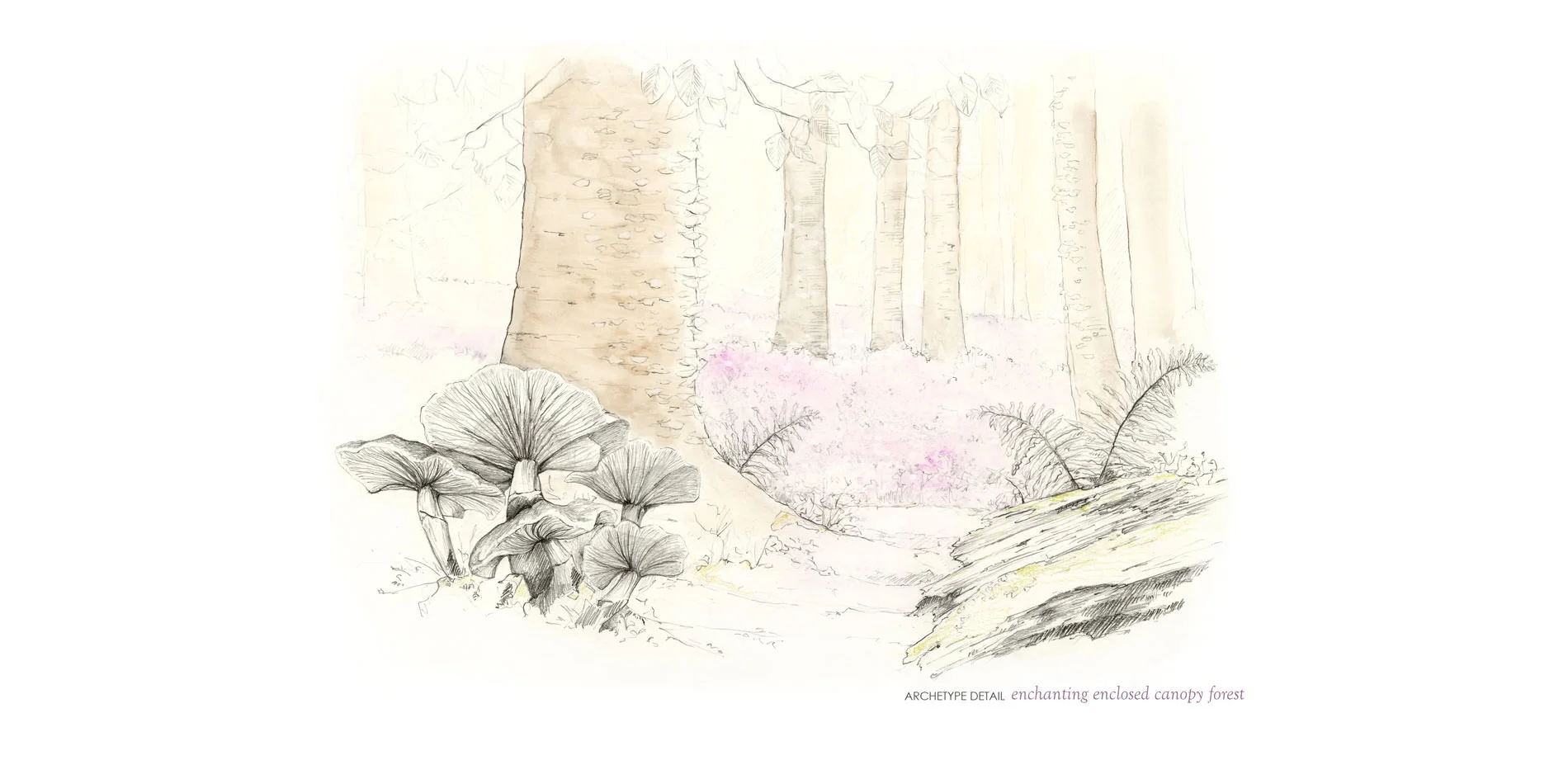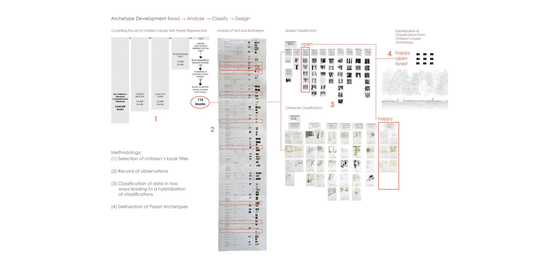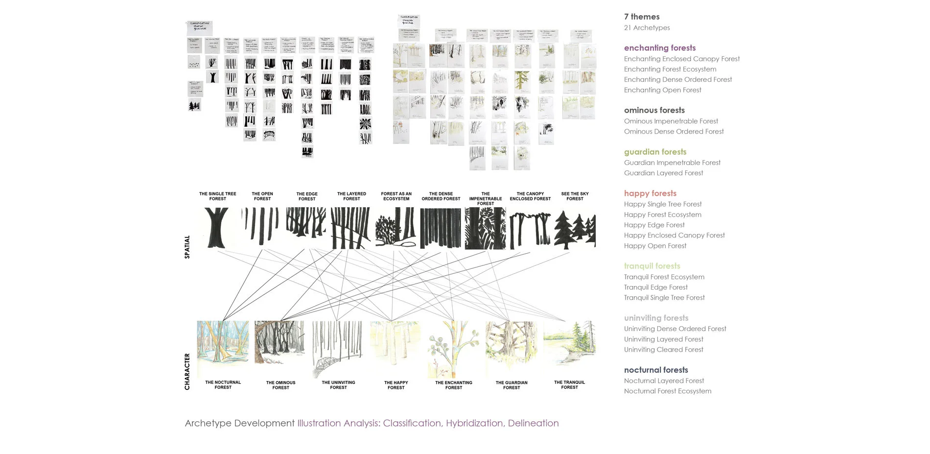 Through the classification process, I recognized that the forest experience is defined by spatial and character qualities of the landscape. Lining up the spatial classifications across from the character classifications, I connected possible hybrid forest types. These results were validated by classifying the 112 books into these hybrid categories. Happy open forests were the most prevalent forest type, followed by: ominous impenetrable forest; uninviting dense ordered forest; happy single tree forest; and tranquil forest ecosystem. If a hybrid type was represented by three or more books, it became a new children’s forest archetype. Through this process, I identified 7 forest themes: enchanting, ominous, guardian, happy, uninviting, tranquil and nocturnal forests embodying 21 new archetypes.