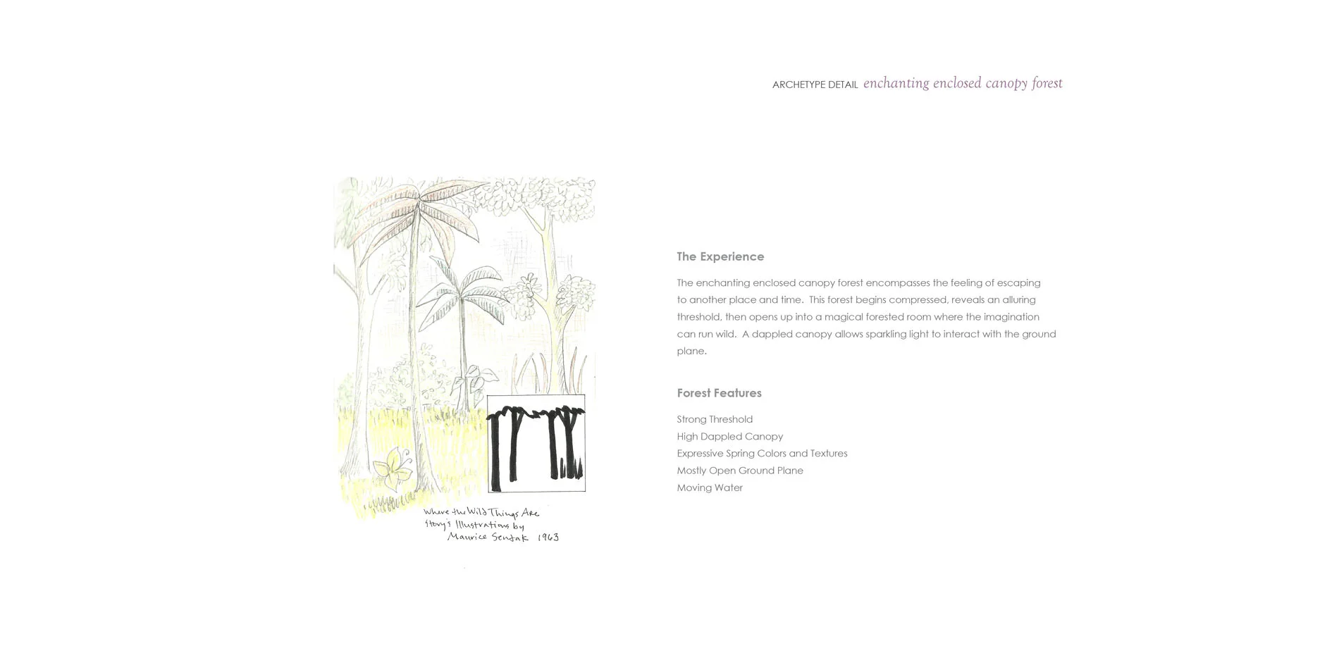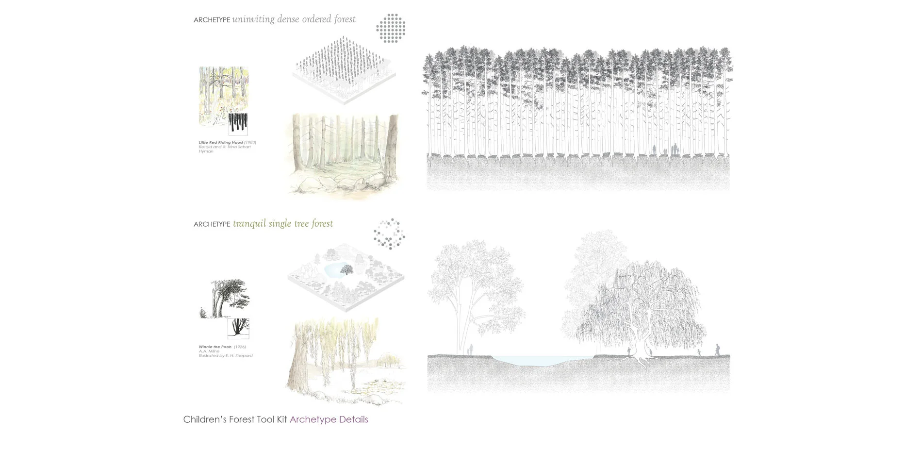 Children grow up with different surrounding environments and form perceptions about forest through means like television, games and books – all of which shape their perception of the world around them. Reading about the great adventures of Winnie the Pooh, gives the perception of a tranquil, friendly forest while Hansel and Gretel, where children are lost in the forest and nearly eaten by a witch, may raise anxieties about the forest. With these simple observations, I was curious what the perception of forest is in children’s literature and how I, as landscape architect, can develop new children’s forest archetypes that can be employed in landscape design that would connect children to the natural environment through these literary experiences.